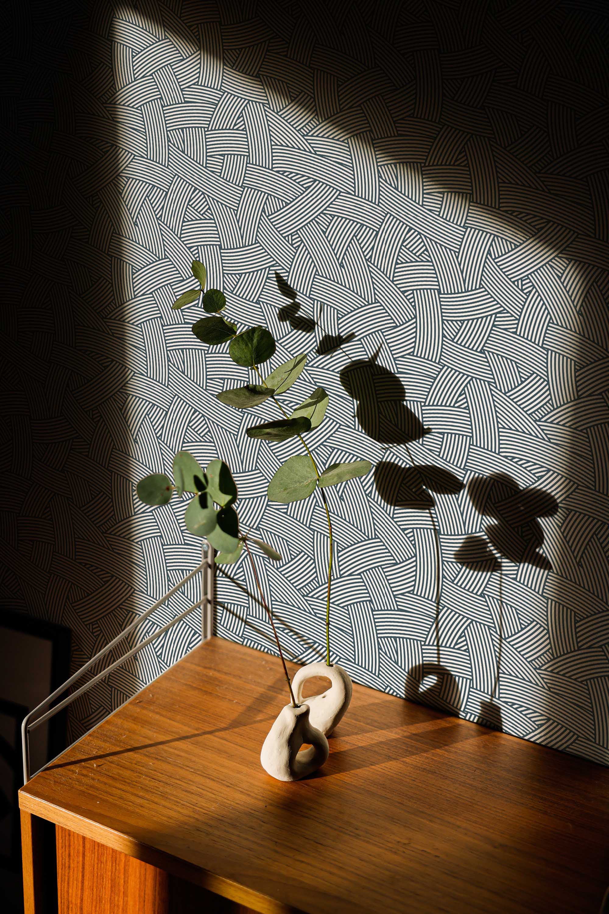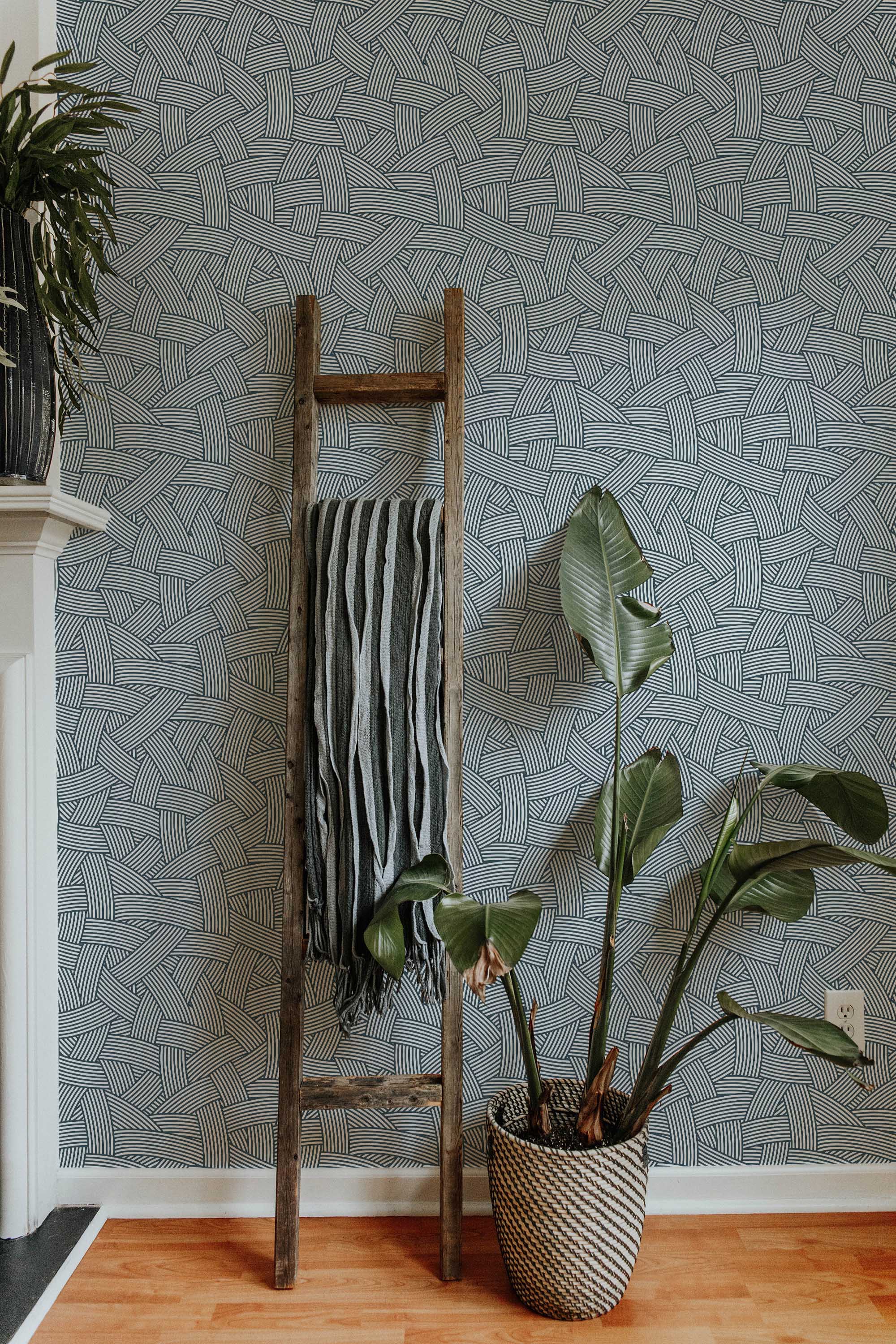 Abstract Strokes Wallpaper brings a modern accent to walls with interwoven charcoal brush strokes arranged in a clean rhythm. Moreover, overlapping lines create a subtle woven effect that adds depth and movement while keeping the look calm and contemporary.