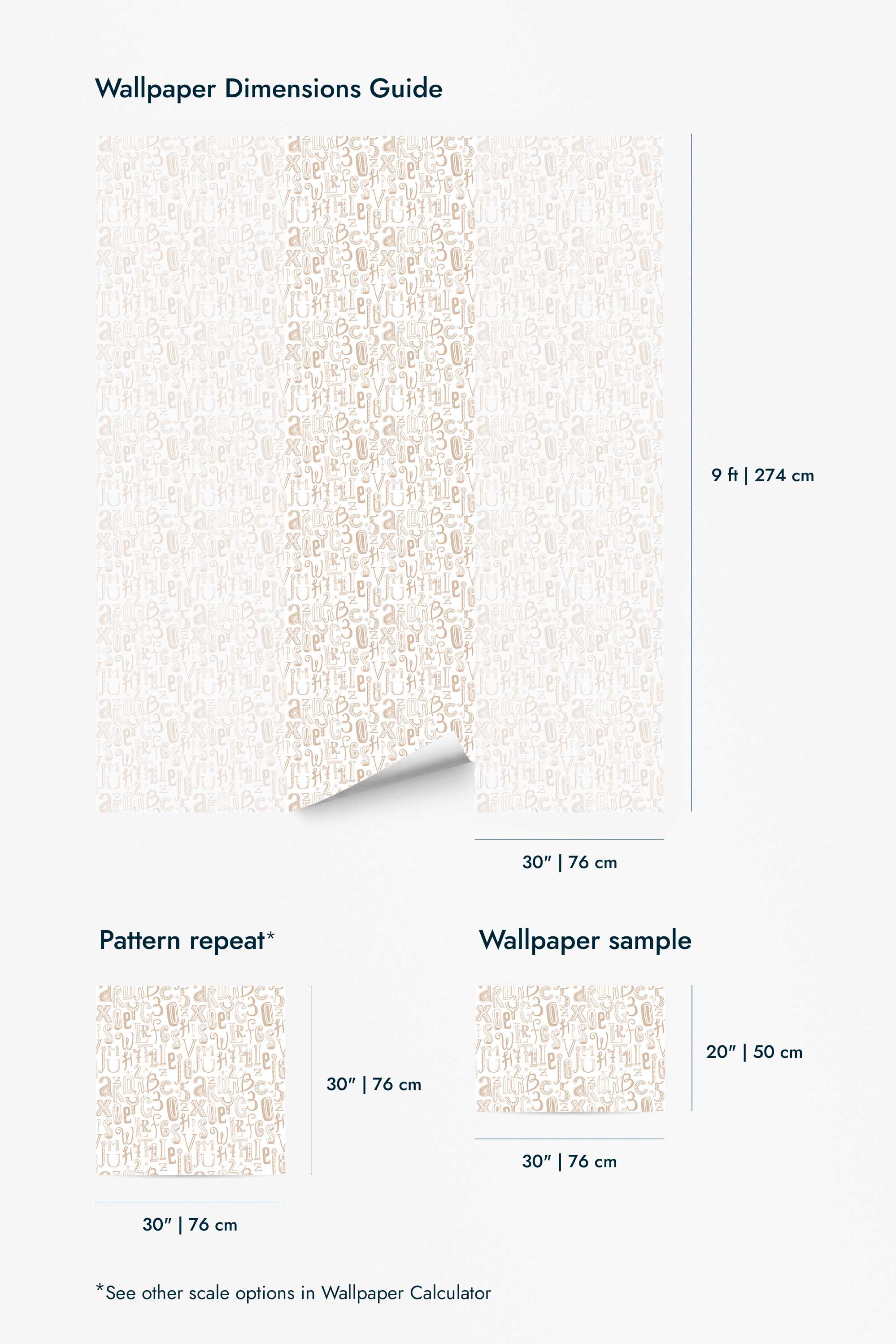 Alphabet wallpaper brings a touch of novelty to your walls with its playful beige typography pattern, featuring whimsical letters and numbers set against a crisp white background. Perfectly suited for a kid’s room, this fun design sparks creativity and curiosity, making it an excellent choice for any space that could use a dose of educational charm. The Alphabet wallpaper is available in two options: an easy-to-apply peel and stick version that requires no glue and can be removed without hassle, and a traditional non-pasted version for those who prefer a classic application. Plus, the original Beige can be replaced with any of our standard shades or a custom color of your choice, allowing you to tailor it to your unique style. Our team is passionate about crafting safe, PVC-free wall décor that brings joy and inspiration, turning your home into a vibrant canvas for life’s adventures.
