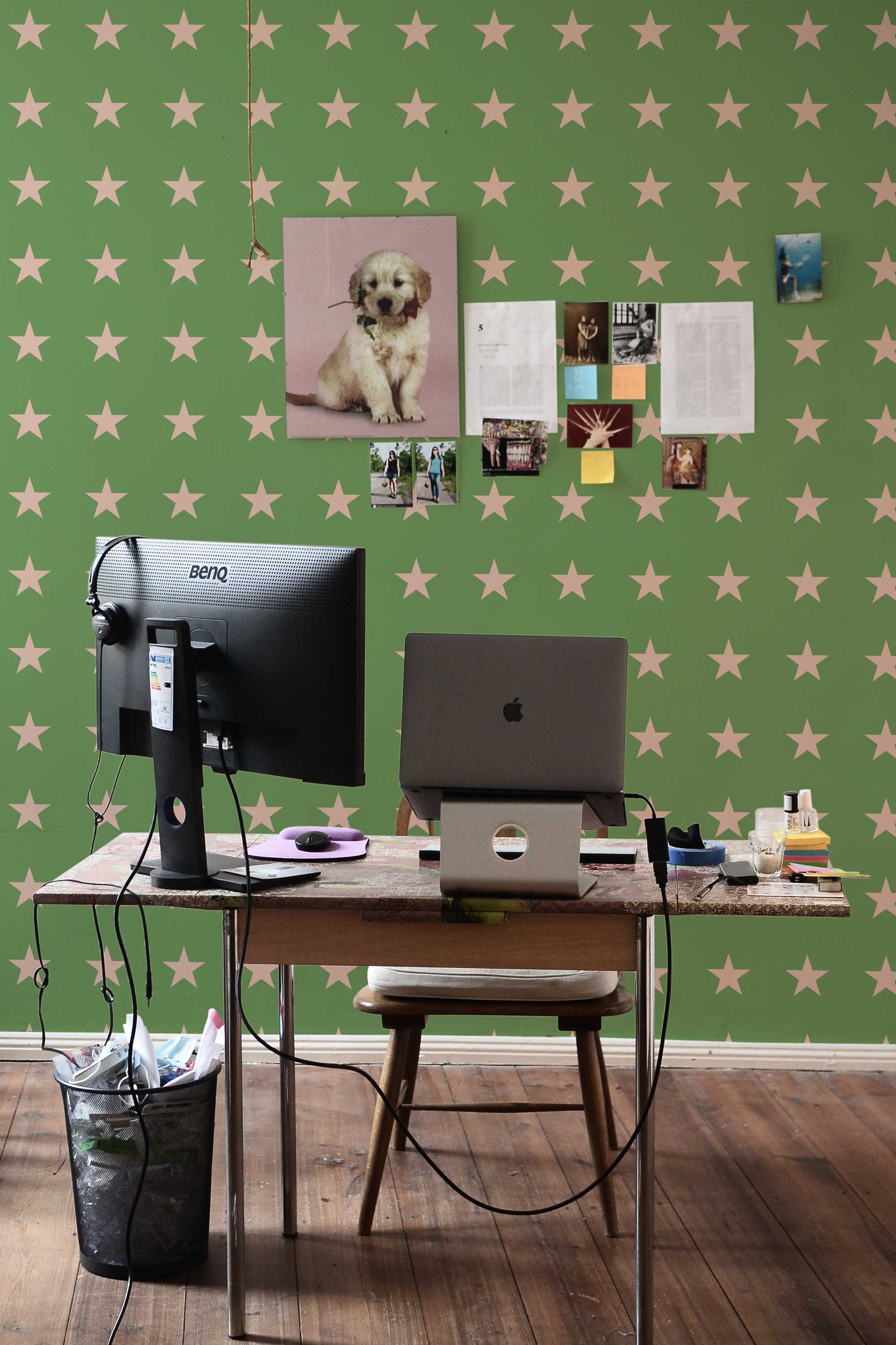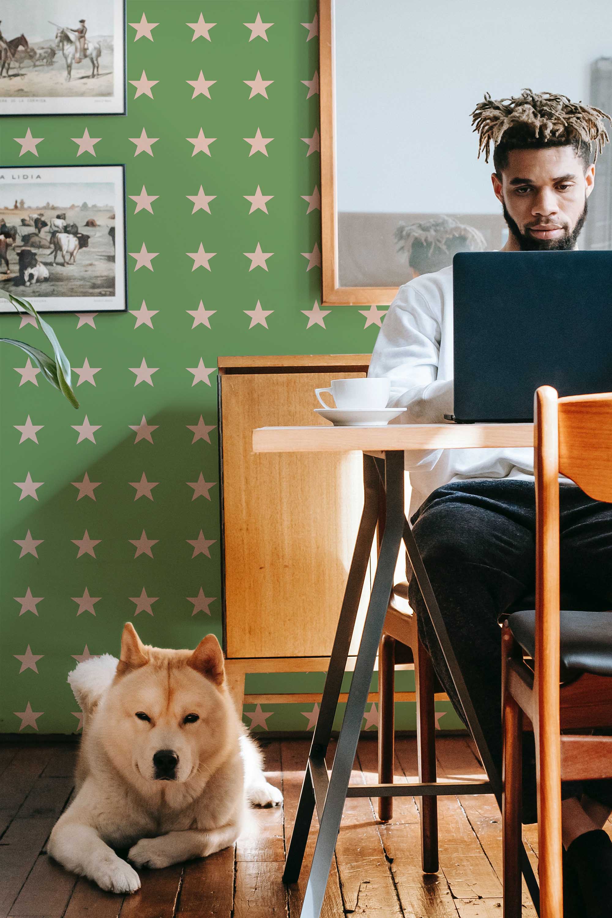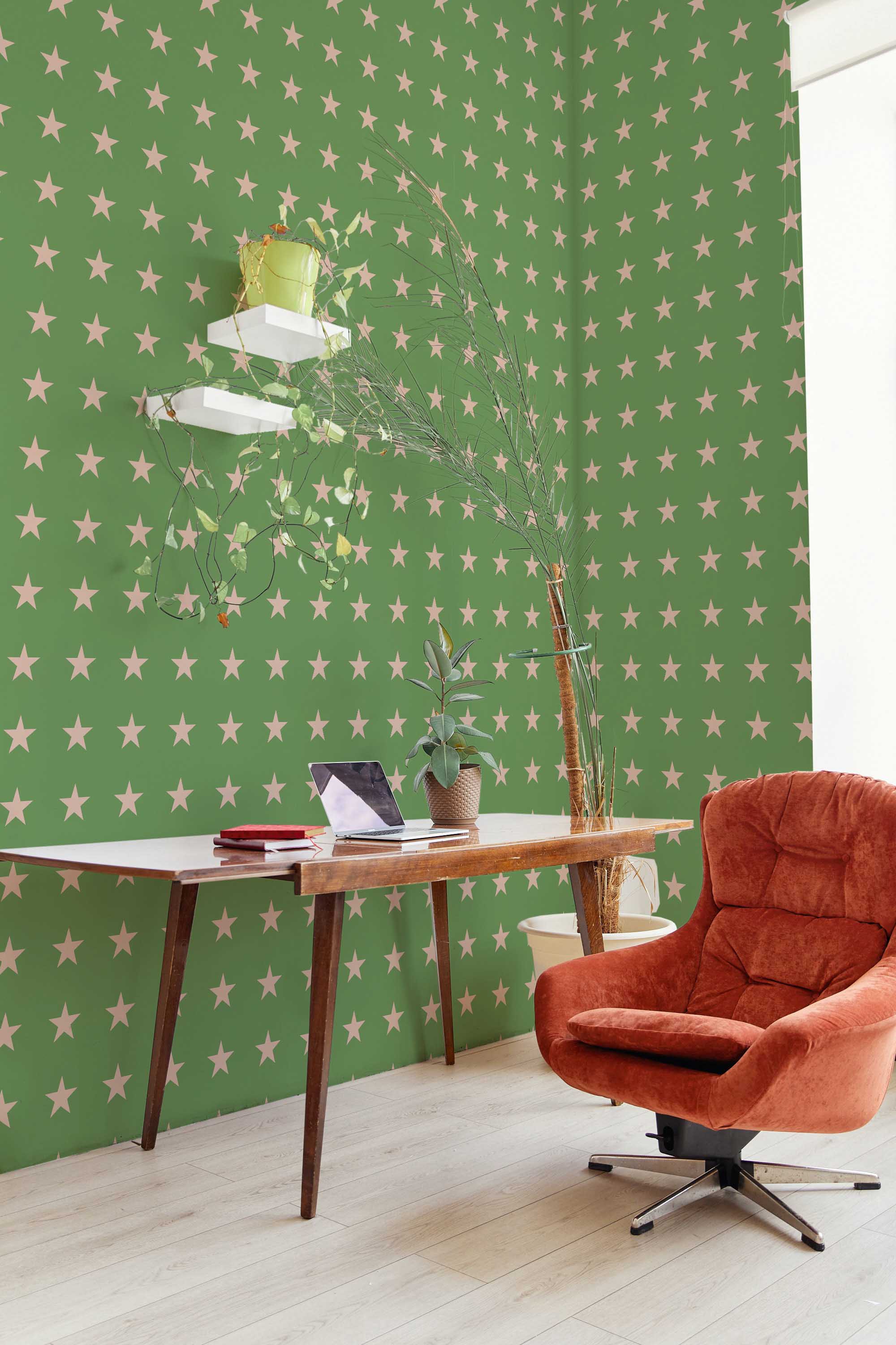 Army Stars wallpaper brings eclectic charm to a nursery or kids room with its muted green background and soft beige star pattern. The gentle contrast creates a calm and cozy look that feels both playful and minimal. The Army Stars peel and stick wallpaper offers a removable and self-adhesive option for easy updates, and it is also available as non-pasted for traditional paste-the-wall installation. Army Stars blends simple star shapes with warm green tones, making it a perfect choice for relaxed family spaces. Printed on eco-friendly, PVC-free materials using GreenGuard Certified inks, this wallpaper is safe for indoor use and ideal for renters or long-term decorating.