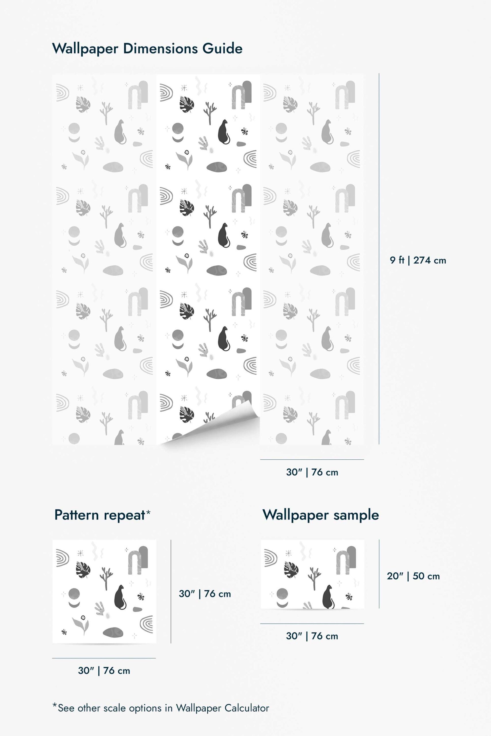 Black and white boho wallpaper brings a touch of bohemian elegance to your powder room with its striking monochrome palette and nature-inspired design. Featuring abstract silhouettes of leaves, arches, and a whimsical cat, this artistic pattern is enhanced with subtle gray geometric accents, offering a modern and minimalist aesthetic. Whether you use it in a powder room or any other space in your home, Black and white boho wallpaper adds a playful yet sophisticated charm that complements a variety of styles. The wallpaper is available in two options: an easy-to-apply peel and stick version, which is self-adhesive and removable, or a traditional non-pasted version that requires glue. Let the adventurous spirit of the design transform your walls into a beautiful canvas, crafted by a passionate team dedicated to providing safe, PVC-free wall décor that inspires joy and creativity in homes around the world.