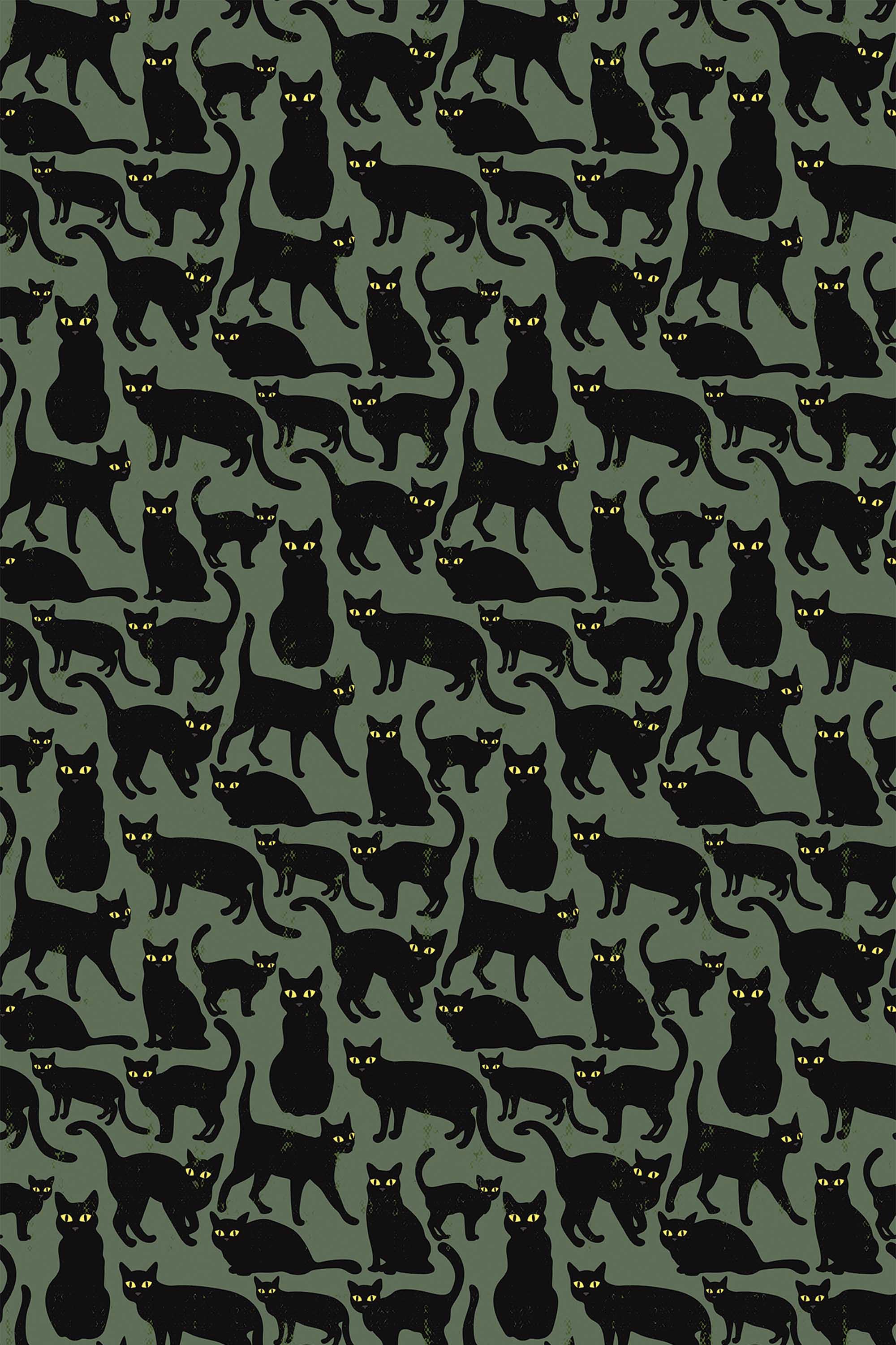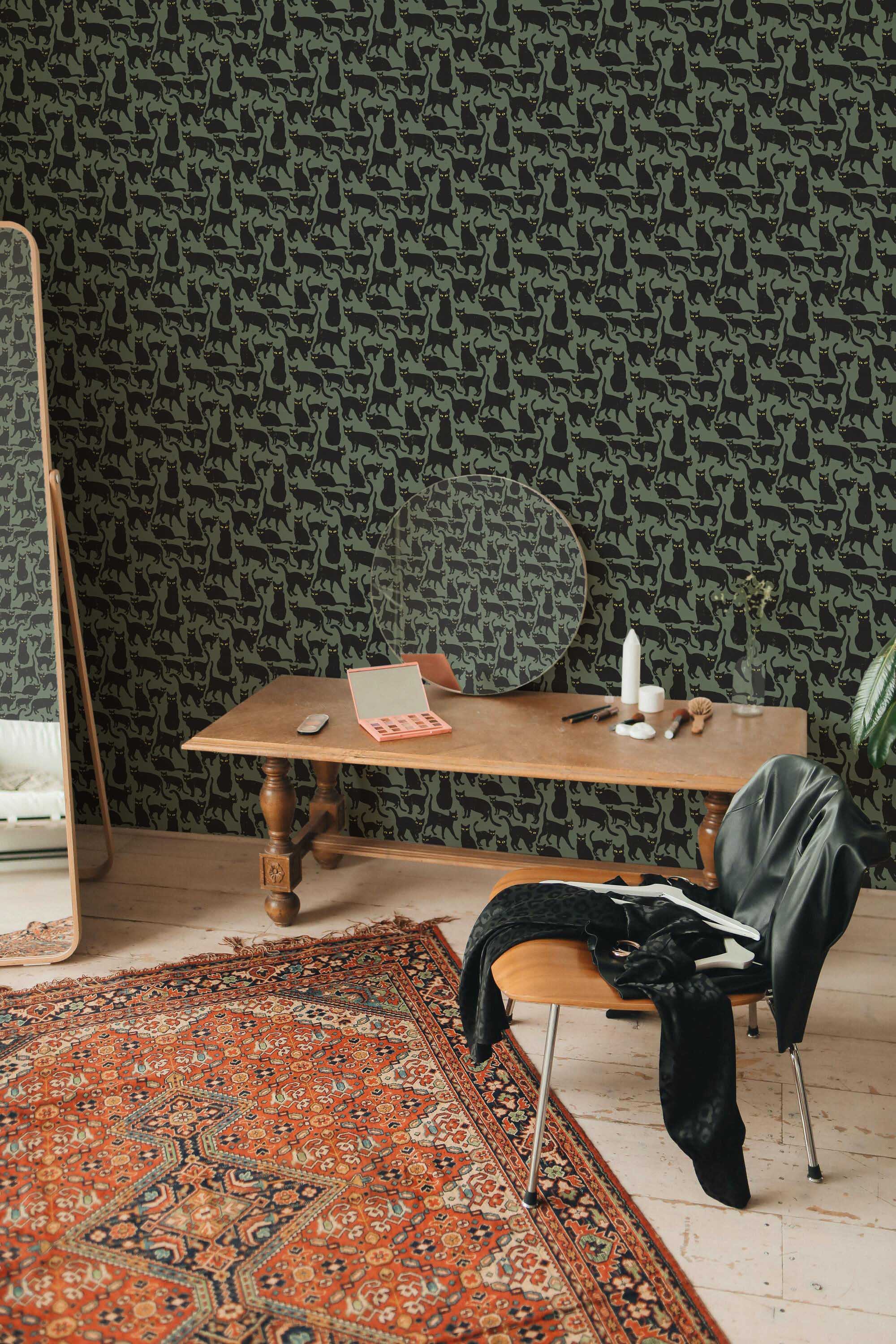 Black Cats wallpaper brings gothic charm to interiors with a deep olive green background filled with sleek black cats and vivid green eyes. The repeating pattern carries feline energy, adding mystery and style to powder rooms, bedrooms, or creative studios.