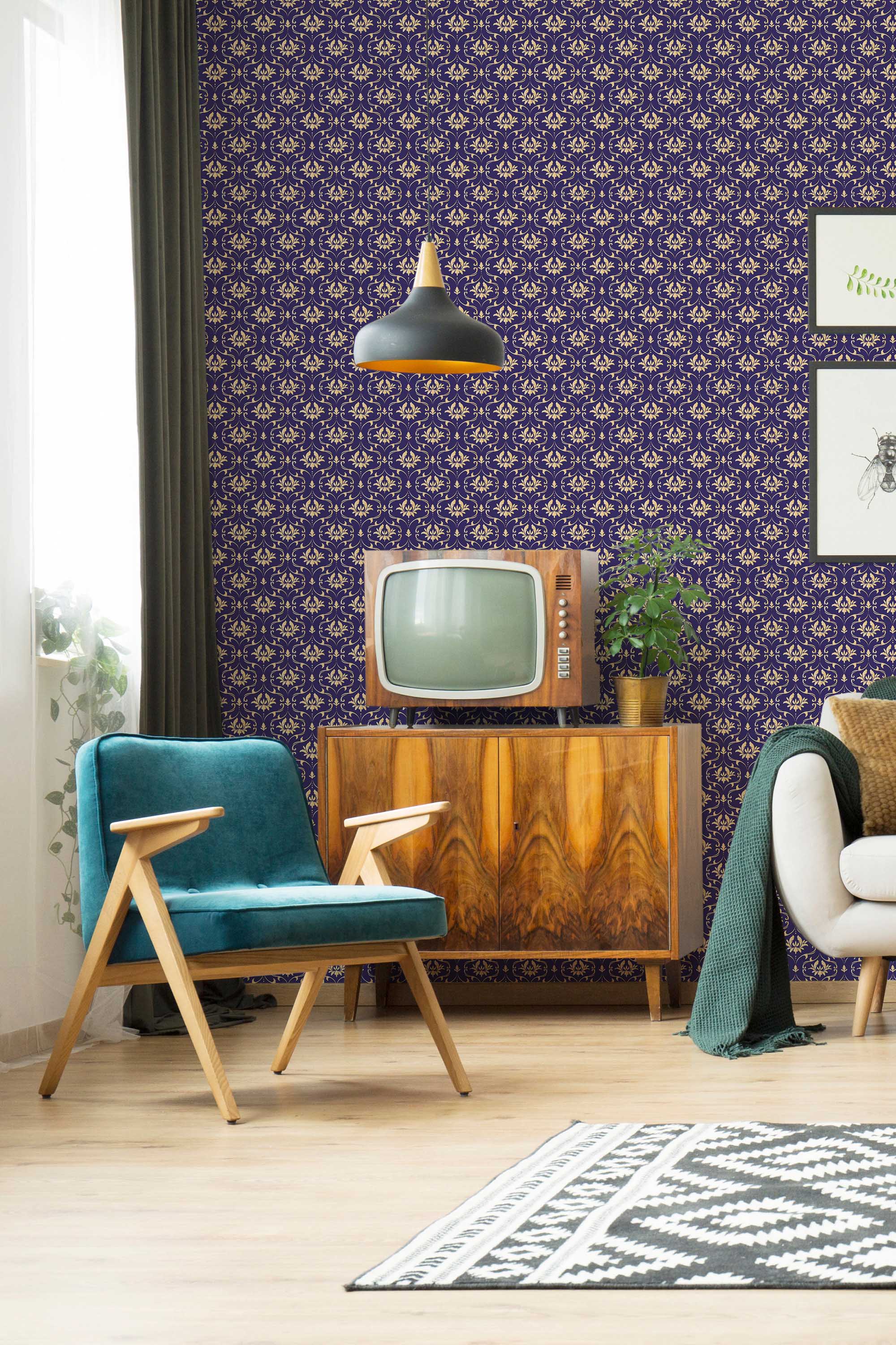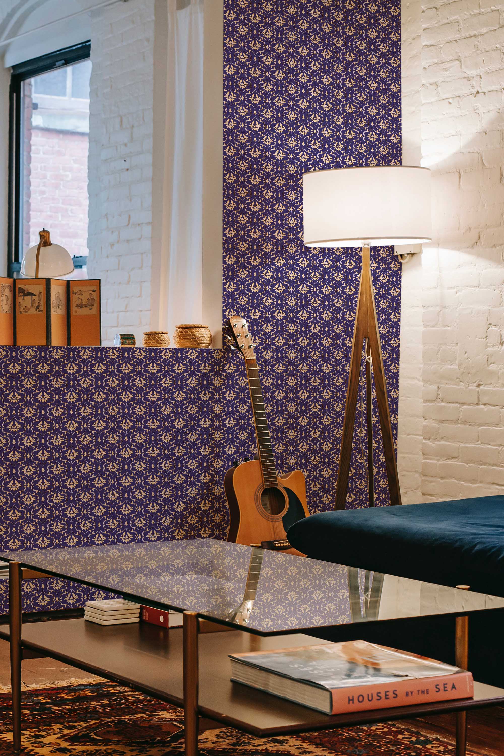 Blue Deco wallpaper brings coastal elegance and vintage sophistication to your space with its refined navy blue and gold damask pattern. The geometric symmetry and classic tones evoke the glamour of the art deco era, creating a timeless statement perfect for living rooms, dining spaces, or elegant entryways.