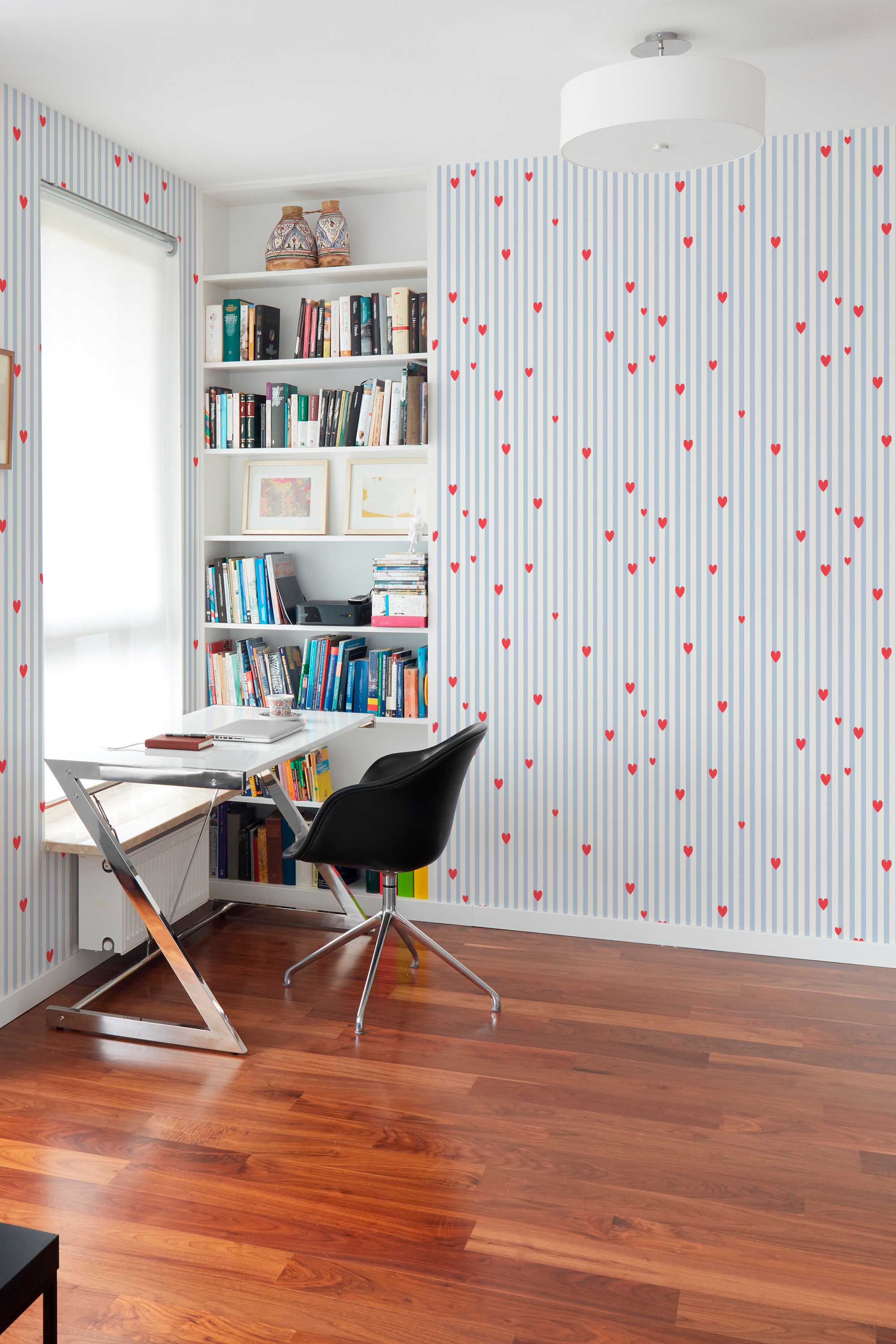 Blue Stripes and Hearts peel and stick wallpaper uses a self-adhesive polyester textile for quick installation and clean removal. The non-pasted option features FSC mix-certified non-woven material for a smooth, traditional finish. Both wallpaper types are PVC-free and printed with GreenGuard Gold certified inks for vivid, safe color. Inspired by nature and passionate about color, Fancy Walls designs décor loved worldwide.Wallpaper Highlights