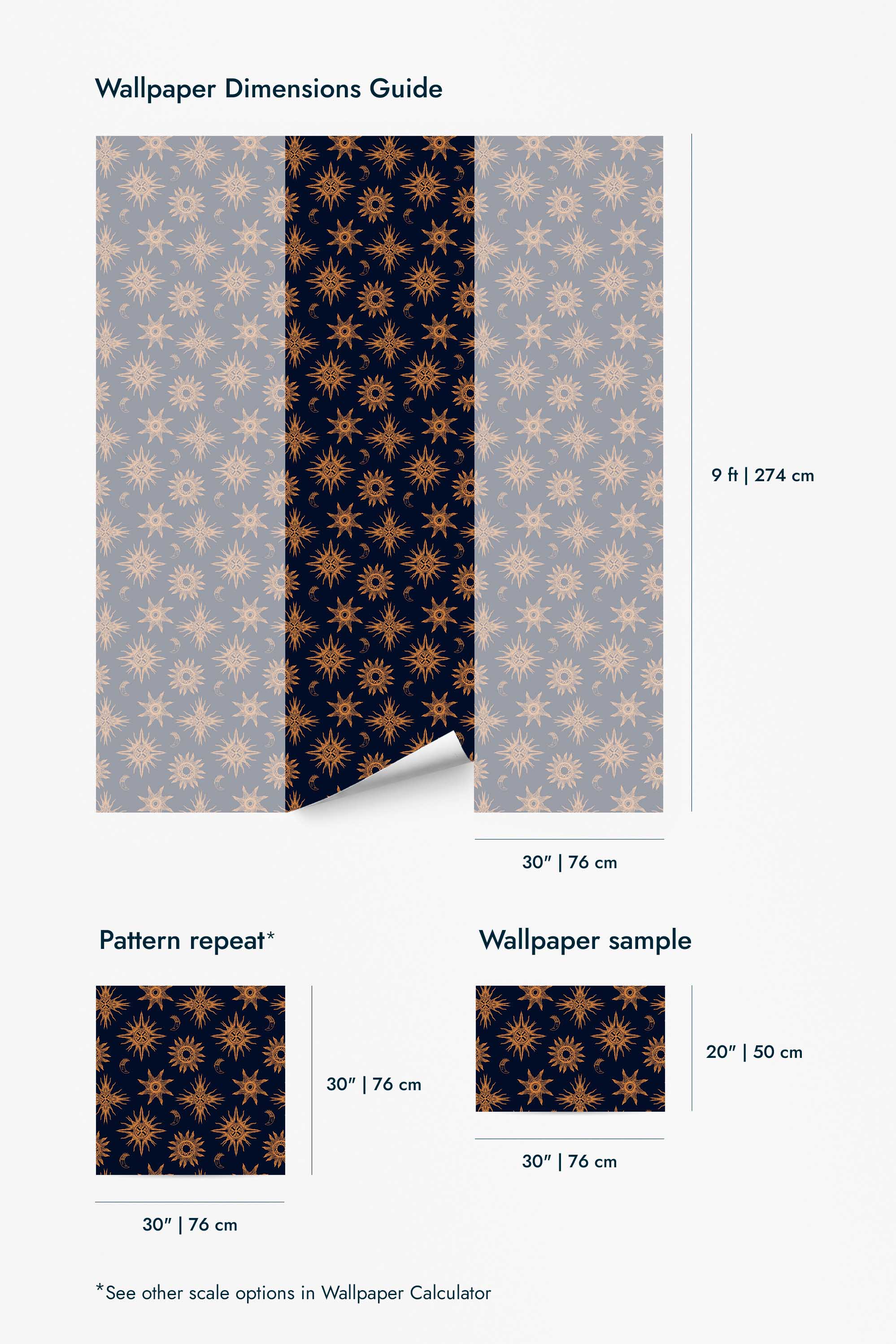 Boho celestial wallpaper offers a captivating blend of boho style and celestial patterns, featuring intricate copper color motifs of suns and moons on a deep navy blue backdrop, ideal for transforming bedrooms into ethereal sanctuaries. This mystical design invites a sense of wonder and elegance, making it a perfect choice not just for bedrooms, but also for any space that craves an astral touch. With Boho celestial wallpaper, you can effortlessly introduce a vintage yet ornate charm to your interiors. The wallpaper is available in two options: a peel and stick version, which is self-adhesive, removable, and easy to apply without glue, and a non-pasted version that requires traditional glue application. Inspired by the beauty of the sky, this design brings joy and color into homes worldwide, crafted by a passionate team dedicated to offering safe, PVC-free wall décor.