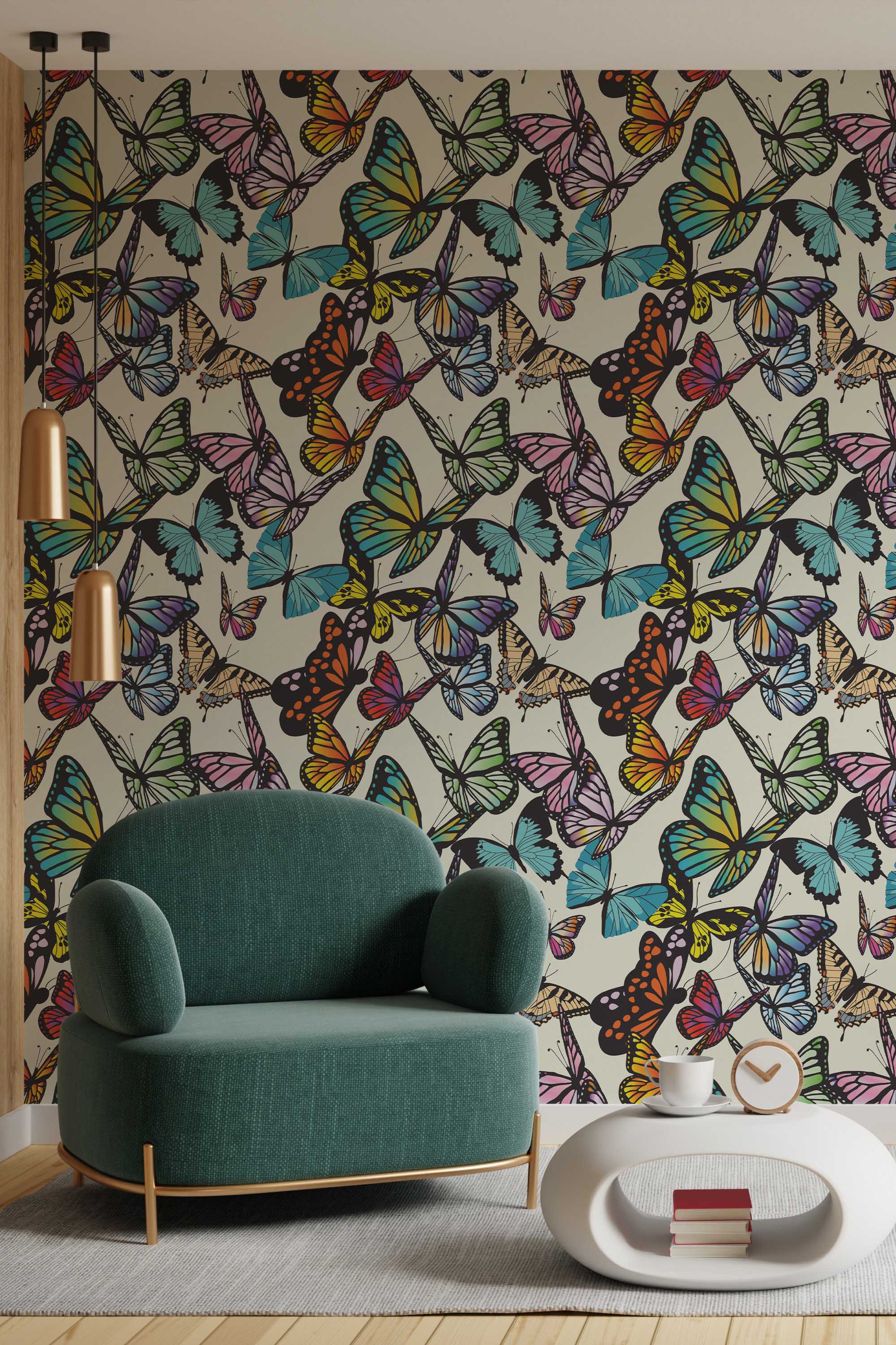 Bold Butterflies wallpaper fills your space with color, movement, and joy. Its lively pattern of multicolored butterflies fluttering across a soft beige background adds a bright, inspiring touch to accent walls, bedrooms, or creative spaces. Every detail captures the lightness and beauty of nature, creating a cheerful, uplifting atmosphere.