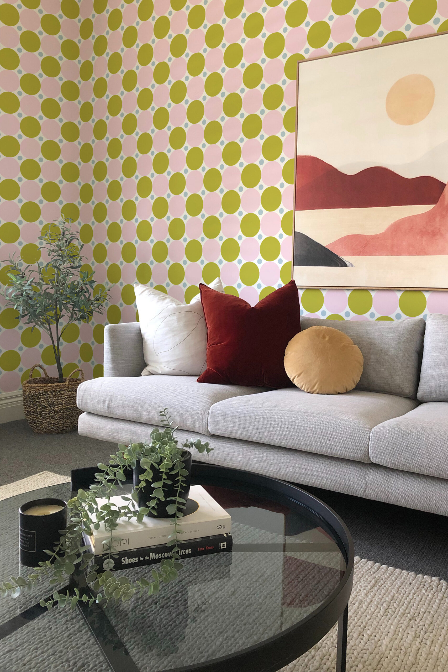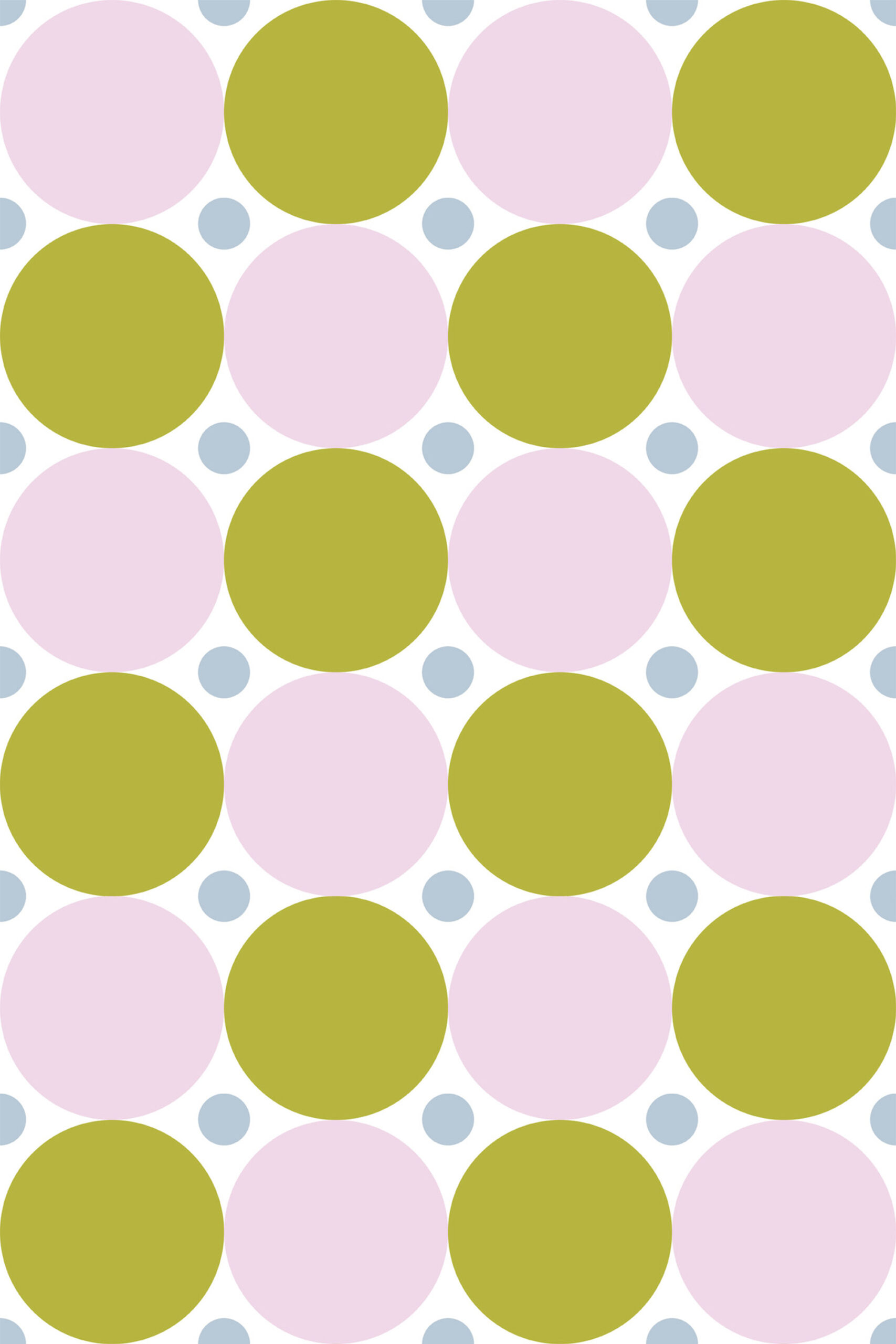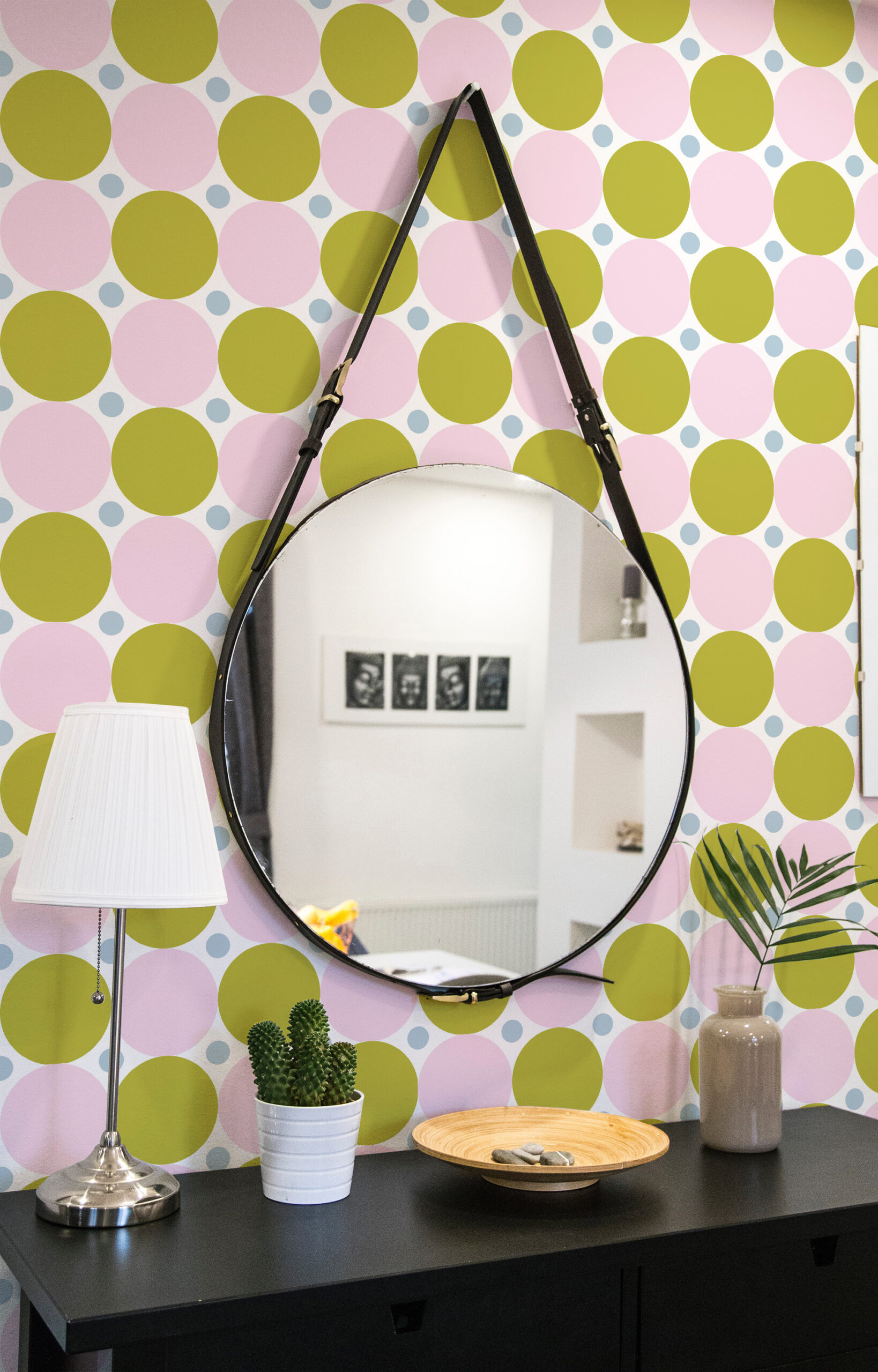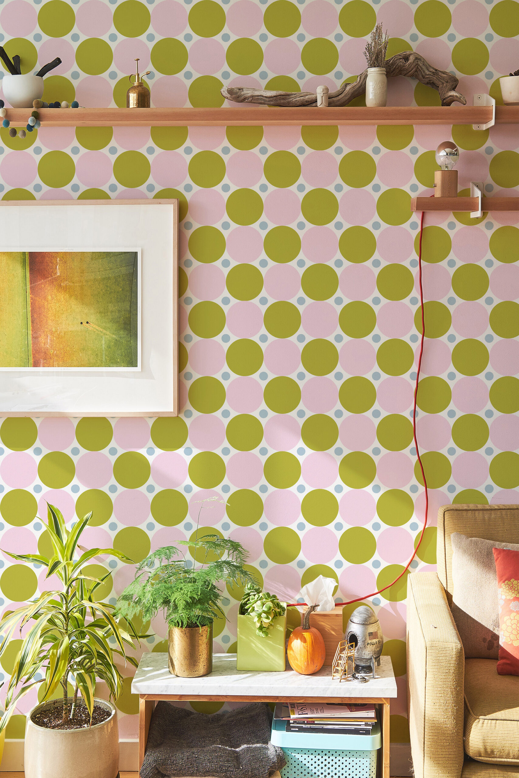Bold Green Retro Polka Dot Wallpaper brings a playful, mid-century feel to a living room, adding energy without feeling busy. Large pink and green circles create a strong, graphic look that reads clearly from across the space. Smaller light blue dots fill the background for extra texture and movement. The crisp white backdrop keeps the colors feeling open and bright. It also works well in a dining room, home office, or a cheerful hallway feature wall.