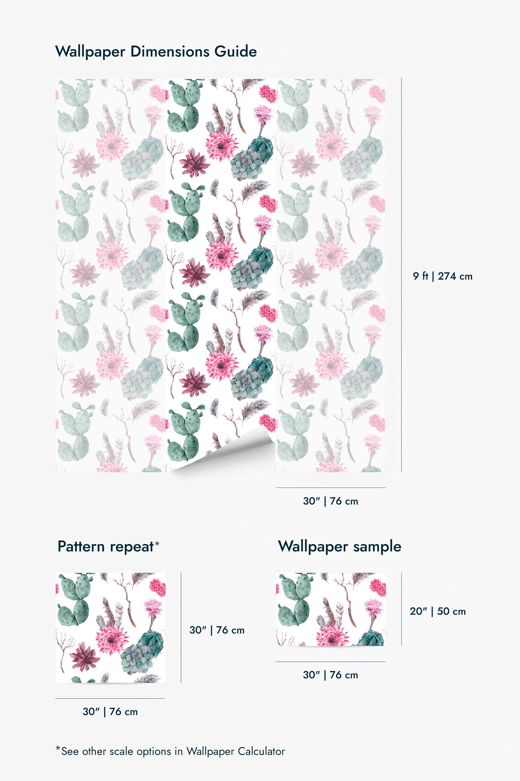 Cactus flower wallpaper brings a splash of botanical beauty to your bedroom with its colorful floral pattern, featuring delicate watercolor succulents and cacti in soft green, vibrant pink blooms, and feathers against a crisp white background. This artistic design not only enlivens bedrooms but can also transform living rooms, home offices, or any space yearning for a touch of desert-inspired elegance. The Cactus flower wallpaper is available in two options: the peel and stick version, which is self-adhesive, removable, and easy to apply, and the non-pasted type, which requires traditional glue application. Let the natural, soft charm of the Cactus flower design inspire a joyful and adventurous atmosphere in your home, with our safe, PVC-free wall décor crafted to bring vibrant life to every corner of the world.