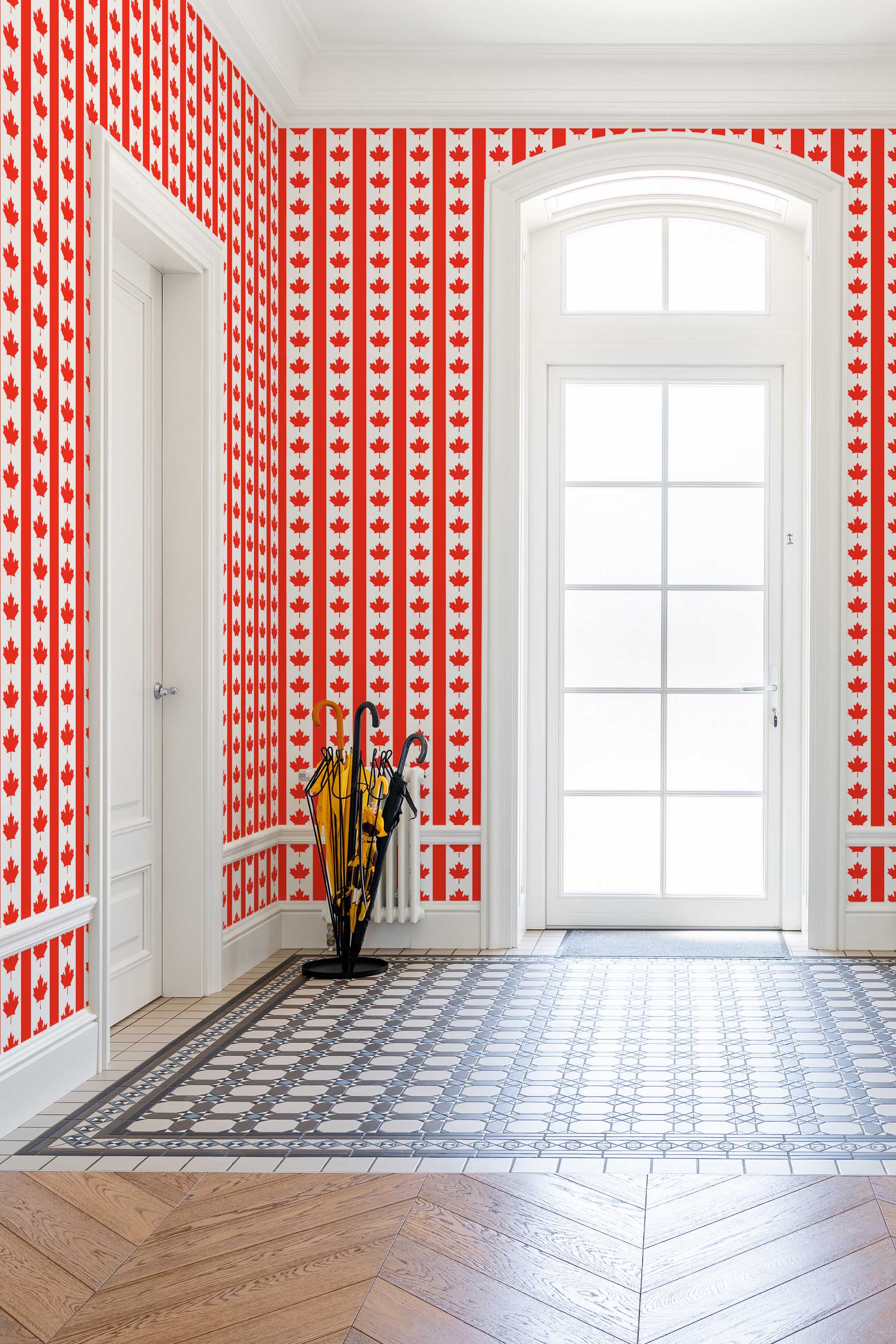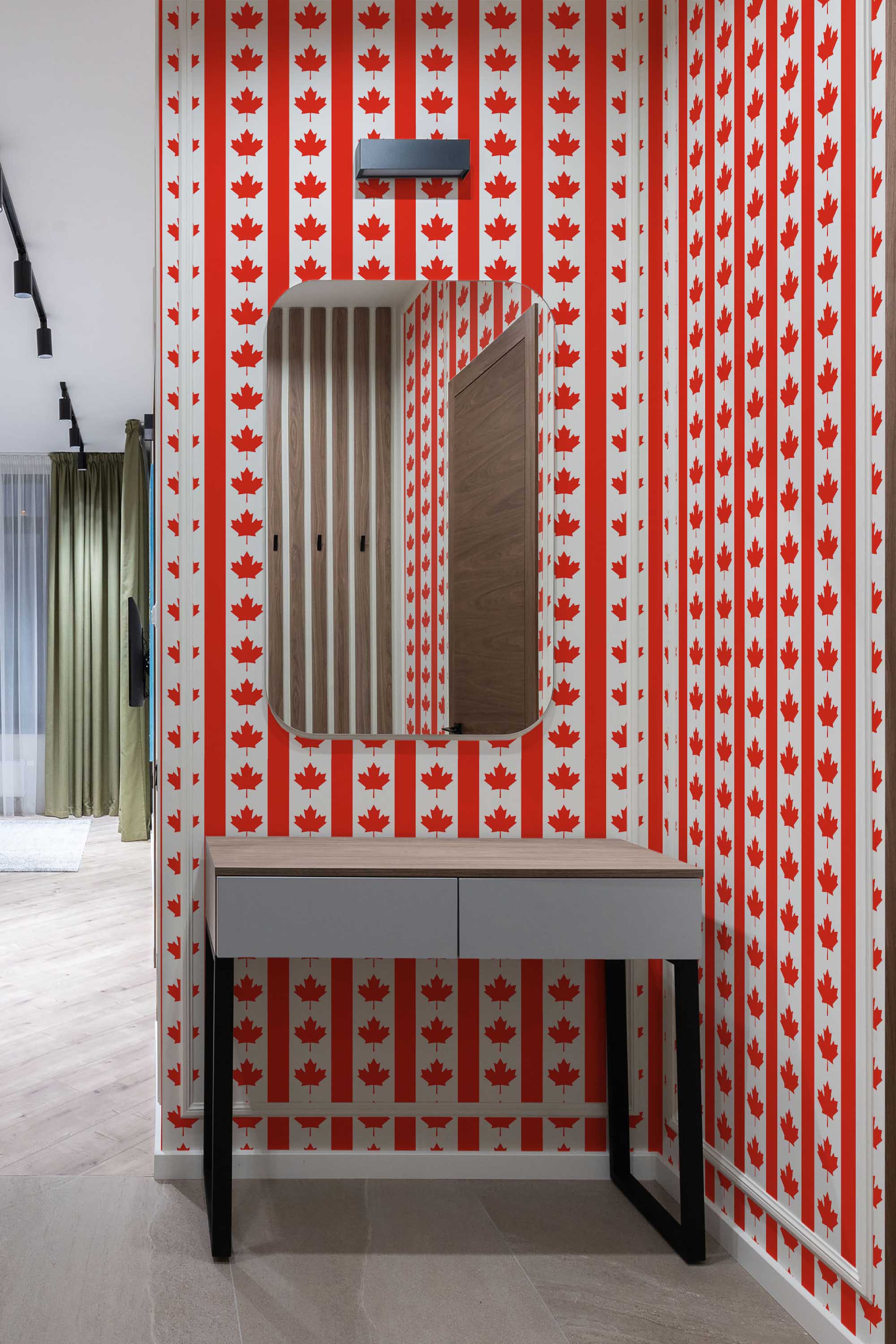 Canada Flag Stripe Wallpaper brings a bold, celebratory mood to your space with vertical red and white stripes inspired by the iconic maple leaf flag. The clean, banded layout creates a festive, banner-like look that works beautifully in hallways where color and pattern can set an uplifting tone. Its crisp contrast adds energy without overwhelming the décor.