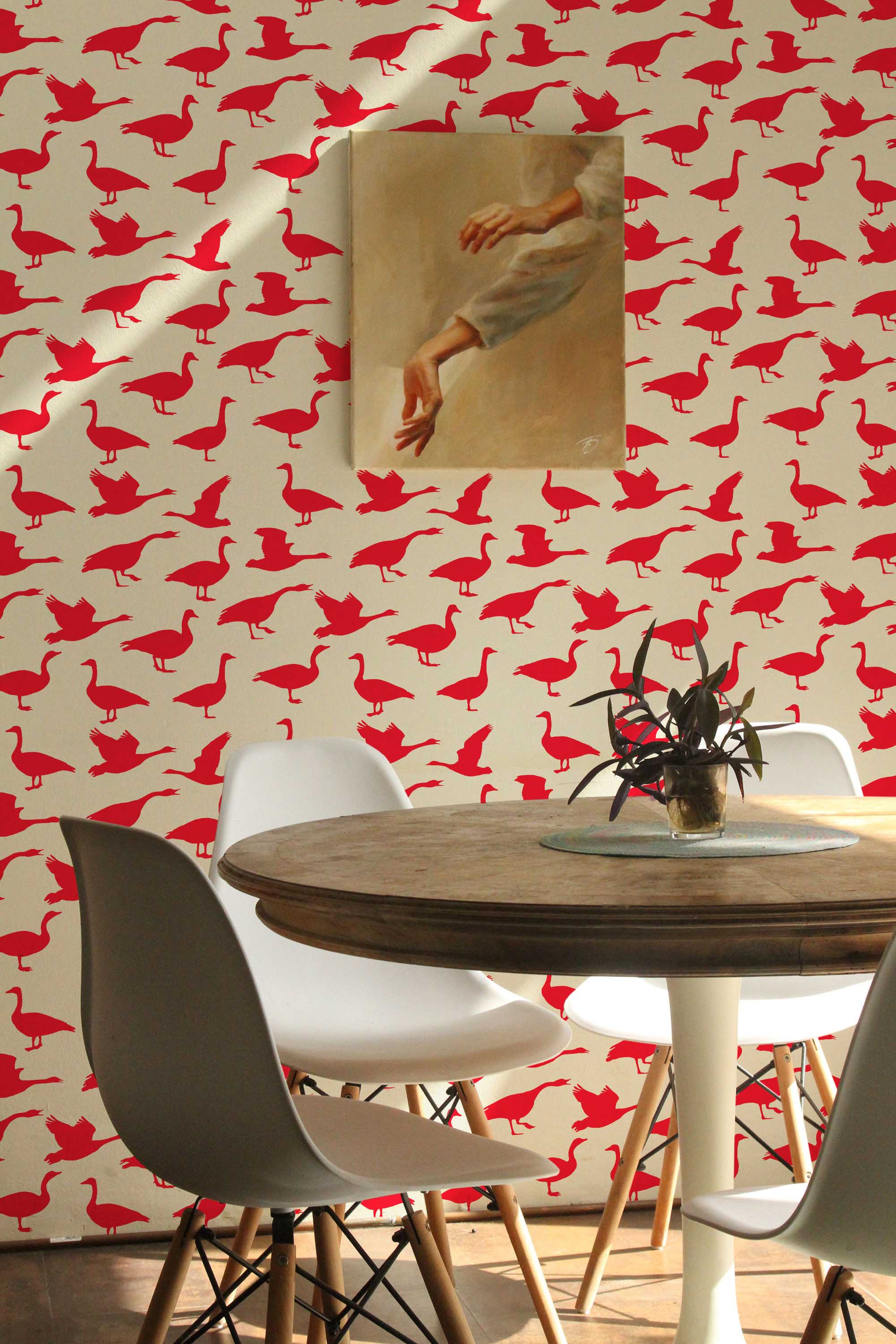 Canada Goose Wallpaper brings a bold, playful spirit to your space with vibrant red goose silhouettes set against a warm cream backdrop. The nature-inspired pattern blends folk-art charm with a whimsical patriotic twist, making it a delightful choice for dining rooms where color and character help shape a cozy, welcoming mood. Its simple shapes add personality while keeping the room bright and balanced.