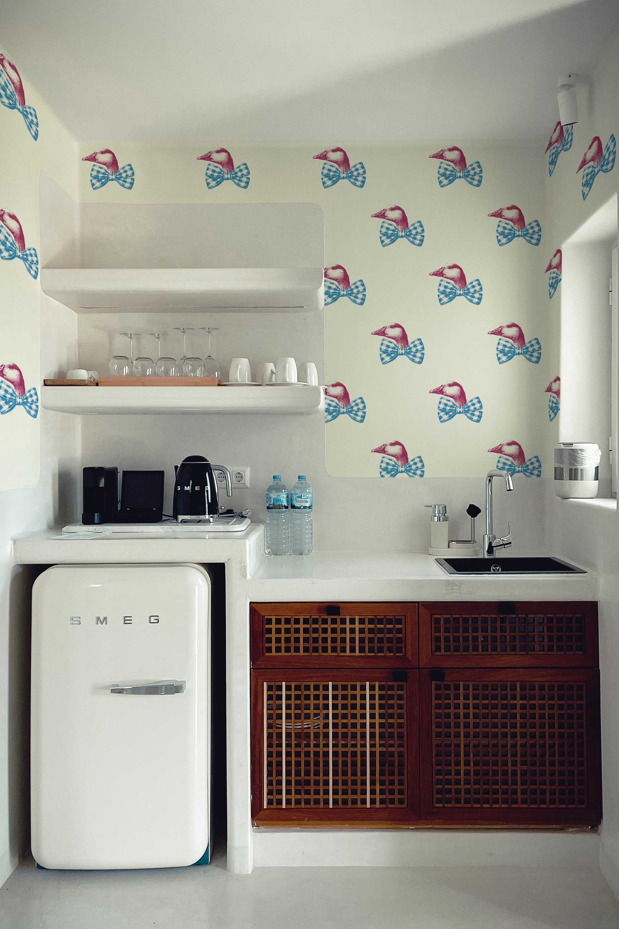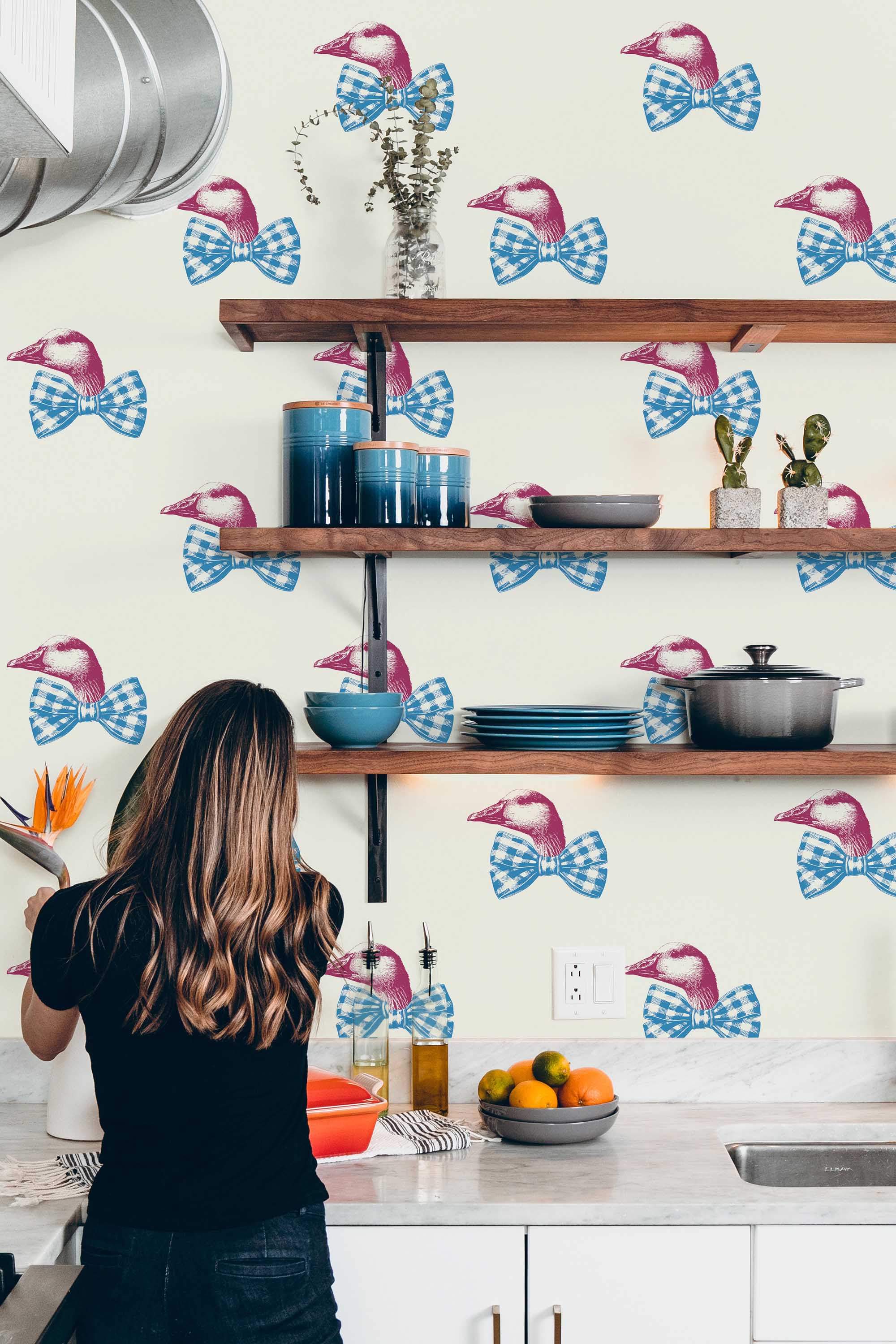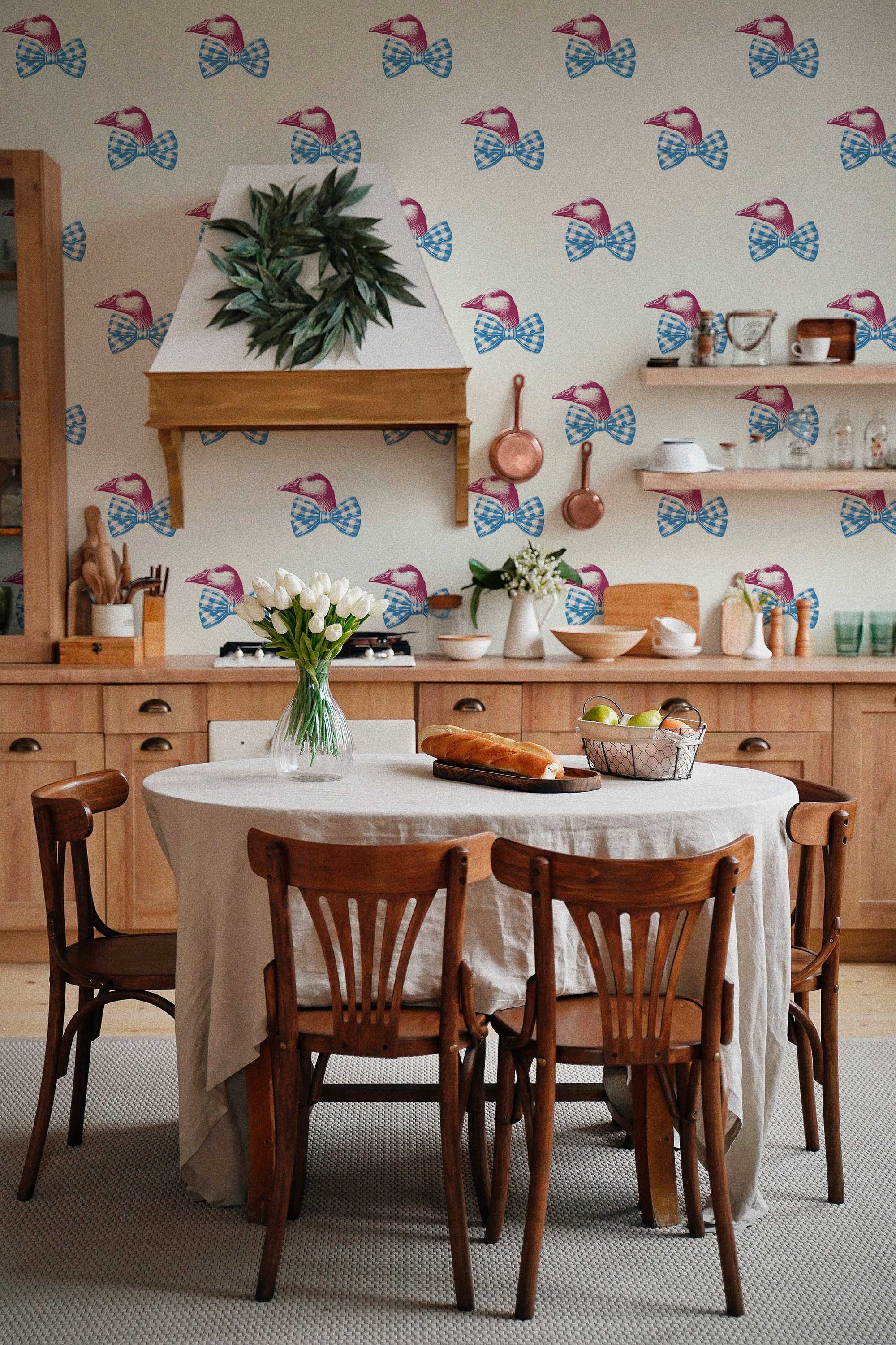 Classic Goose Wallpaper brings farmhouse warmth to kitchens with soft beige tones and charming goose portraits finished with quirky plaid bows. The vintage-inspired pattern feels calm and inviting, while the balanced spacing keeps the look light and timeless. Moreover, the gentle contrast and playful detail add personality without overwhelming cabinetry or dining spaces, making it ideal for cozy, character-filled interiors.