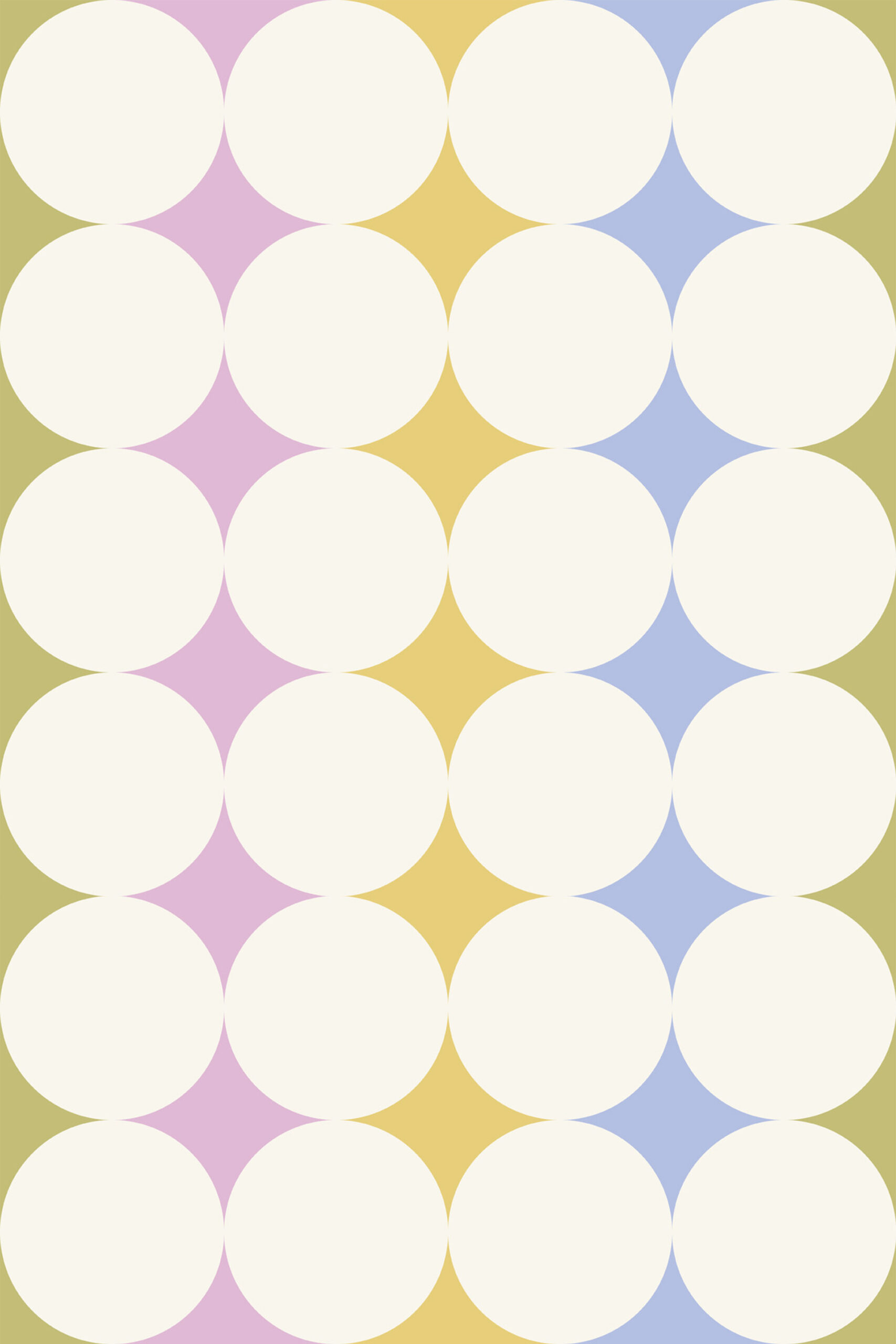 Colorful Retro Polka Dot Wallpaper brings a playful, mid-century feel to a living room with its oversized off-white circles laid out in a tidy grid. The background is split into soft vertical bands that add gentle movement without feeling busy. Pastel pink, yellow, light blue, and olive green create a cheerful mix that still reads calm and airy. It works well as an accent wall behind a sofa, and it also fits nicely in a hallway or home office where you want a bit of fun color.