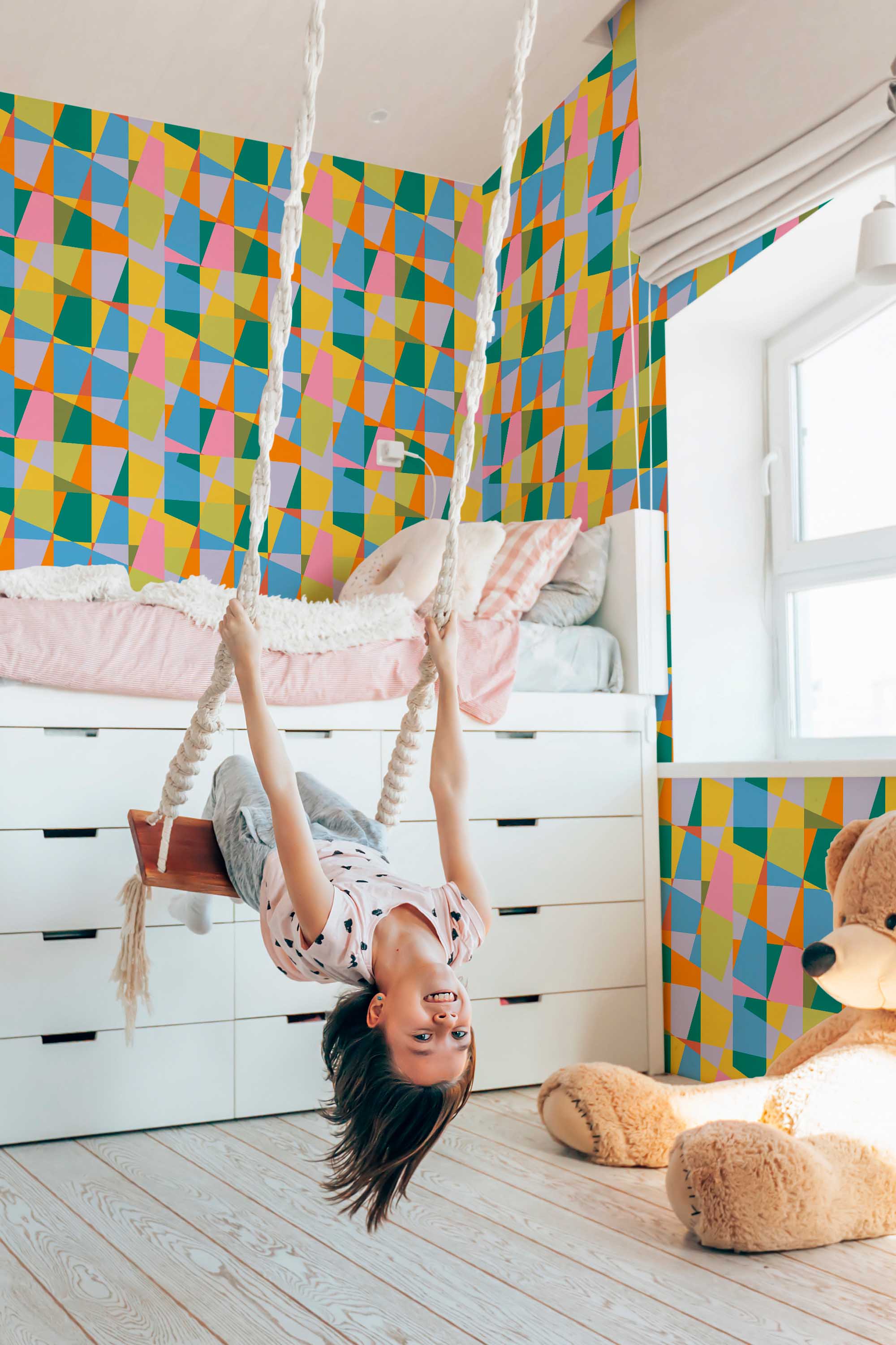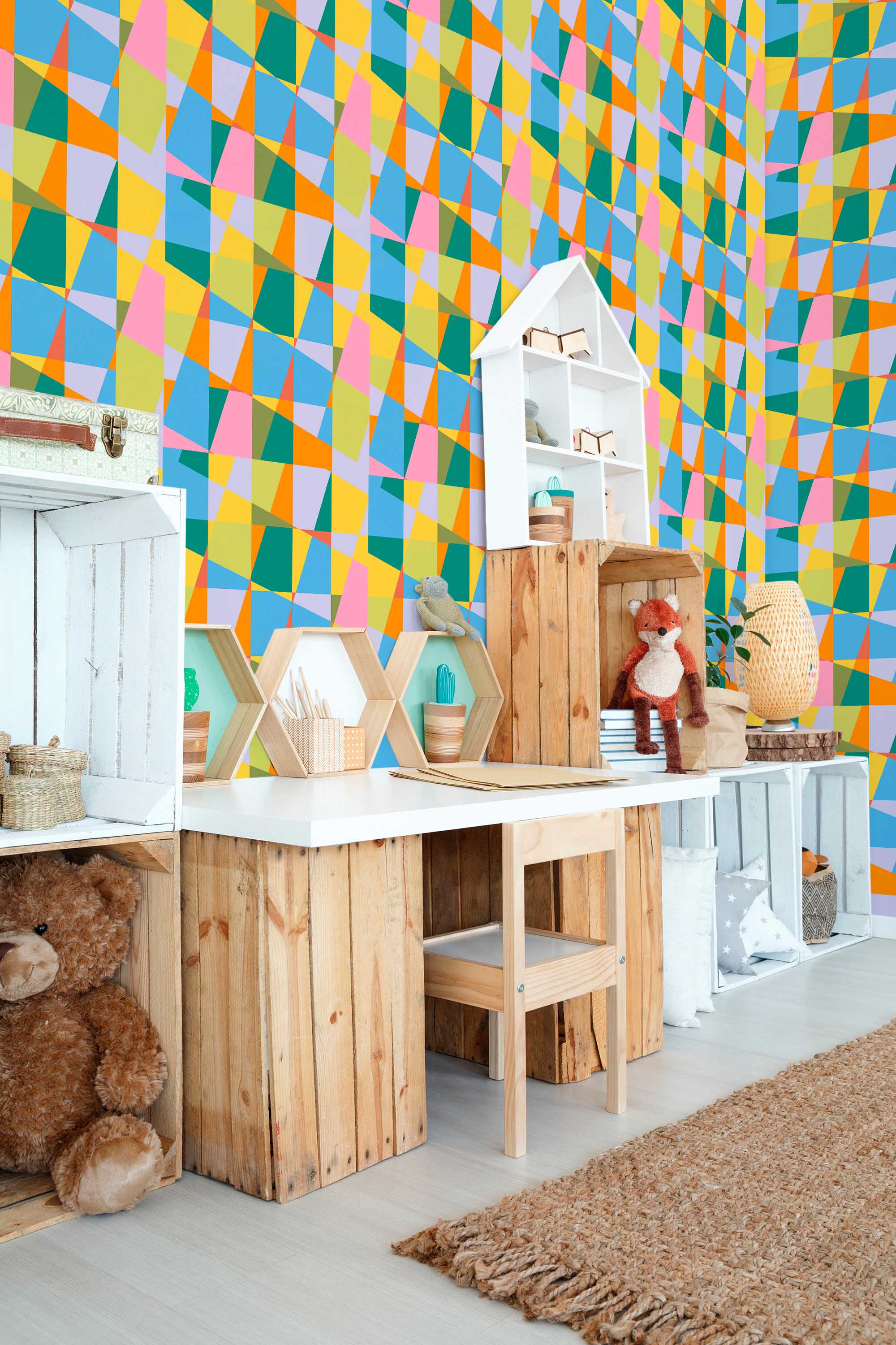 Colorful Teen Room wallpaper brings bold energy to a teen bedroom or creative studio with layered abstract geometric shapes in vibrant hues. The modern composition blends playful color with strong structure, creating a space that feels expressive and fresh. The Colorful Teen Room peel and stick wallpaper offers a removable and self-adhesive option for quick updates, and it is also available as non-pasted for traditional paste-the-wall installation. Colorful Teen Room makes a statement while keeping the design clean and balanced through its geometric layout. Printed on eco-friendly, PVC-free materials using GreenGuard Certified inks, this wallpaper is safe for indoor use and ideal for renters or long-term decorating.