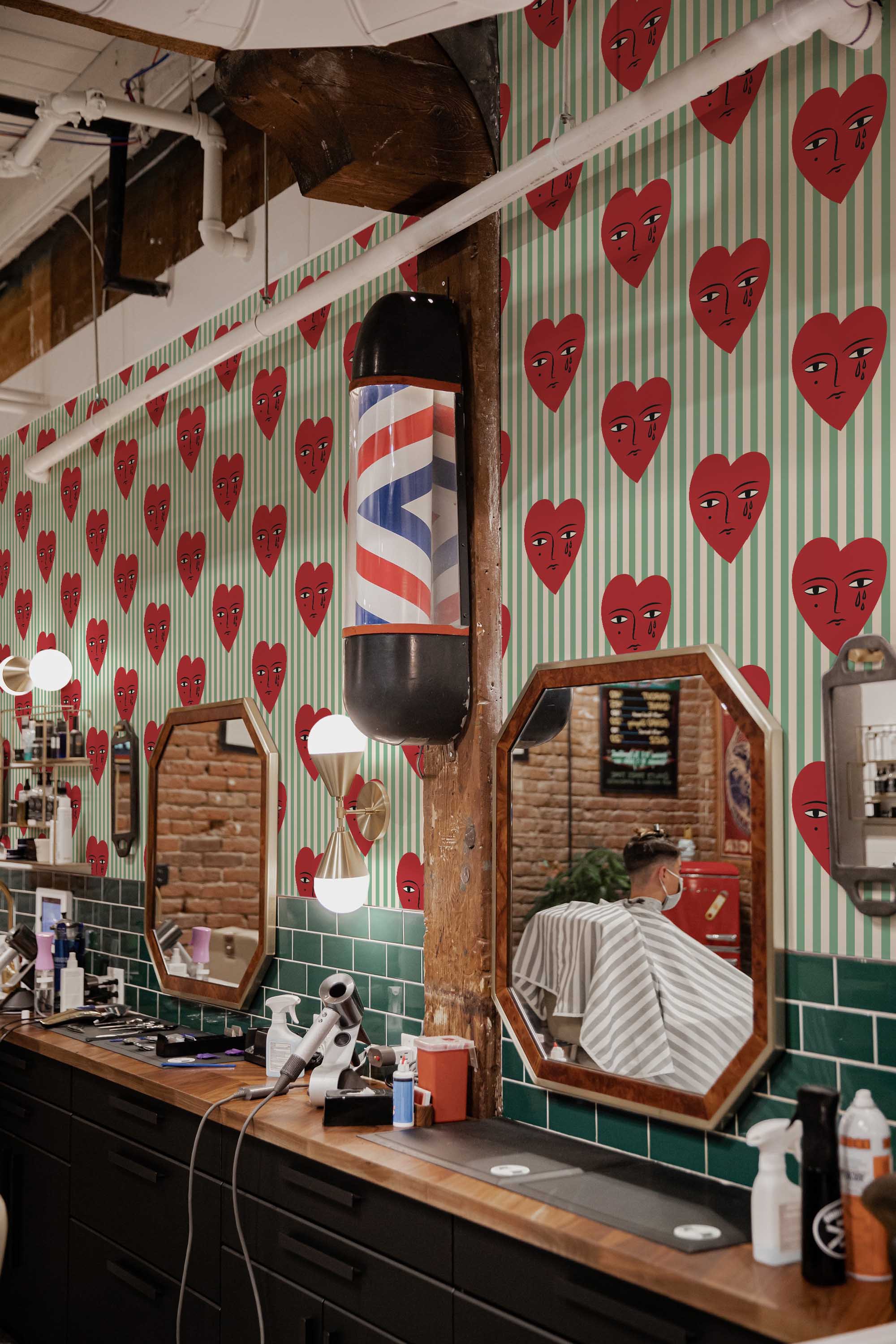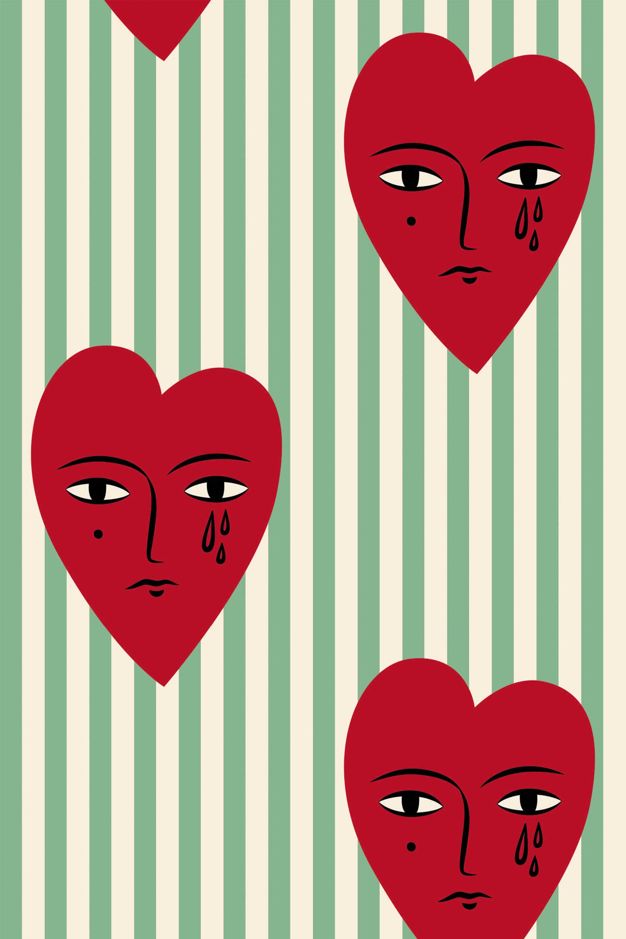 Crying Hearts wallpaper brings a touch of emotion and boho charm to your space, featuring red hearts gently shedding tears across soft sage green and beige stripes. This illustrated design feels playful yet poetic, adding personality and depth to any room—from a stylish barber shop to a cozy living space.