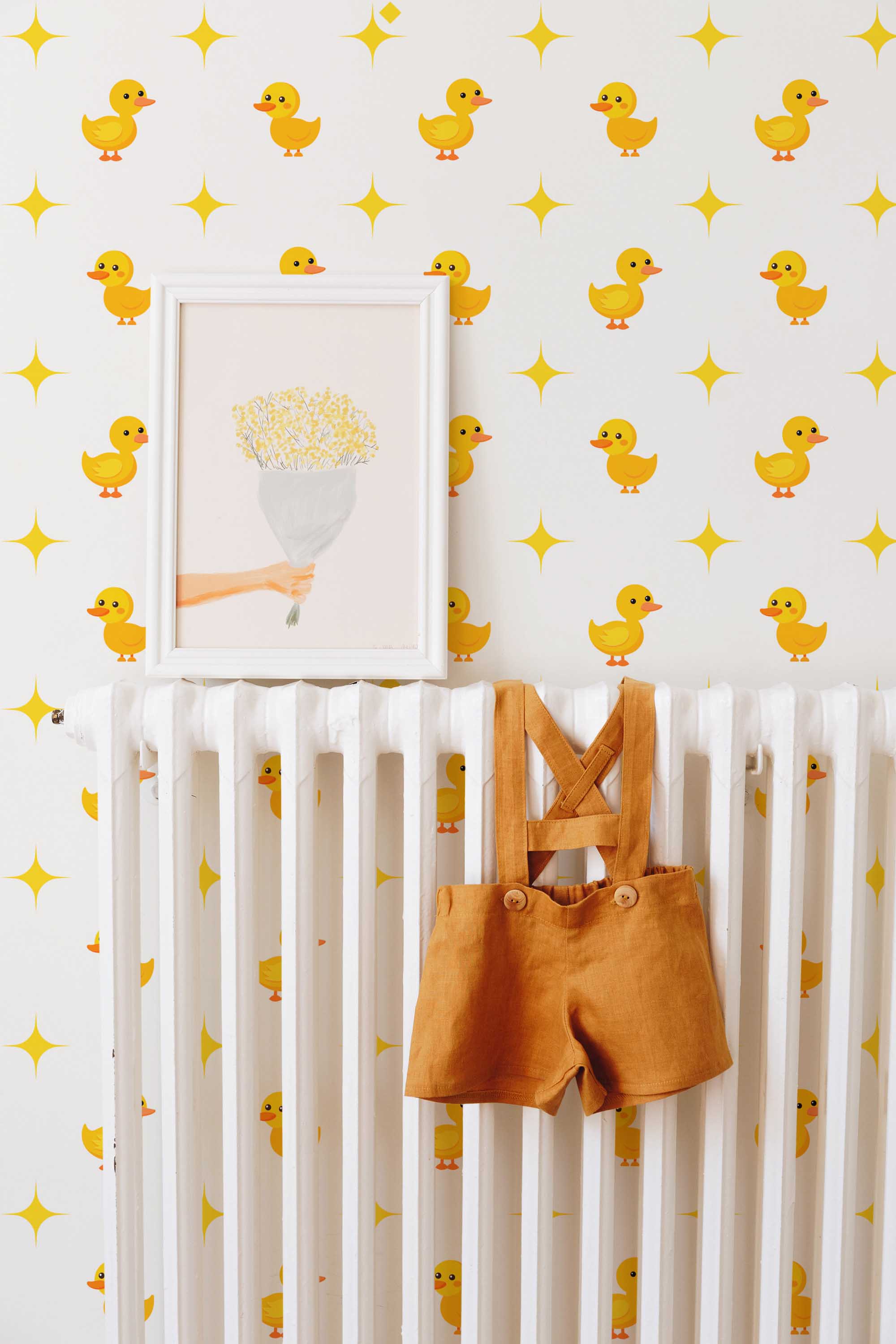 Cute Duck Nursery Wallpaper fills your child’s room with cheerful energy, featuring bright yellow mini duckies arranged in a lively, playful repeat. The adorable pattern creates a joyful atmosphere, making it an ideal choice for nurseries where fun, color, and lighthearted character help shape a happy space. Its modern, fun-and-funky style adds personality without overwhelming the room.