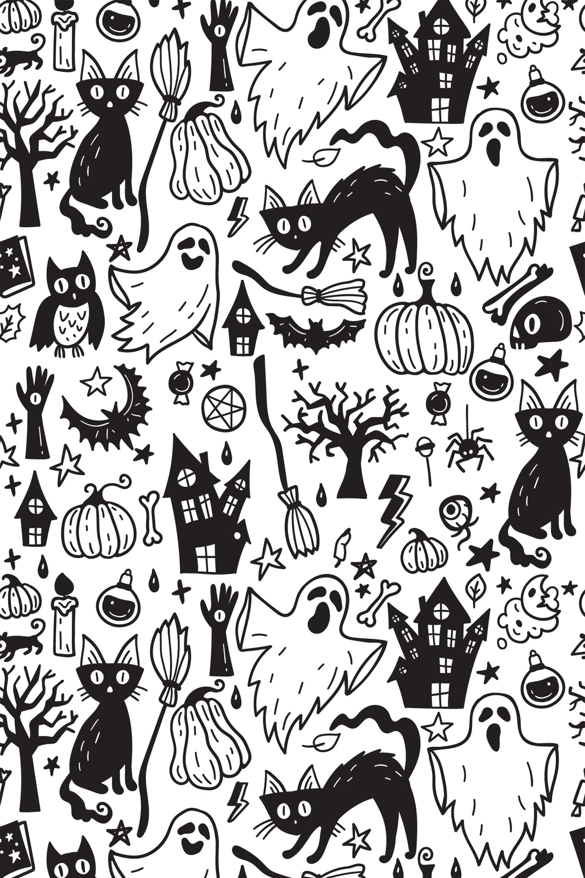 Cute Halloween Doodles wallpaper brings playful novelty to interiors with a black and white palette of cats, pumpkins, ghosts, owls, and brooms. The lively doodle pattern shows the fun side of witchcraft and Halloween. It makes a cheerful choice for accent walls, bedrooms, or creative nooks.