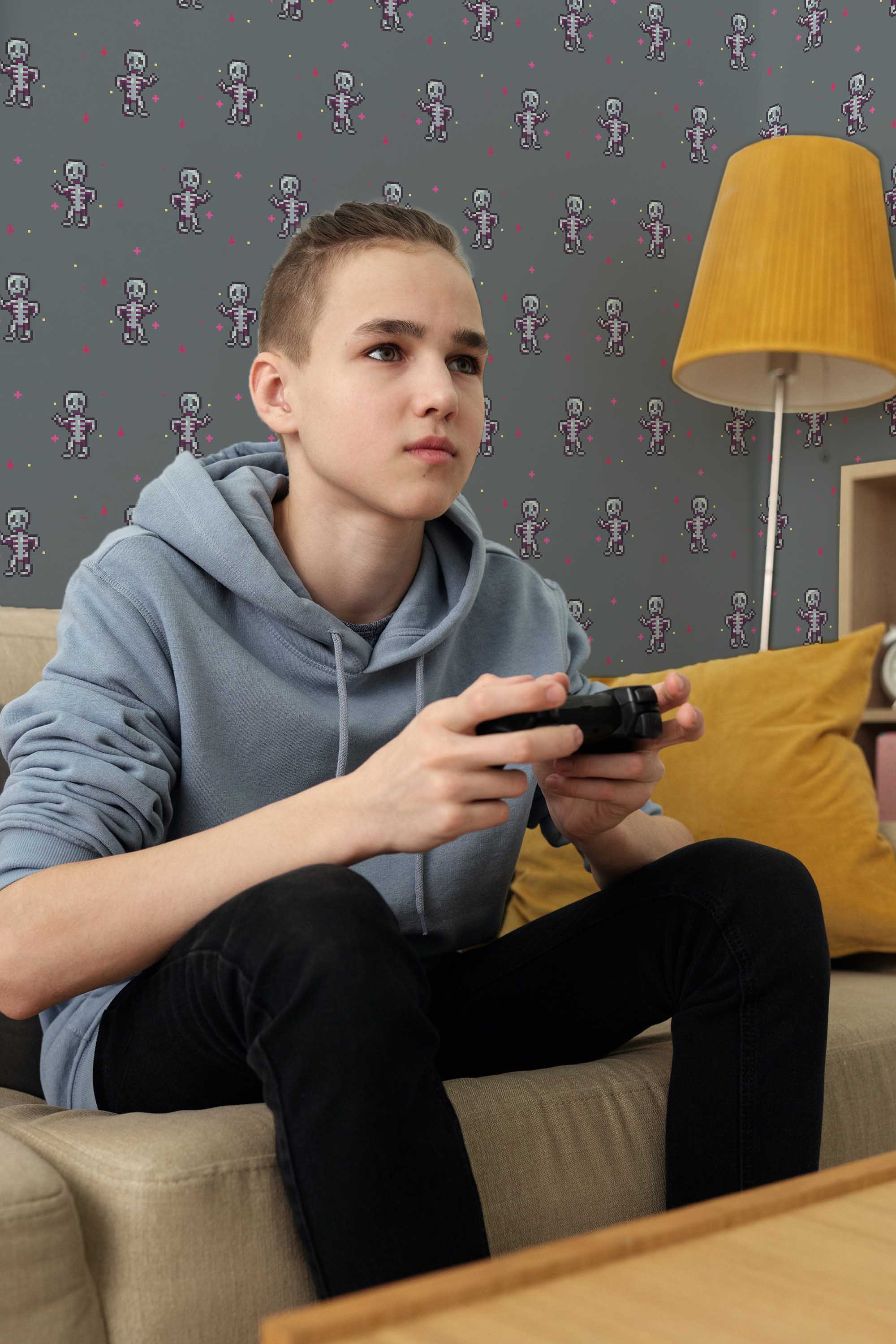This Cute Pixel Skeletons peel and stick wallpaper installs easily without glue and removes just as smoothly. The non pasted option delivers a classic, long lasting finish. Both choices are PVC free and printed with GreenGuard Gold certified inks, ensuring vivid color and safe indoor air. Dancing Pixel Skeleton wallpaper brings character and joy to any space, designed to inspire and crafted with care while staying beautifully made and safe for everyday living.Wallpaper Highlights