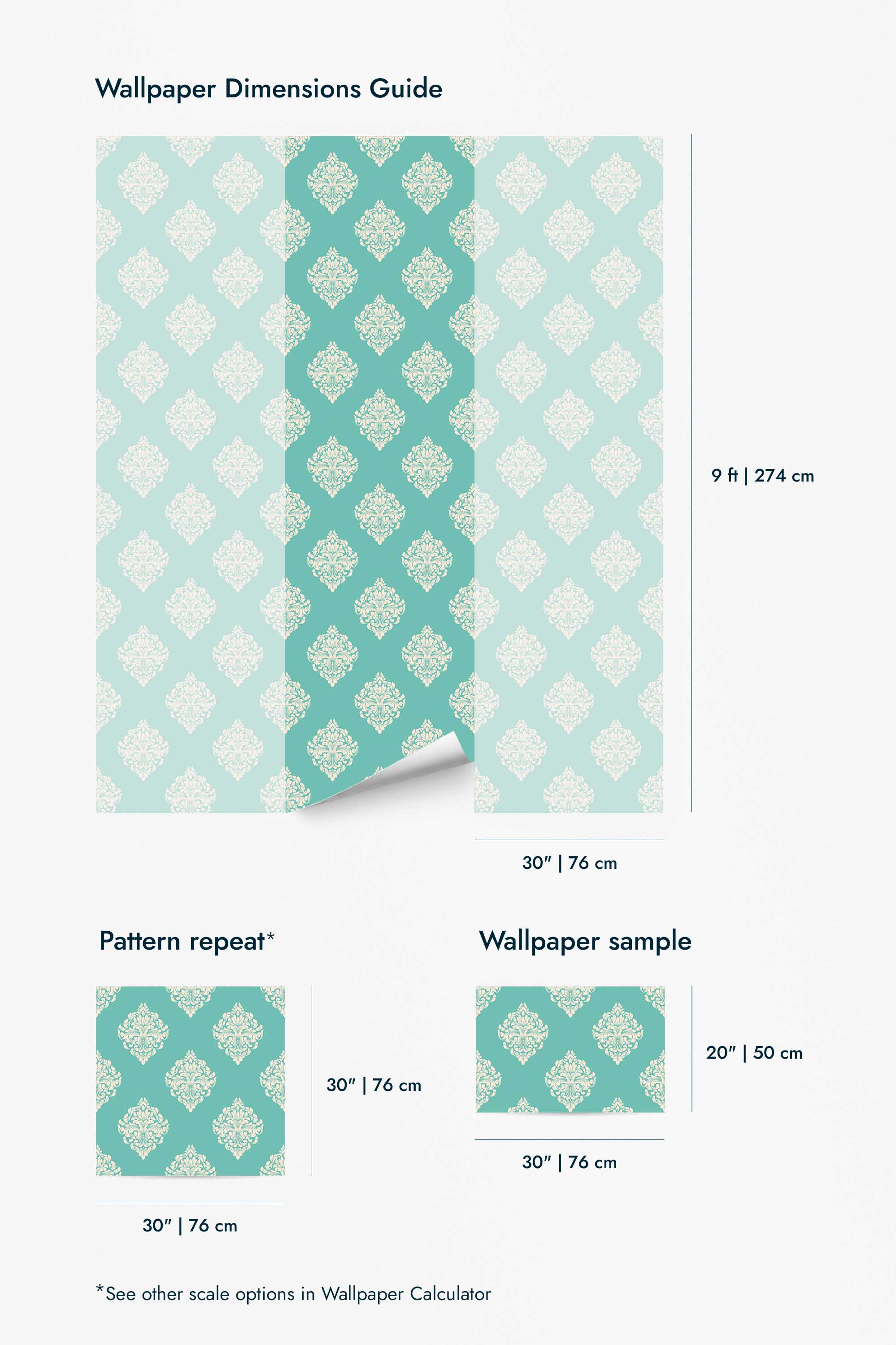 Damask wallpaper brings a vintage flair to your living room with its elegant mint green and teal hue, adorned with intricate beige motifs. This refined design doesn’t just elevate living rooms; it enhances any space with its luxurious and ornate charm. The Damask pattern is perfect for those seeking a classical and sophisticated touch in their interiors. Available in both peel and stick (self-adhesive – no glue needed, removable) and non-pasted (traditional application with glue) options, the peel and stick version is especially easy to apply, allowing for a seamless transformation. Embrace the joy of bringing color and life into your home with our PVC-free, beautifully crafted wall décor.