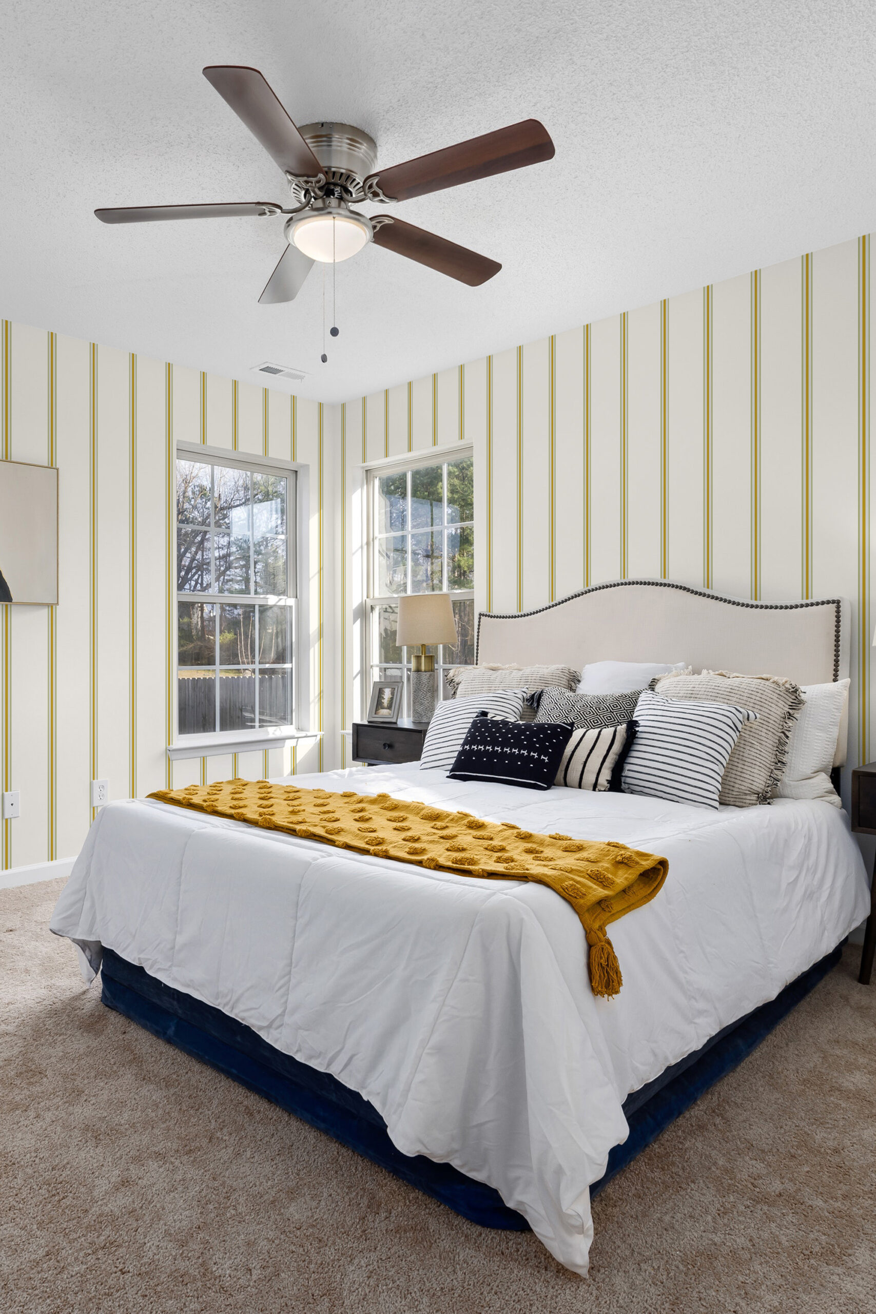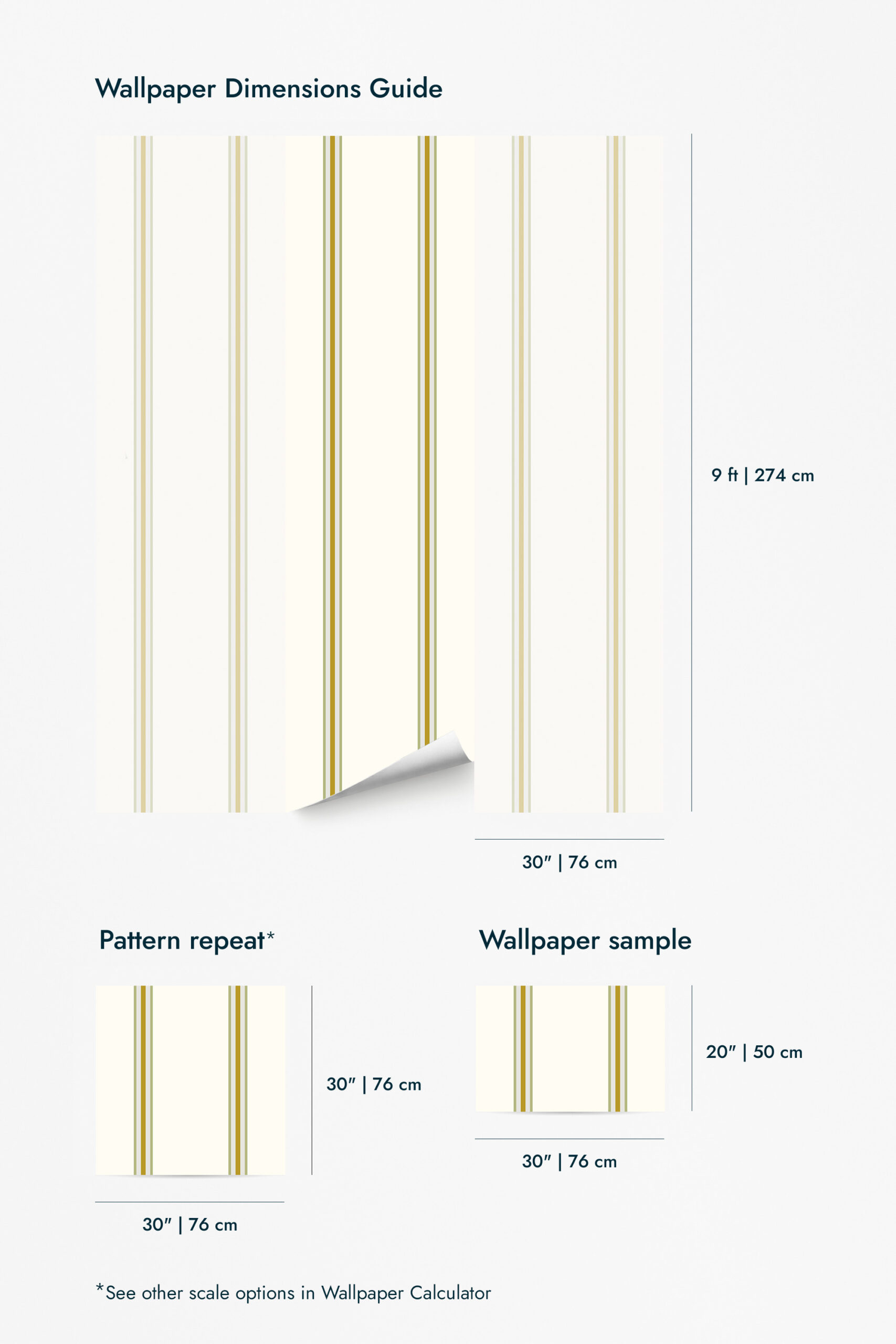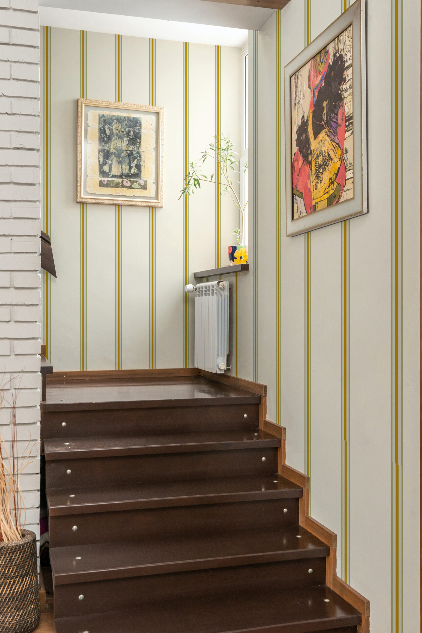 Fine Beige Striped Wallpaper brings a calm, tidy look to a hallway, helping the space feel taller and more pulled together. The design uses vertical stripes with alternating thick and thin bands that flow across the wall in an even rhythm. Mustard yellow and sage green lines add a soft pop of color without feeling busy. Set on an off-white base, the overall look stays light and minimalist. It also works well in an entryway or home office for a clean, structured finish.