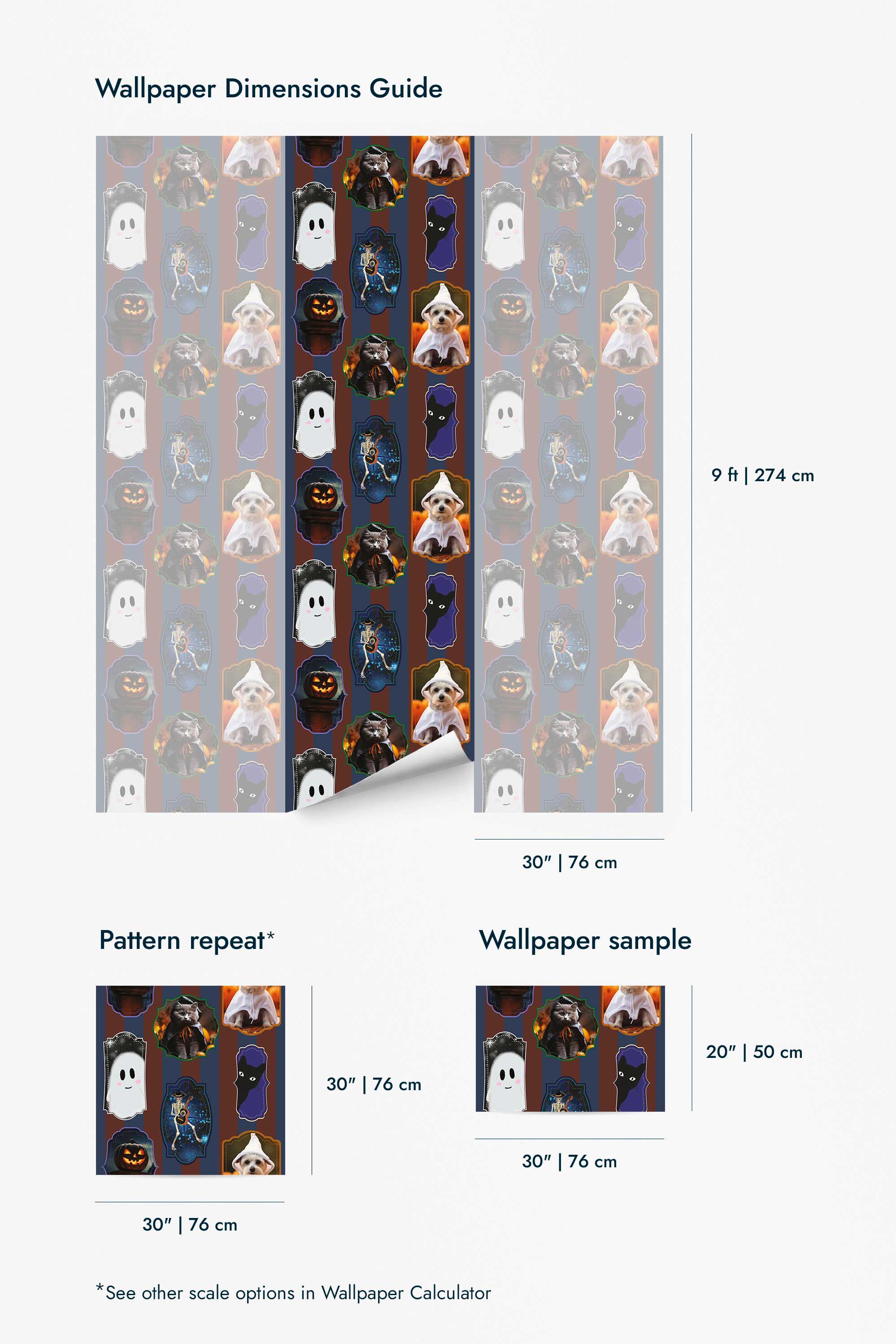 This Framed Halloween peel and stick wallpaper installs easily without glue and removes without hassle, while the non pasted version provides a traditional, long lasting finish. Both types are PVC free and printed with GreenGuard Gold certified inks, ensuring vivid color and safe indoor air. Funny Halloween Frames wallpaper brings joy and creativity to interiors, designed to inspire while staying beautifully crafted and safe for everyday living.Wallpaper Highlights