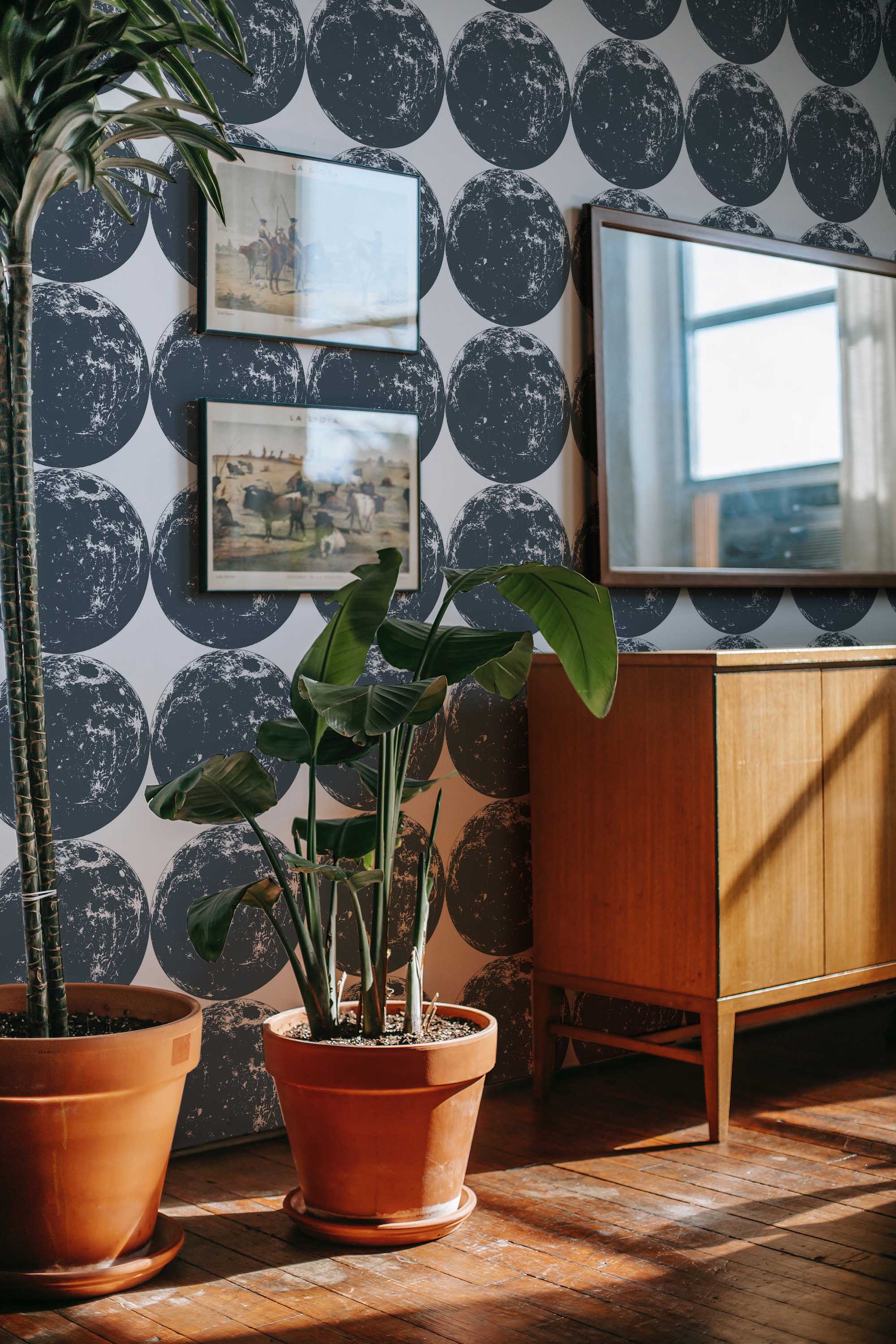 Full Moon wallpaper brings bold geometric style with a charcoal gray palette and a seamless lunar repeat that feels modern and timeless. The moon motif adds an abstract edge, making it a striking choice for accent walls, bedrooms, offices, or living areas. Its clean balance of shape and tone gives depth and a subtle cosmic vibe.