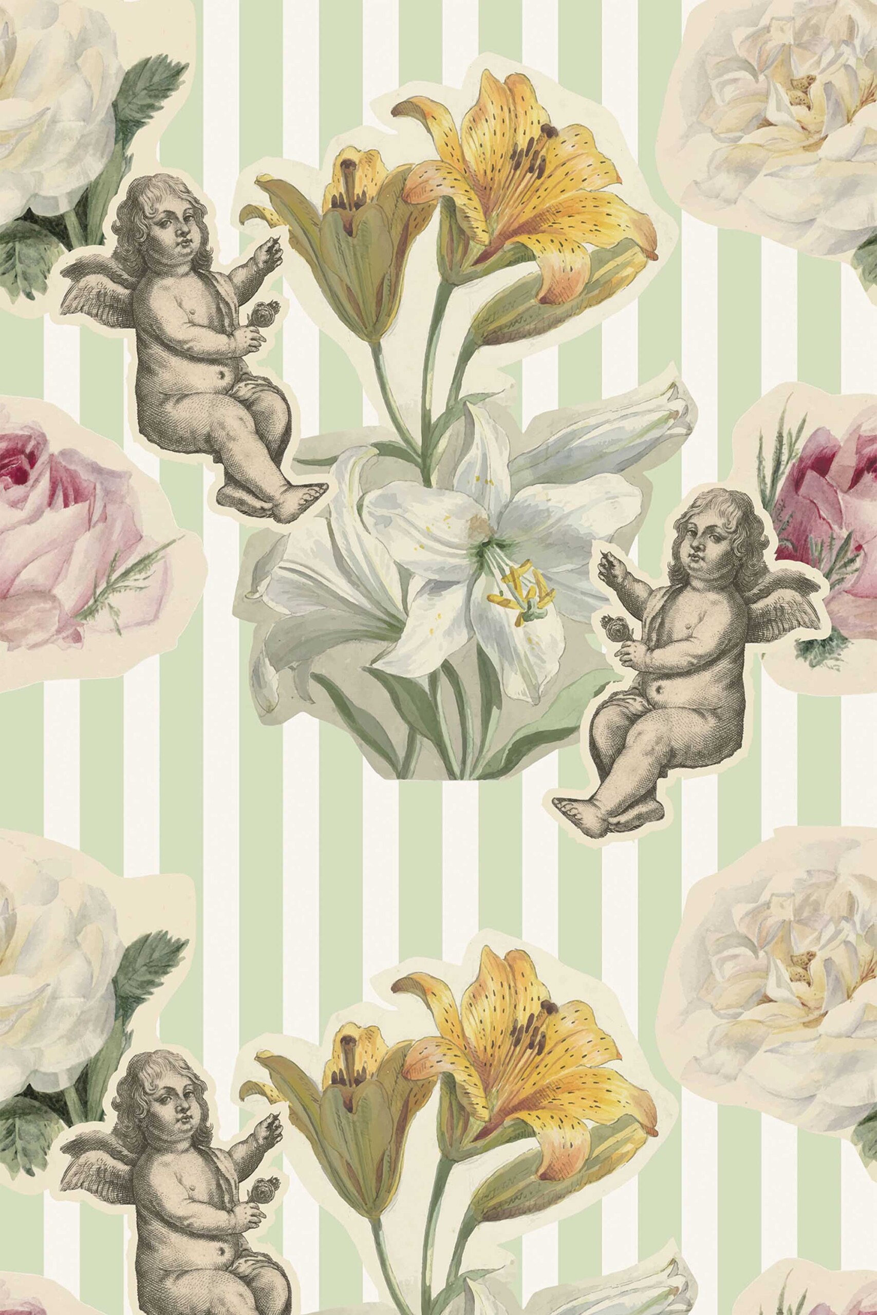 Fun Vintage Angel wallpaper brings storybook magic to your walls with soft sage green stripes, classical cherubs, and blooming florals. The design features a harmonious mix of vintage lilies, elegant angels, and nostalgic collage-style detailing. Set against a vertically striped background, it blends the sweetness of past eras with a polished, modern structure. This wallpaper creates a sense of grace and delight, perfect for styling cozy beauty salons, retro nurseries, or charming cottage-inspired interiors.