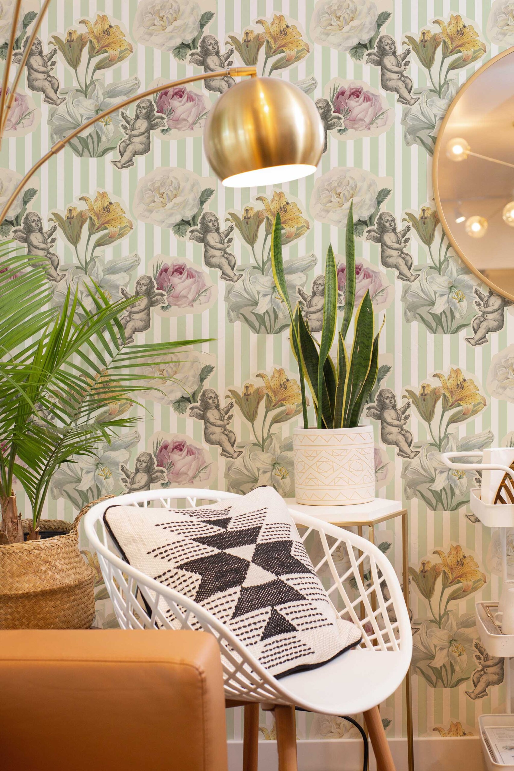 The sage green tone grounds the design in serenity, while the playful cherubs and soft petals offer a dreamy, romantic mood. Because the elements are evenly spaced, the pattern feels decorative without being overwhelming. It pairs beautifully with wooden textures, vintage furniture, or floral accents, making it a versatile choice for traditional, eclectic, or cottagecore spaces. Whether you’re designing a boutique corner or a personal retreat, this wallpaper invites calm and curiosity.