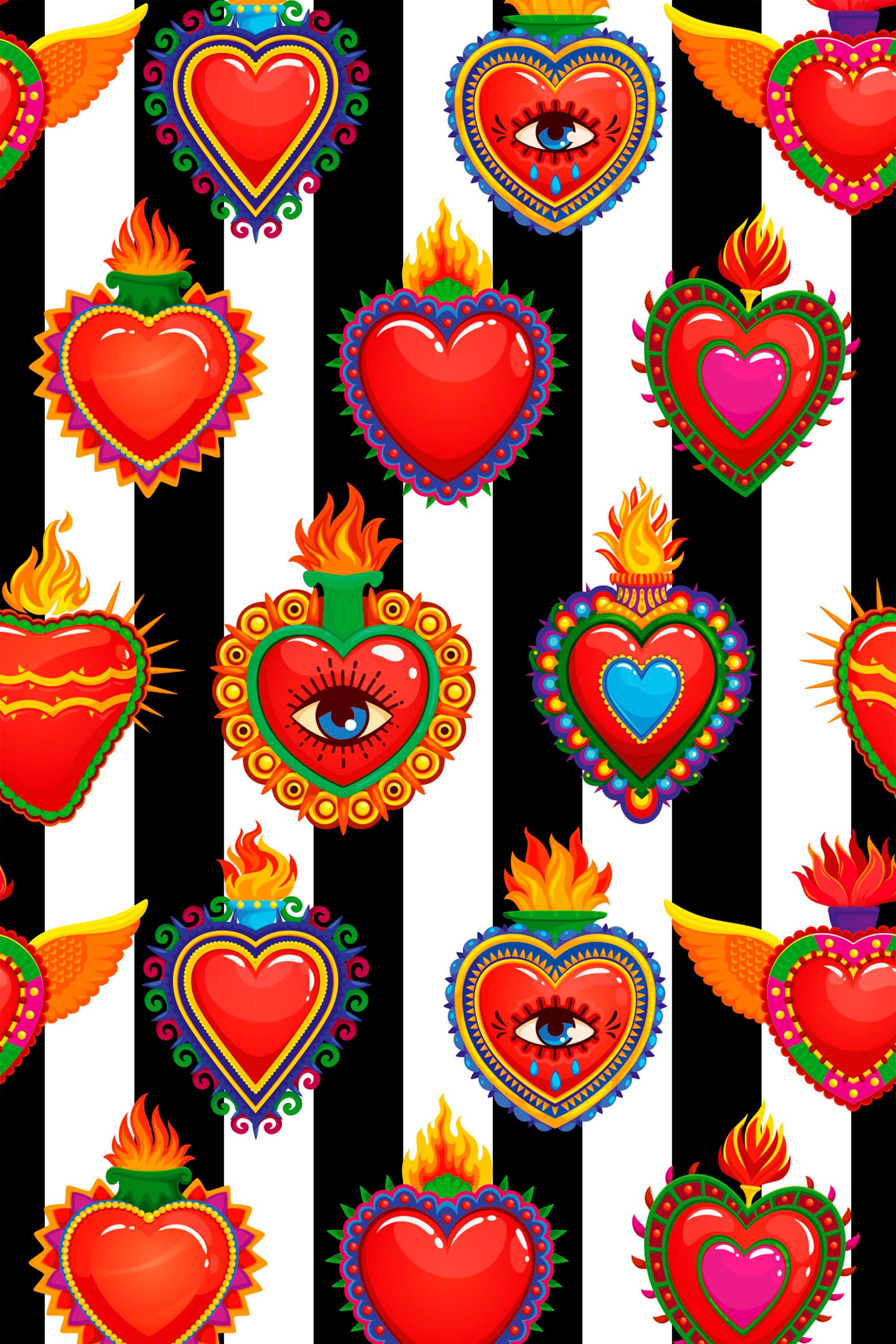 Funky Hearts with Flames wallpaper delivers a bold, colorful look with glossy cartoon hearts and fiery accents, making it perfect for playful bedrooms, creative studios, or statement walls. The lively striped layout adds rhythm while the bright palette keeps the mood fun and expressive. Funky Hearts with Flames peel and stick wallpaper installs easily with a removable, self-adhesive surface that suits both short-term refreshes and long-term styling. Funky Hearts with Flames brings high-energy Valentine vibes into modern interiors. Printed on eco-friendly, PVC-free materials using GreenGuard Certified inks, this wallpaper is safe for indoor use and ideal for renters or long-term decorating, and it is available in removable, self-adhesive, and non-pasted formats.