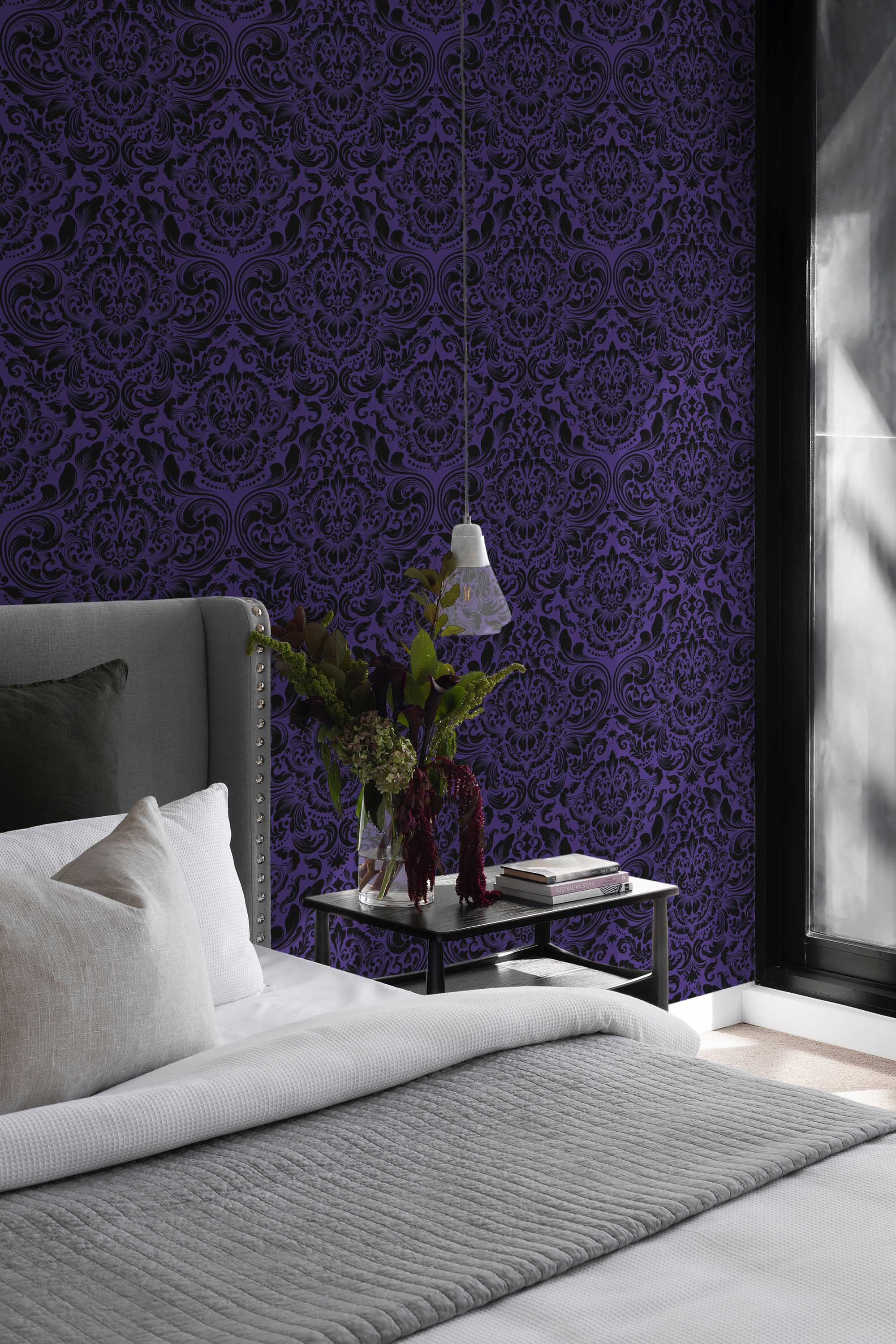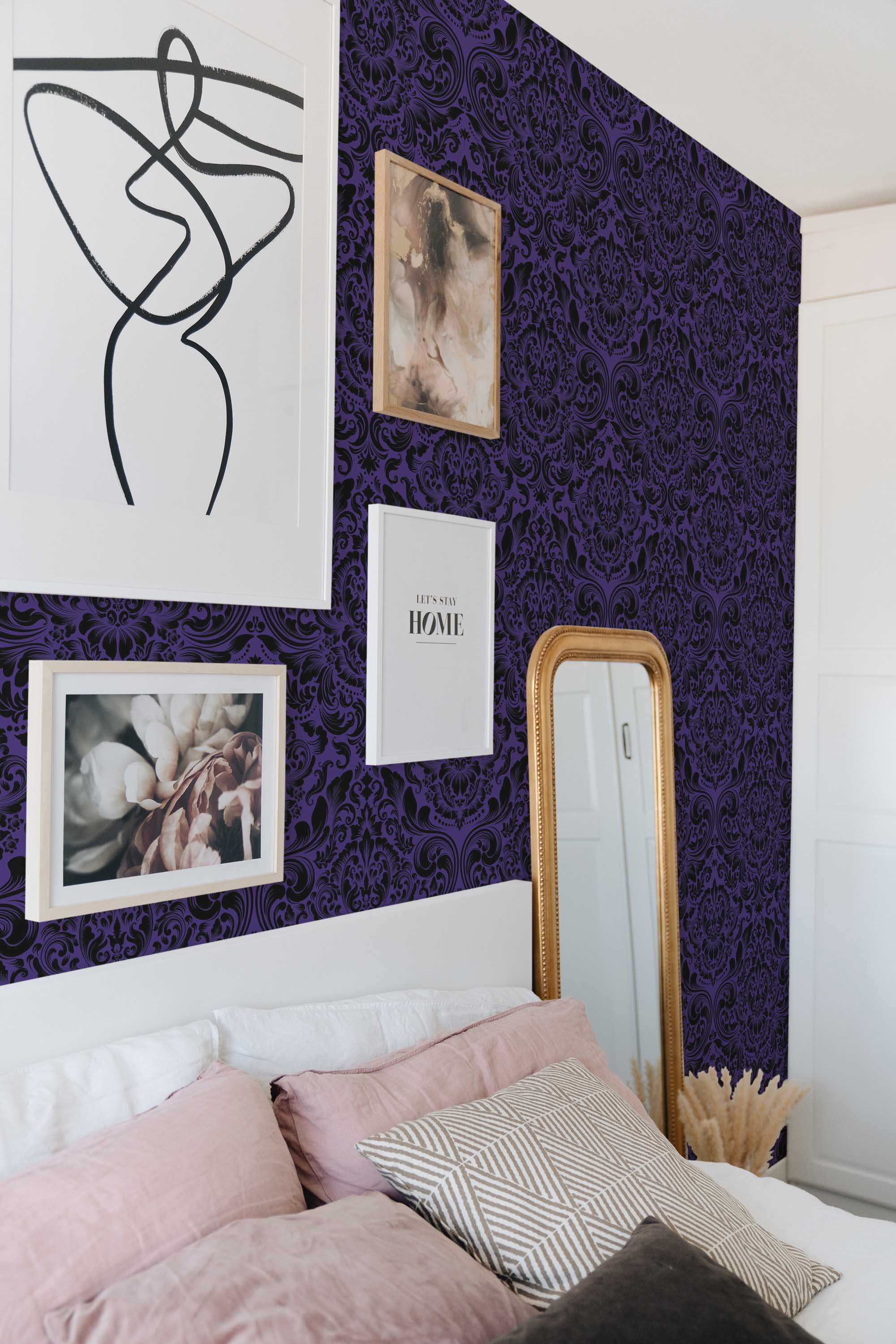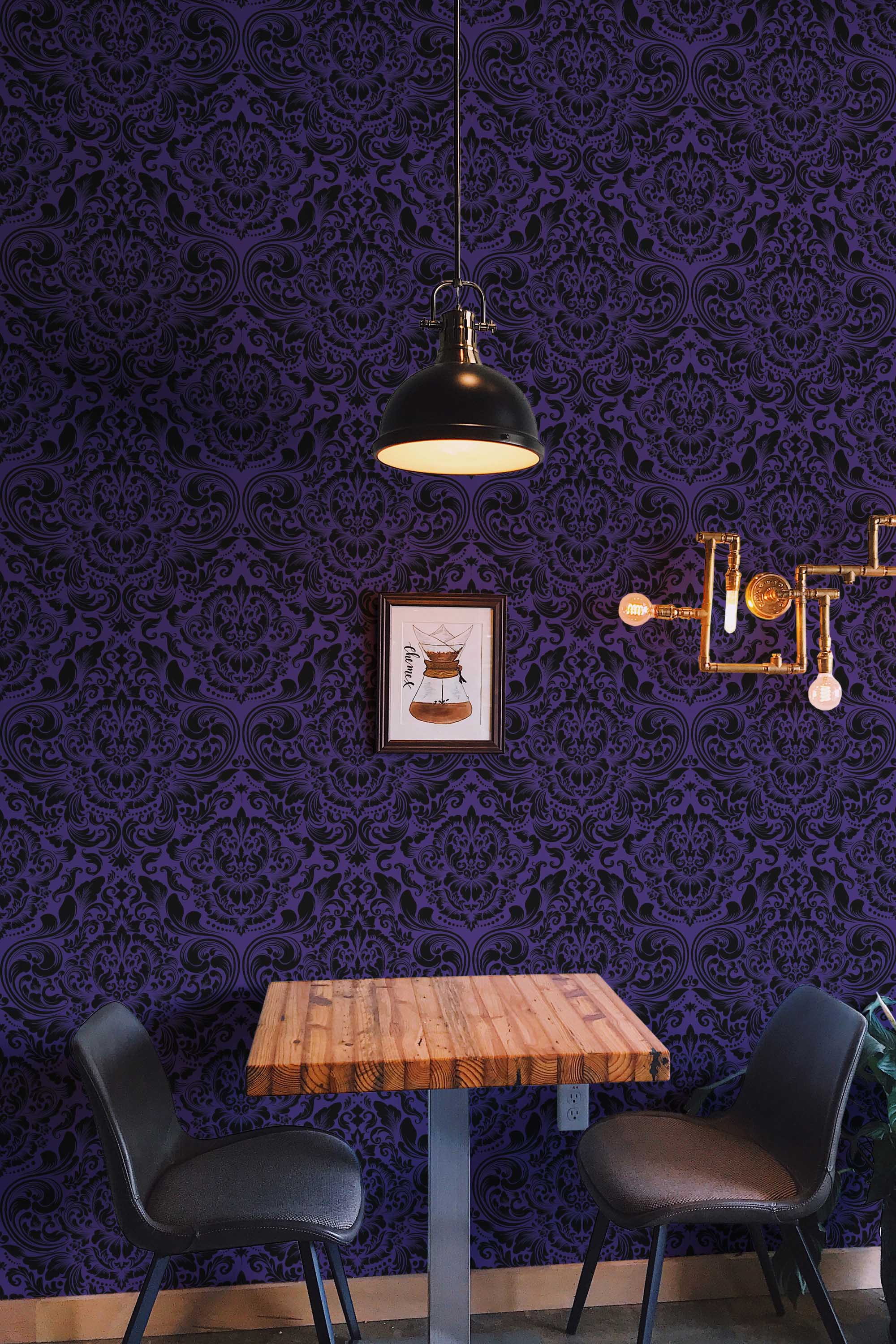 Gothic Damask wallpaper brings moody sophistication and timeless elegance to your space. Its seamless dark purple and black damask pattern, inspired by vintage Victorian design, adds depth and drama to accent walls or cozy interiors. The intricate detailing creates a rich, luxurious atmosphere perfect for bold, character-filled spaces.