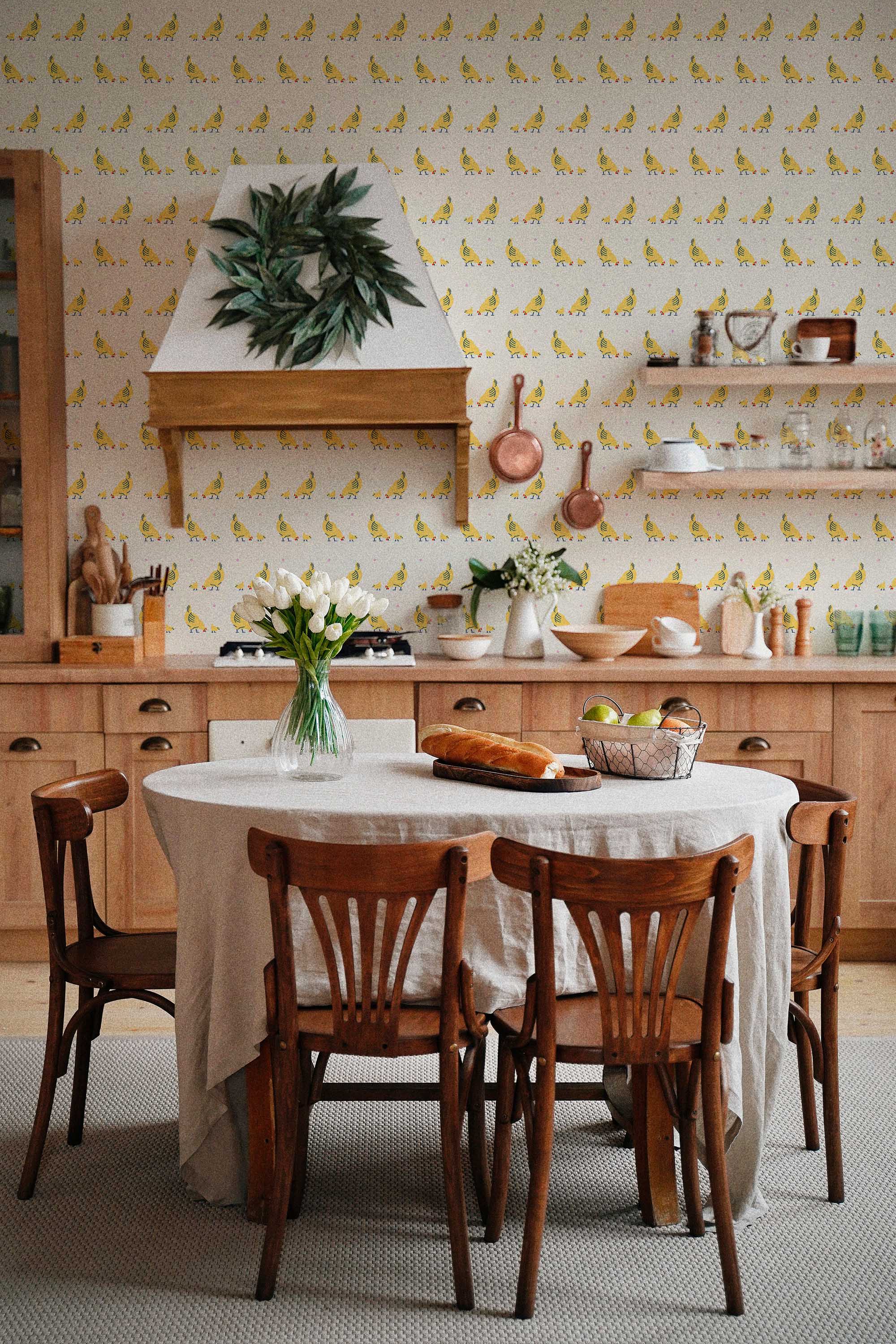 Graphic Chicken Wallpaper brings cheerful farmhouse energy to kitchens with a bright yellow backdrop covered in charming repeating chickens. The sunny palette instantly warms the room, while the simple graphic layout keeps the look clean and balanced. Moreover, the playful pattern adds personality without overwhelming cabinets or dining spaces, making it perfect for cozy breakfast nooks and welcoming interiors.