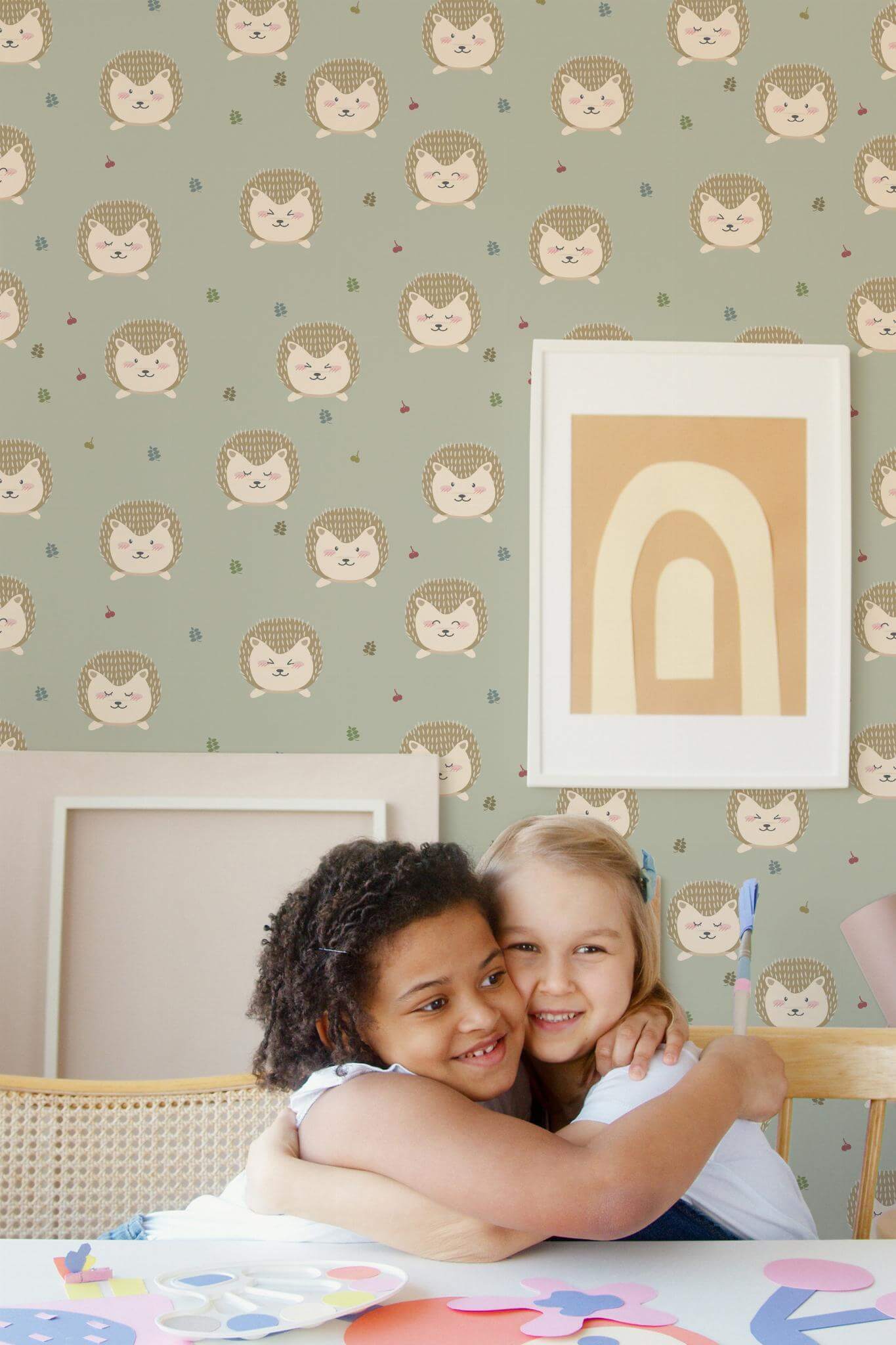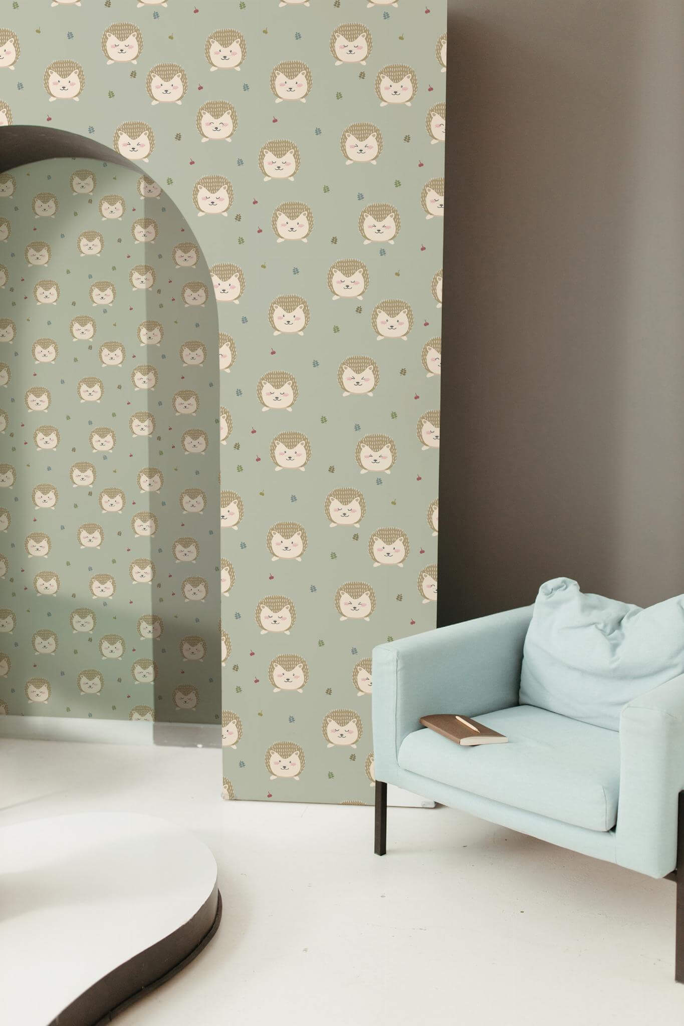 Hedgehog animal print wallpaper is a delightful addition to any kids’ room, featuring a cute Kawaii style with a calming sage green backdrop and charming beige accents. This playful and whimsical design, with its friendly hedgehog motifs and scattered leaves, brings a touch of nature and warmth to your space. Whether you choose the peel and stick option, which is easy to apply and removable, or the traditional non-pasted version, the Hedgehog animal print wallpaper will transform any room into a charming haven. Let the adorable design inspire joy and creativity in your child’s space or add a touch of whimsy to other areas of your home. Experience the joy of color and life with our innovative, PVC-free wall décor, designed to bring smiles and inspiration to homes worldwide.