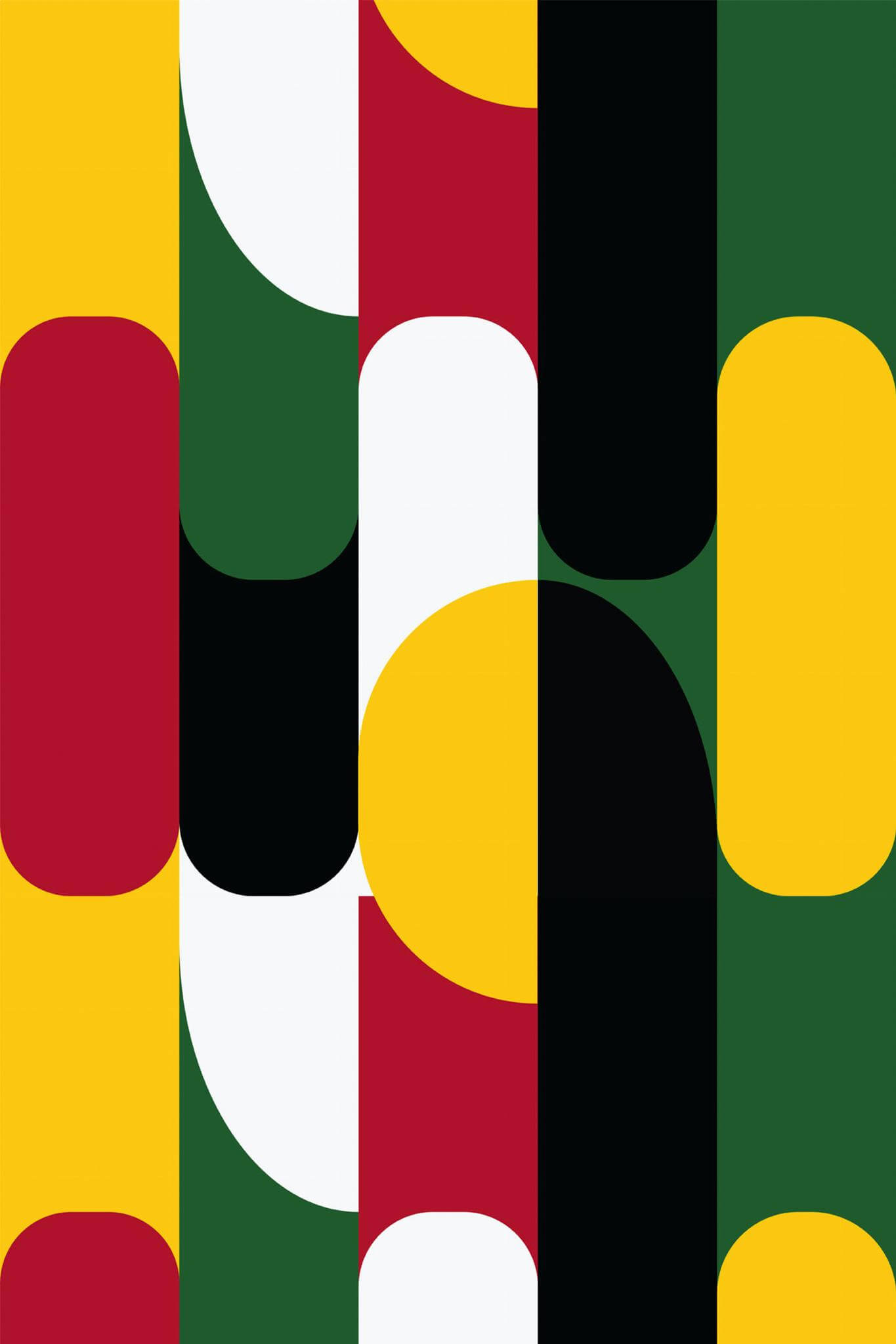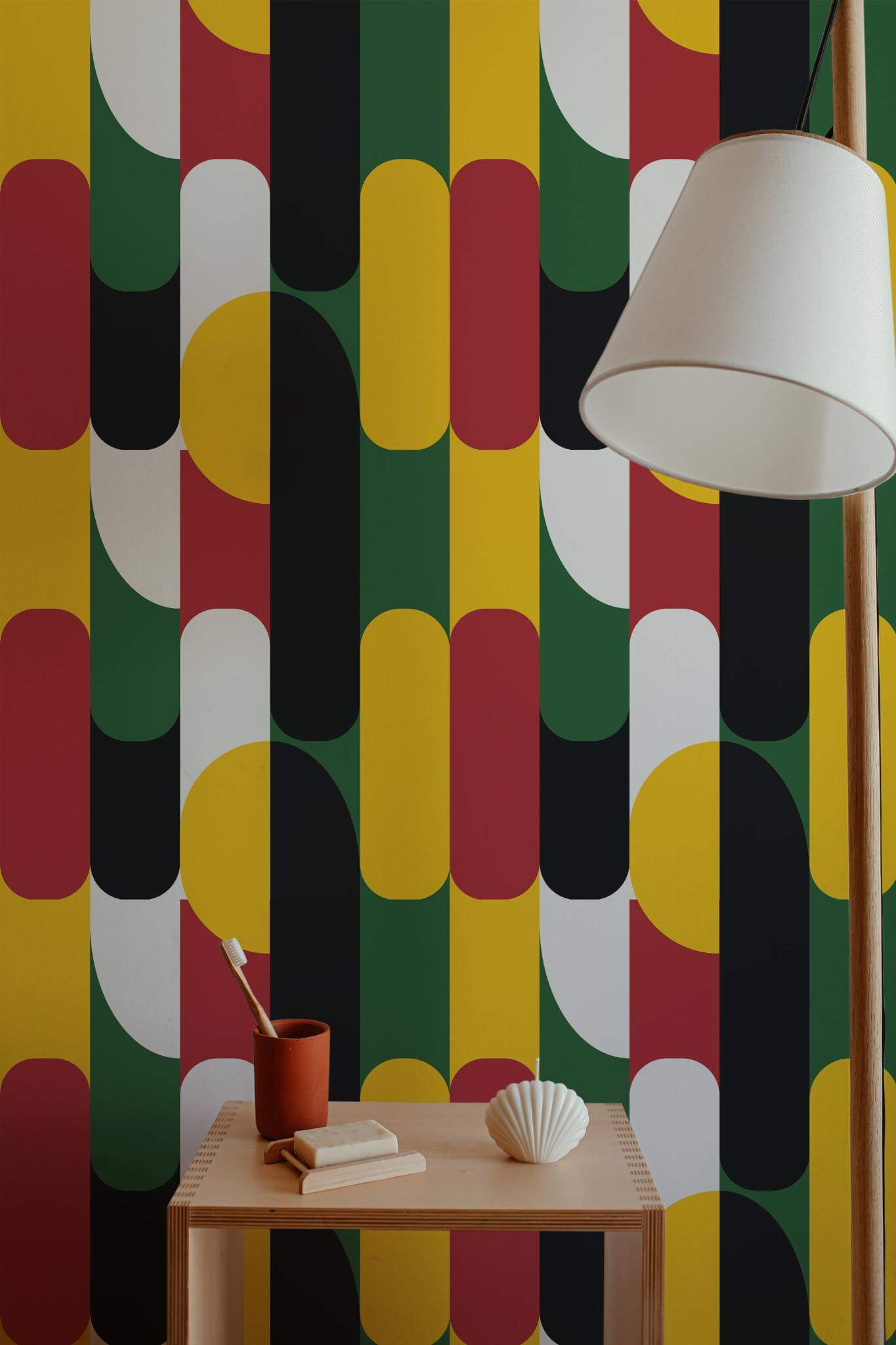 Junetheenth wallpaper brings a bold and vibrant touch to any hallway with its colorful geometric pattern featuring striking arcs and rectangles in red, yellow, and green against a dynamic black and white backdrop. This design is more than just a statement piece for hallways; it infuses energy and playfulness into any room, transforming your space into a modern and contrasting masterpiece. The Junetheenth wallpaper is available in both a peel and stick option, which is easy to apply and remove without glue, and a non-pasted option requiring traditional application with glue. Let Junetheenth inspire your interiors, celebrating the joy of color and life while being part of a global effort to provide safe, PVC-free wall décor for every home.