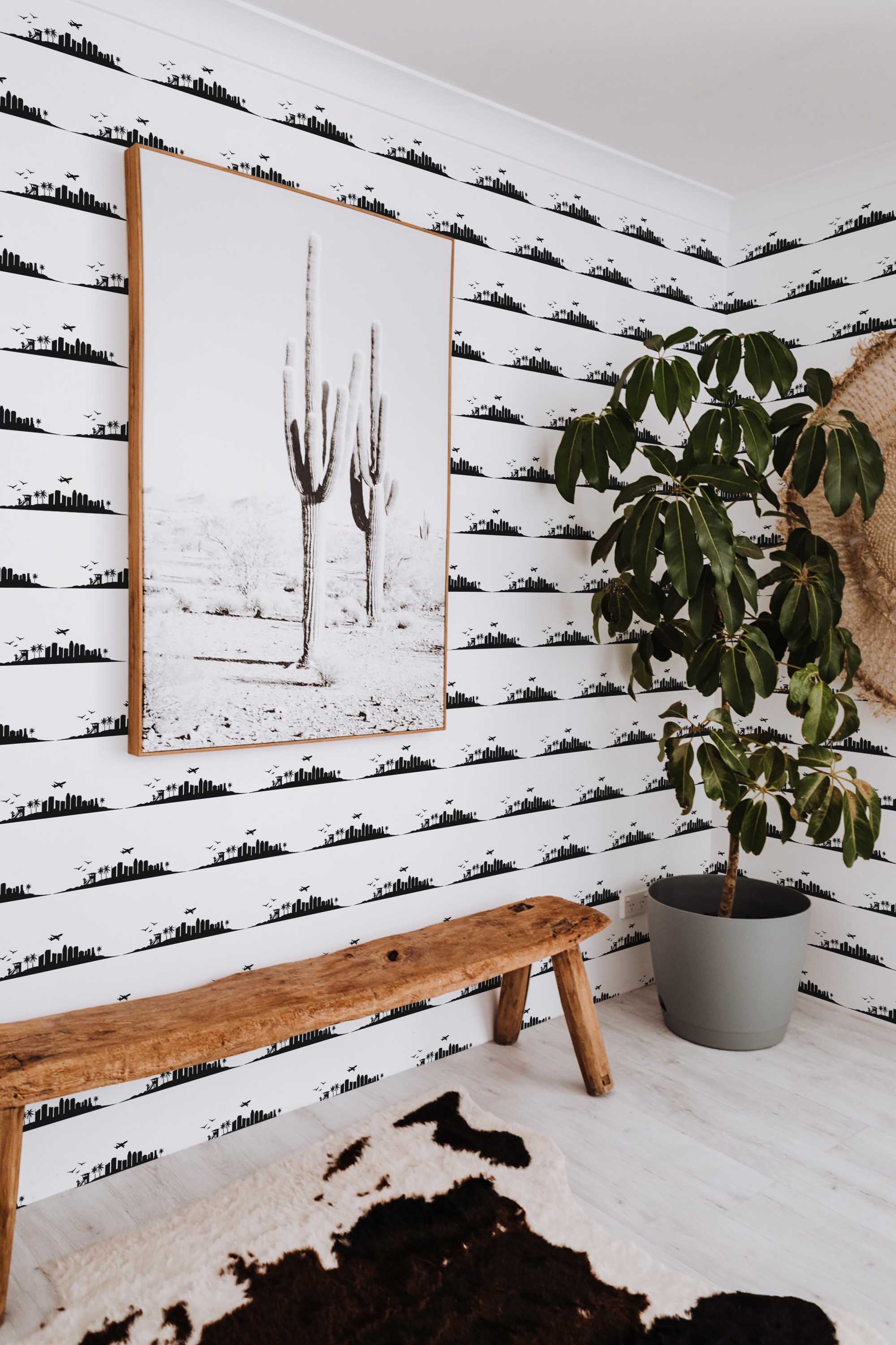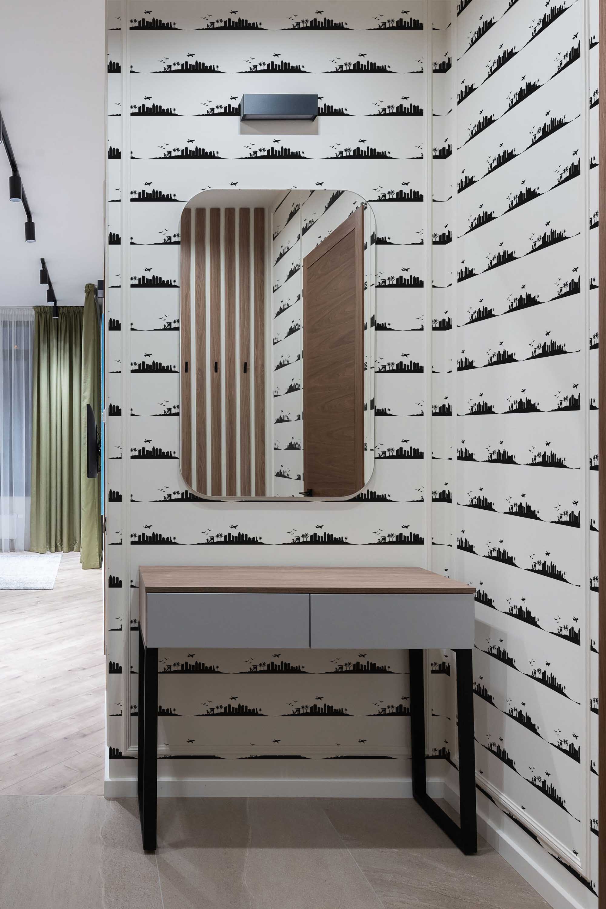 Los Angeles Skyline Wallpaper brings a sleek metropolitan energy to your space with bold black horizontal stripes forming a panoramic view of the city. The linear skyline creates a modern, graphic rhythm that works beautifully in hallways where movement and visual flow matter. Its clean contrast adds depth without overwhelming the décor, making it a versatile choice for contemporary homes or creative studios.