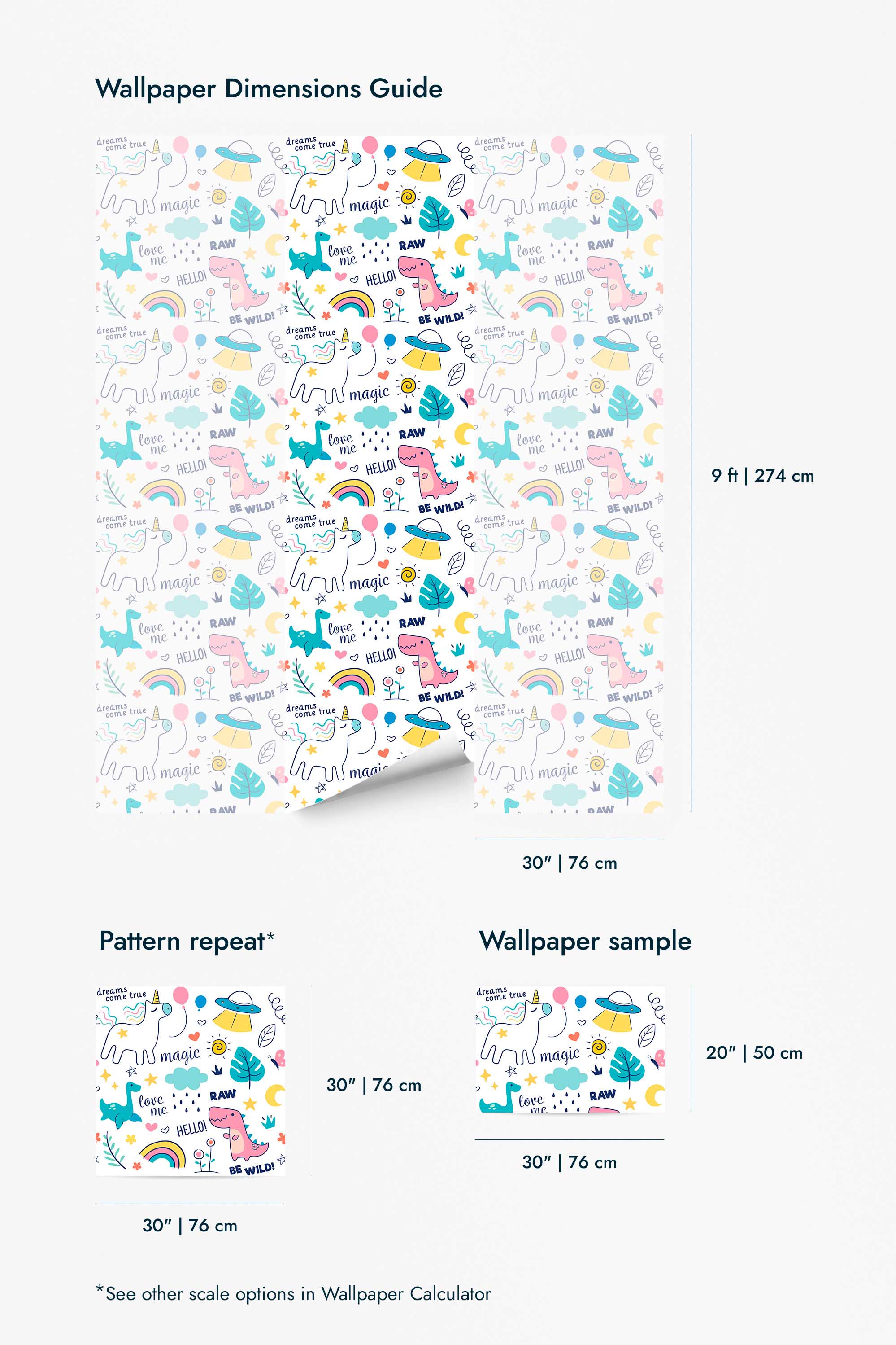 The Multicolor kids room wallpaper in a cute Kawaii style bursts with colorful charm, making it the perfect addition to any child’s room. Its whimsical unicorn and dinosaur pattern, adorned with rainbows, balloons, UFOs, stars, and butterflies, brings a playful and imaginative touch to your interiors. This vibrant design can transform not only kids’ rooms but any space in need of a splash of joy and creativity. Available in two options, the peel and stick version is self-adhesive, removable, and easy to apply, while the non-pasted option requires traditional glue application. Embrace the magic of the Multicolor kids room wallpaper and let its enchanting motifs bring a world of wonder to your home.