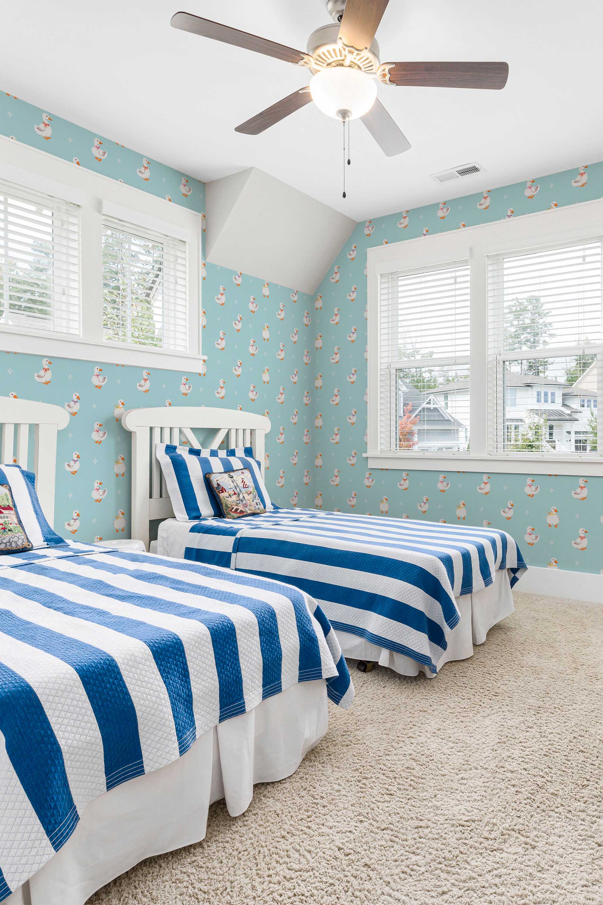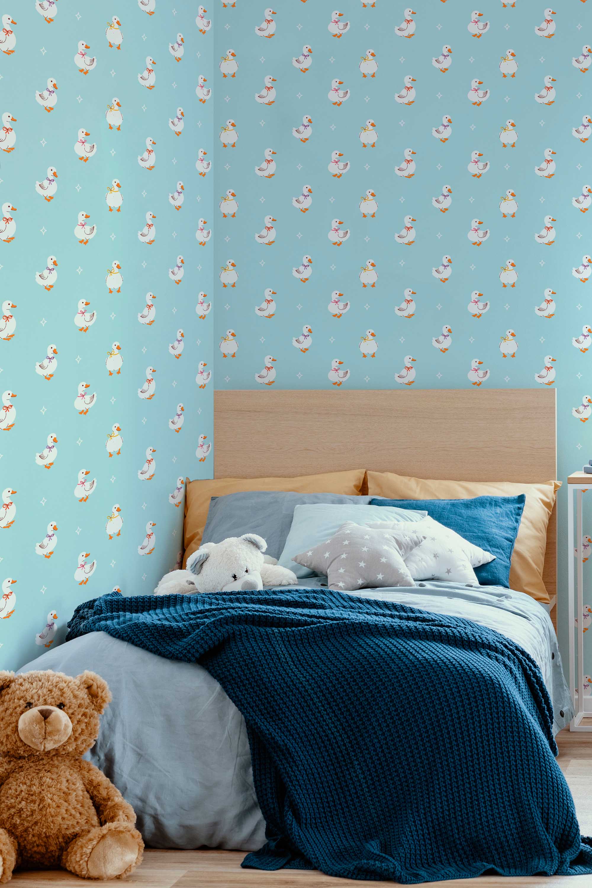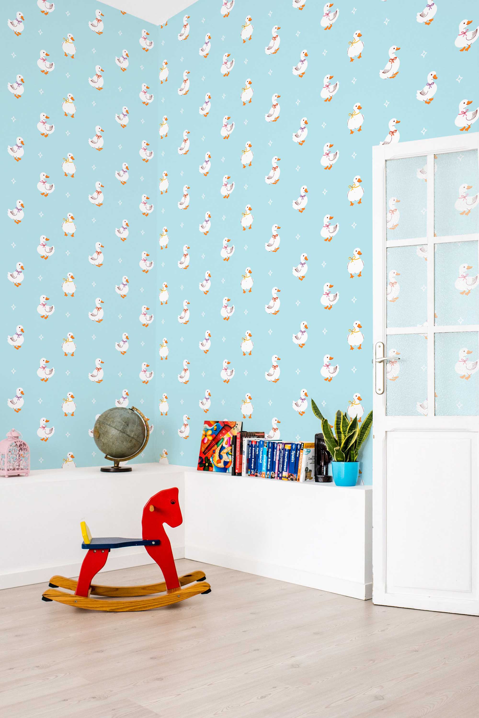 Duck Nursery wallpaper brings a cheerful, fun & funky style to your baby’s room with sweet yellow ducklings floating across a soft blue background. The Duck Nursery peel and stick wallpaper makes it easy to create a bright, playful atmosphere that feels both soothing and joyful. Duck Nursery adds a touch of charm with its cute duck pattern that keeps little ones engaged and smiling. Printed on eco-friendly, PVC-free materials using GreenGuard Certified inks, this wallpaper is safe for indoor use and ideal for renters or long-term decorating. It installs beautifully with its removable, self-adhesive, and non-pasted options, giving you flexibility and ease.