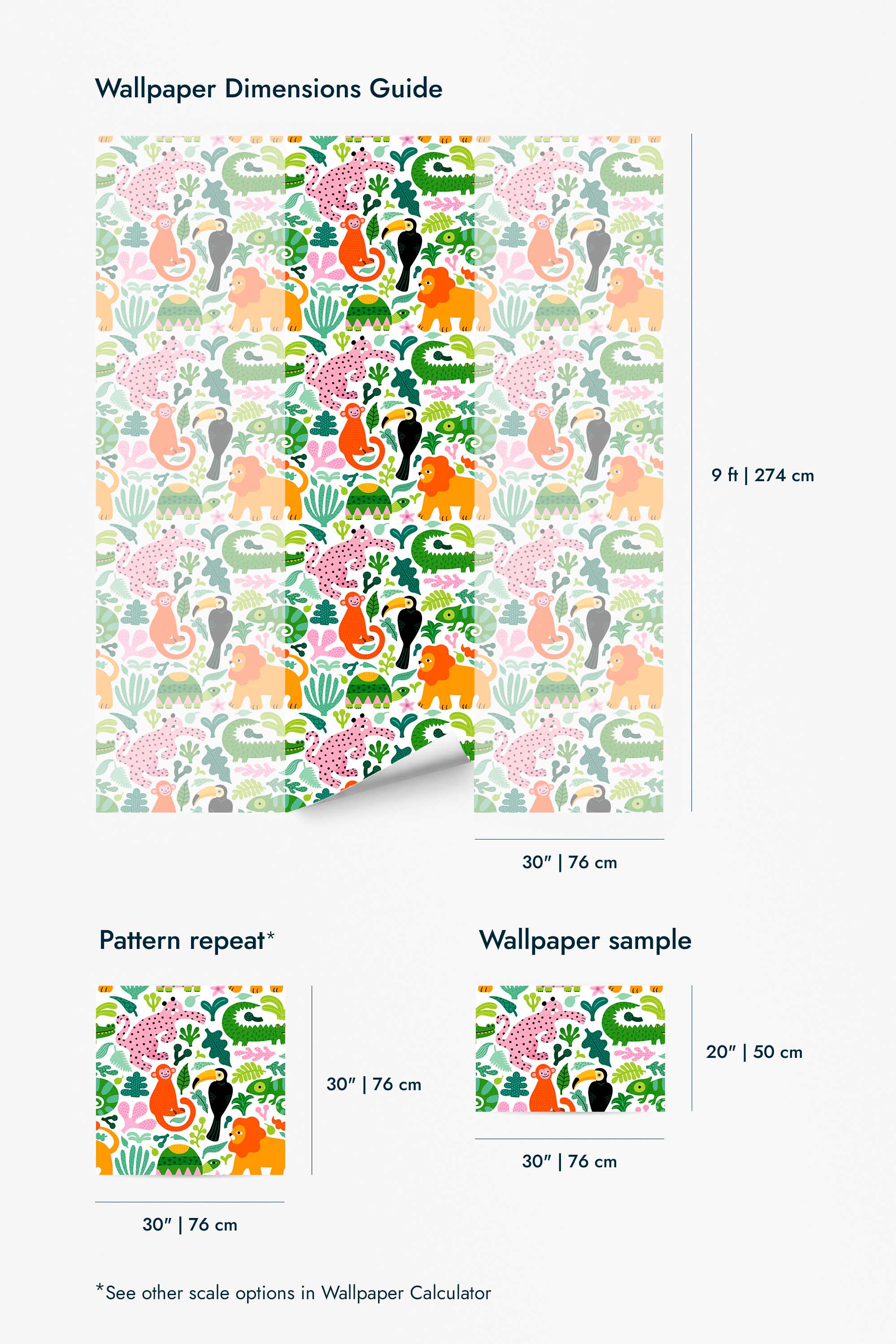 The Nursery Jungle peel and stick wallpaper installs easily with its self-adhesive backing, while the non-pasted version provides a smooth, traditional finish. Both wallpaper types are PVC-free and printed with GreenGuard Gold certified inks for vivid, safe color. Inspired by nature and passionate about color, Fancy Walls brings creativity to everyday spaces.Wallpaper Highlights