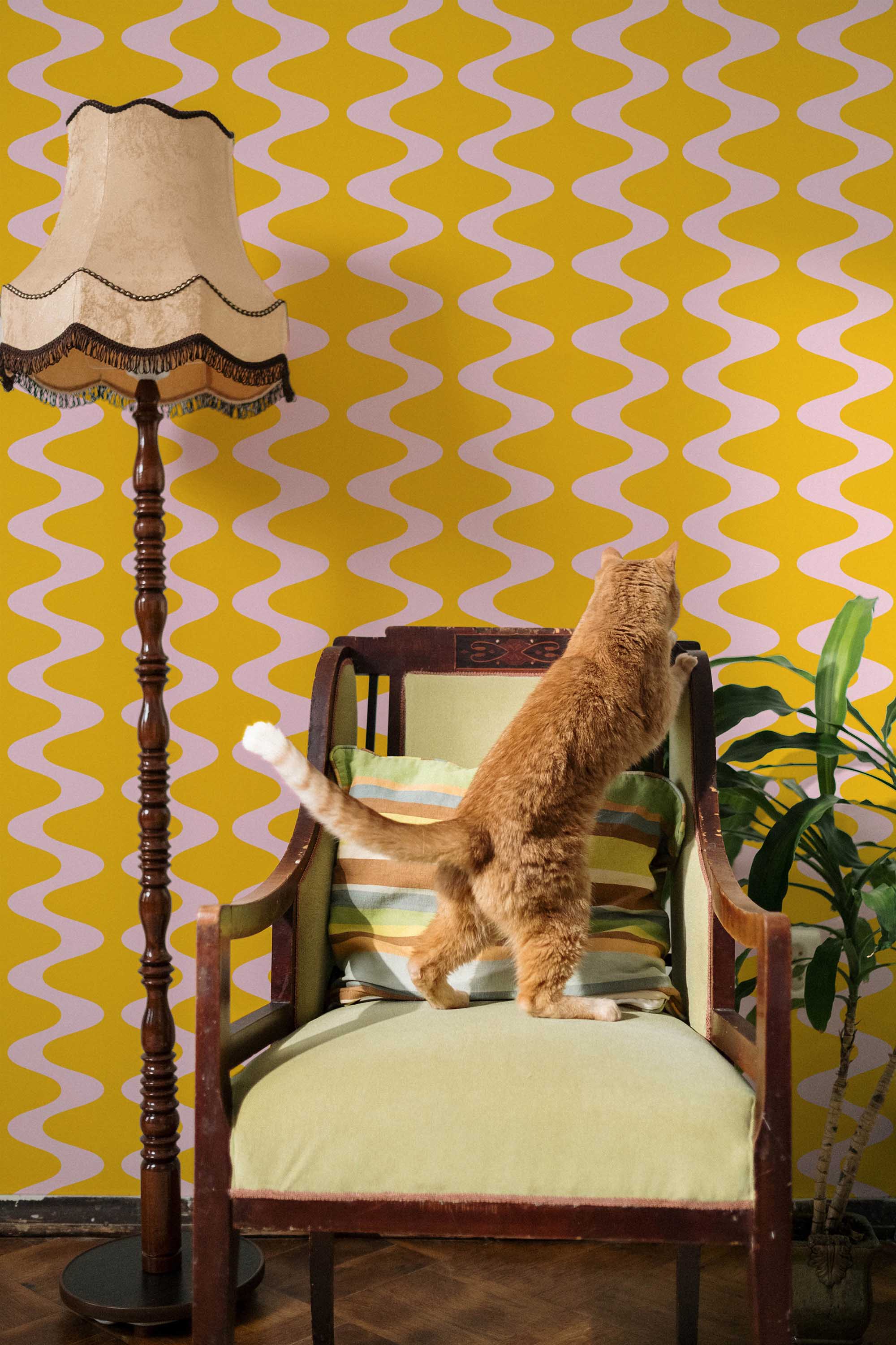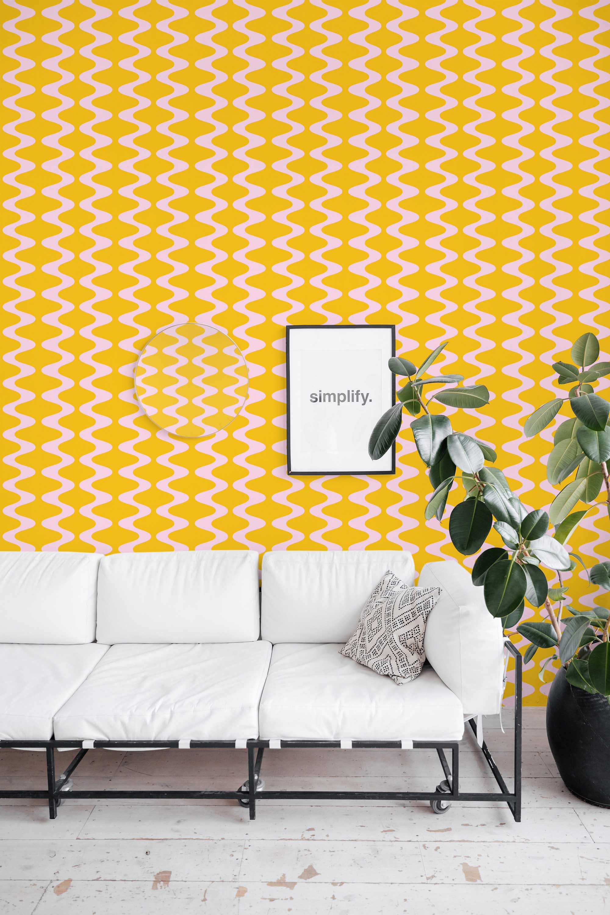 Orange and Pink Groove wallpaper brings a modern, energetic look to living rooms and creative spaces with its bold mustard-yellow tones and lively geometric movement. This groovy, neat, and bright composition in pink and orange creates a playful rhythm that feels vibrant, dynamic, and cheerful.