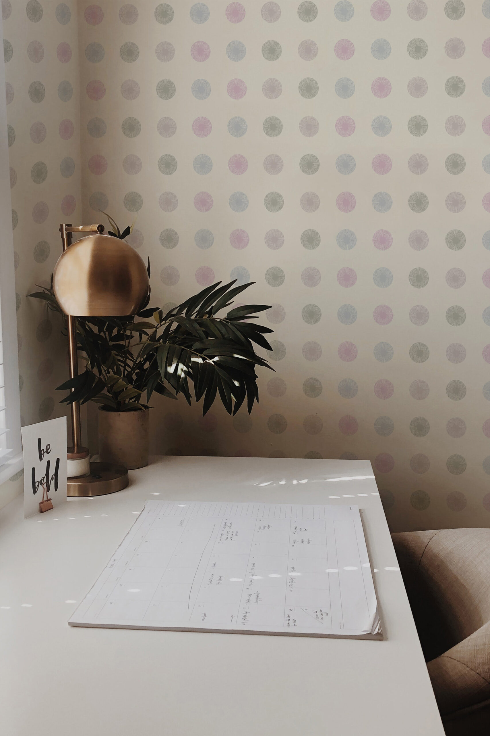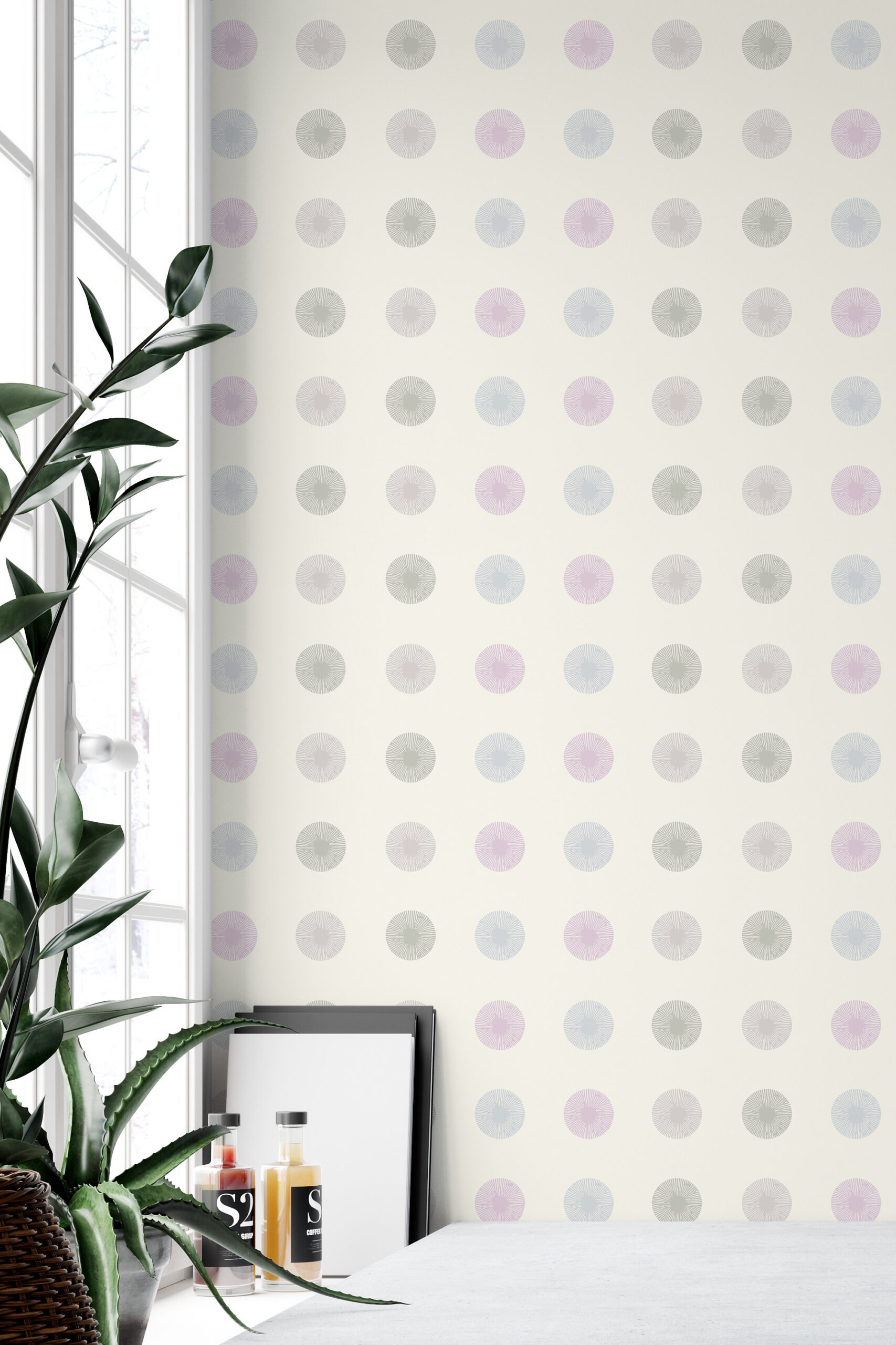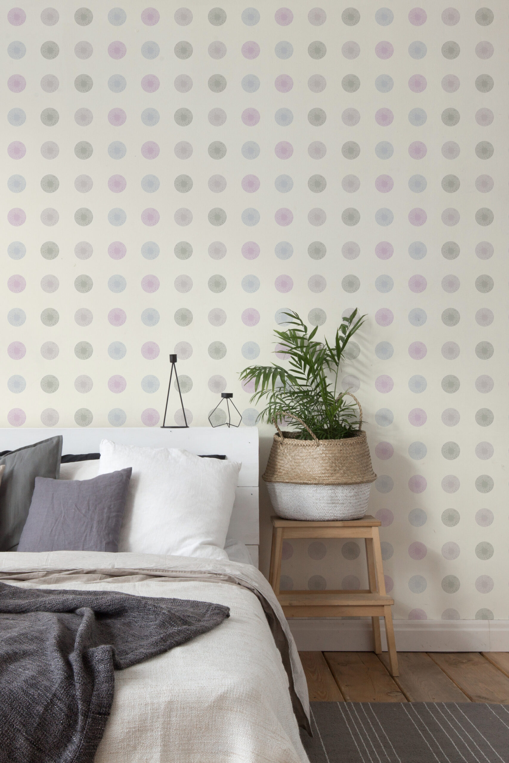 Pastel Sunburst Dots Wallpaper brings a calm, airy look to a bedroom with soft circles that feel playful but still tidy. The spaced grid of sunburst-style dots flows across the wall in pastel pink, light blue, and gentle gray with a touch of muted green. Set on an ivory background, the colors stay light and easy to live with. It works well as an accent wall behind the bed or across all four walls for a quiet, minimalist feel. You can also use it in a nursery, home office, or hallway to add a subtle pattern without making the room feel busy.