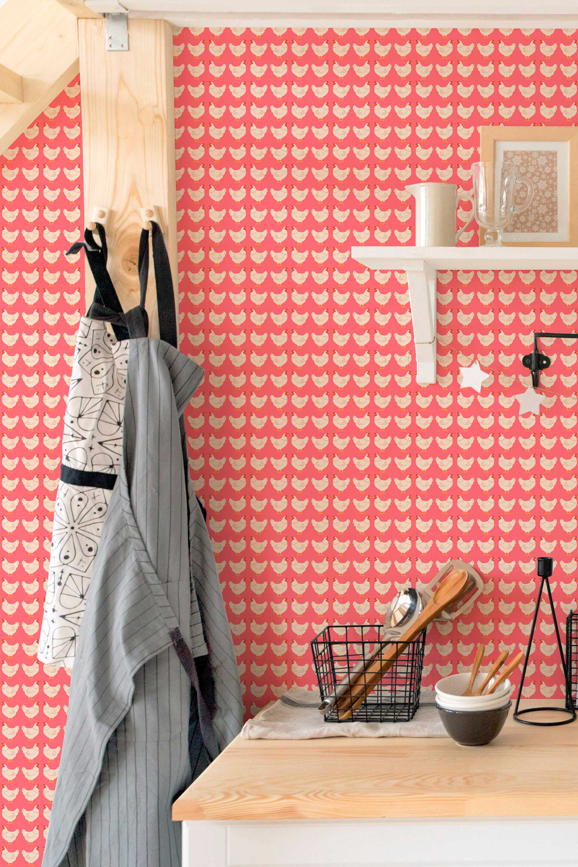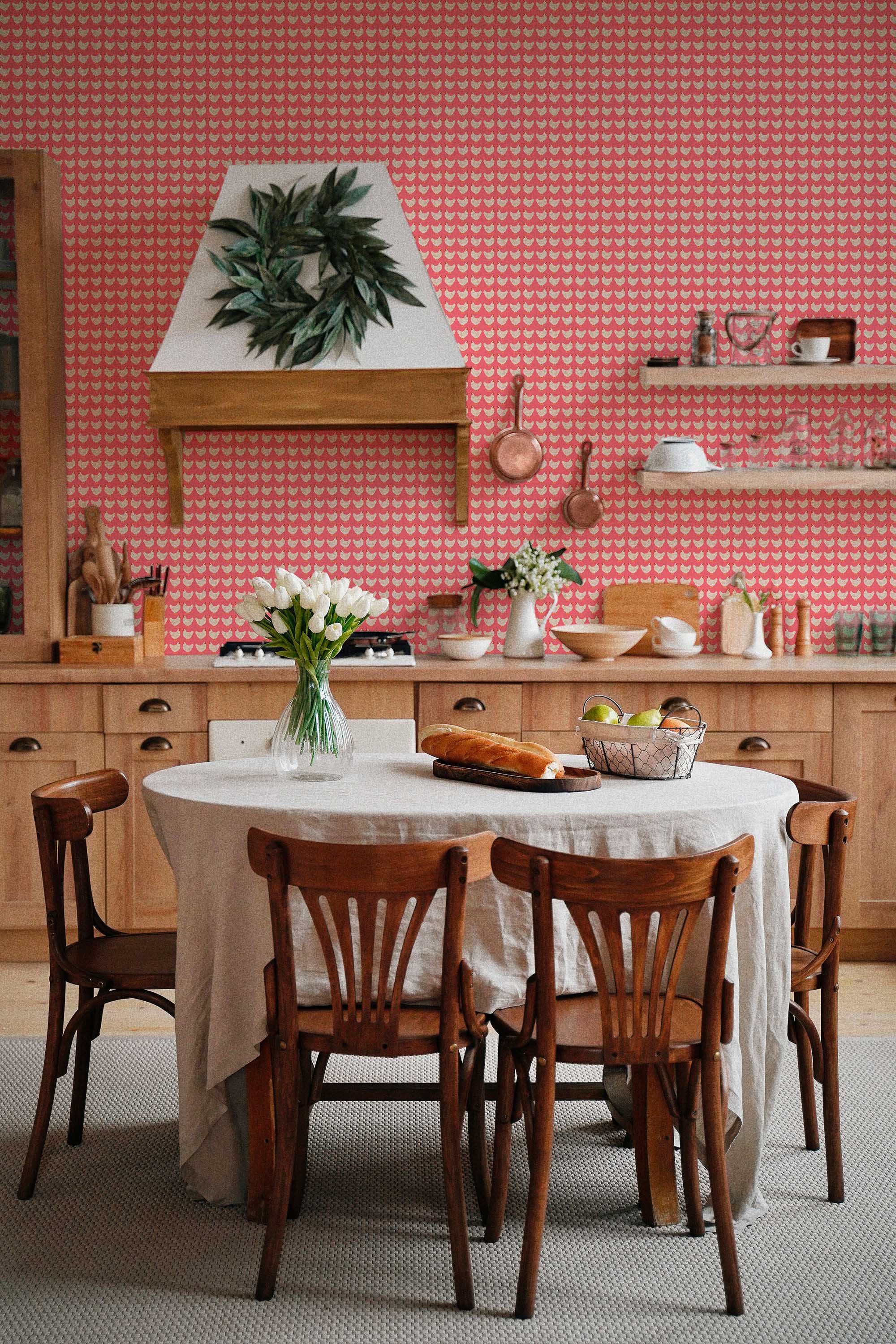 Hens on Pink wallpaper brings cozy farmhouse charm to your space with its sweet pink and red palette and is perfect for kitchens, breakfast nooks, or cottage dining rooms. A small hen pattern dances across a rich red background, creating a warm and welcoming chicken print that feels both playful and classic. The Hens on Pink peel and stick wallpaper makes decorating simple, whether you choose removable, self-adhesive, or non-pasted options for your home. Hens on Pink adds character with its repeating hen and chicken motif while keeping the look soft and inviting. Printed on eco-friendly, PVC-free materials using GreenGuard Certified inks, this wallpaper is safe for indoor use and ideal for renters or long-term decorating.