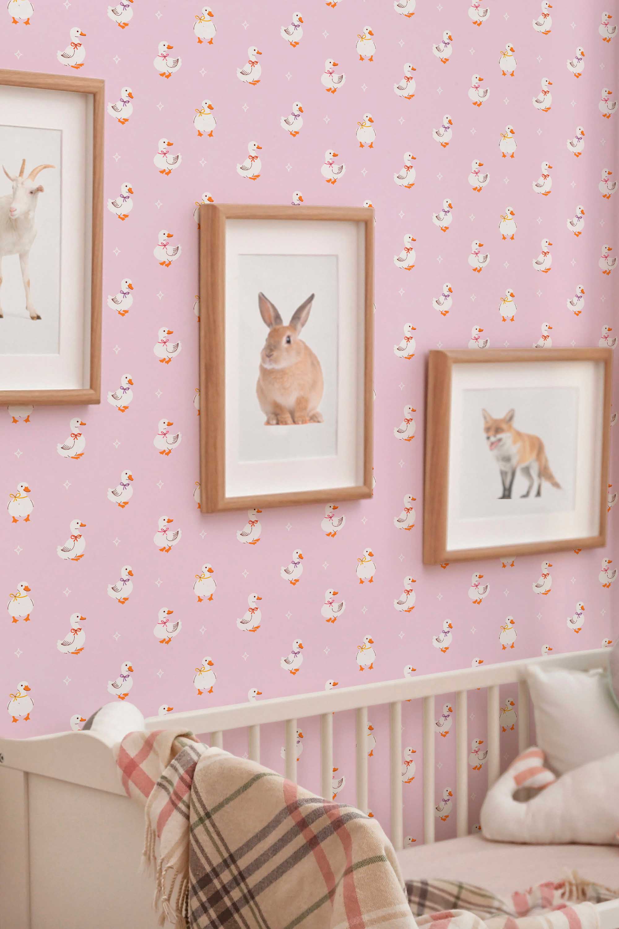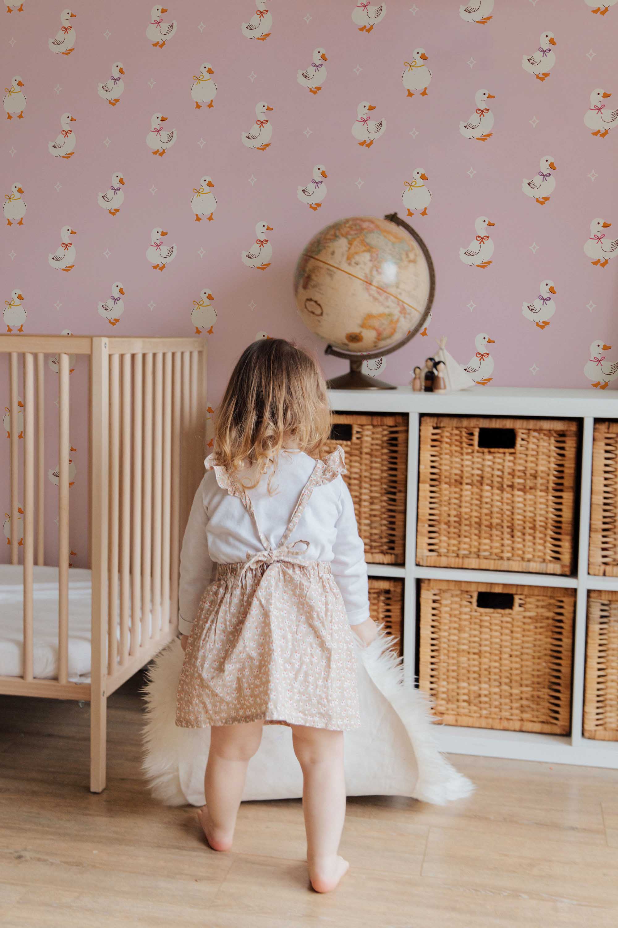 Pink Duck Nursery wallpaper brings a fun & funky charm to any baby’s room with adorable ducklings floating across a warm pink backdrop. The Pink Duck Nursery peel and stick wallpaper makes it easy to create a sweet, cheerful space filled with gentle color and playful character. Pink Duck Nursery adds a soft, friendly feel that complements modern nursery designs. Printed on eco-friendly, PVC-free materials using GreenGuard Certified inks, this wallpaper is safe for indoor use and ideal for renters or long-term decorating. It installs easily with its removable, self-adhesive, and non-pasted options, giving you flexibility for any baby room project.