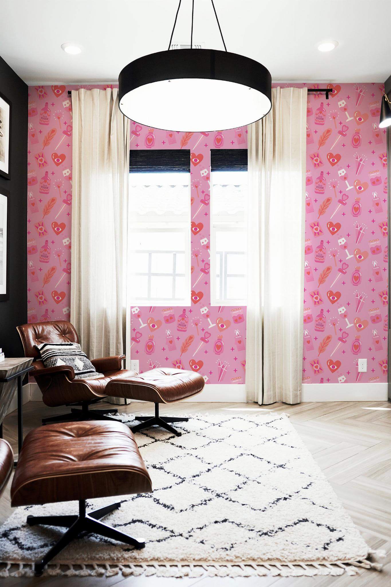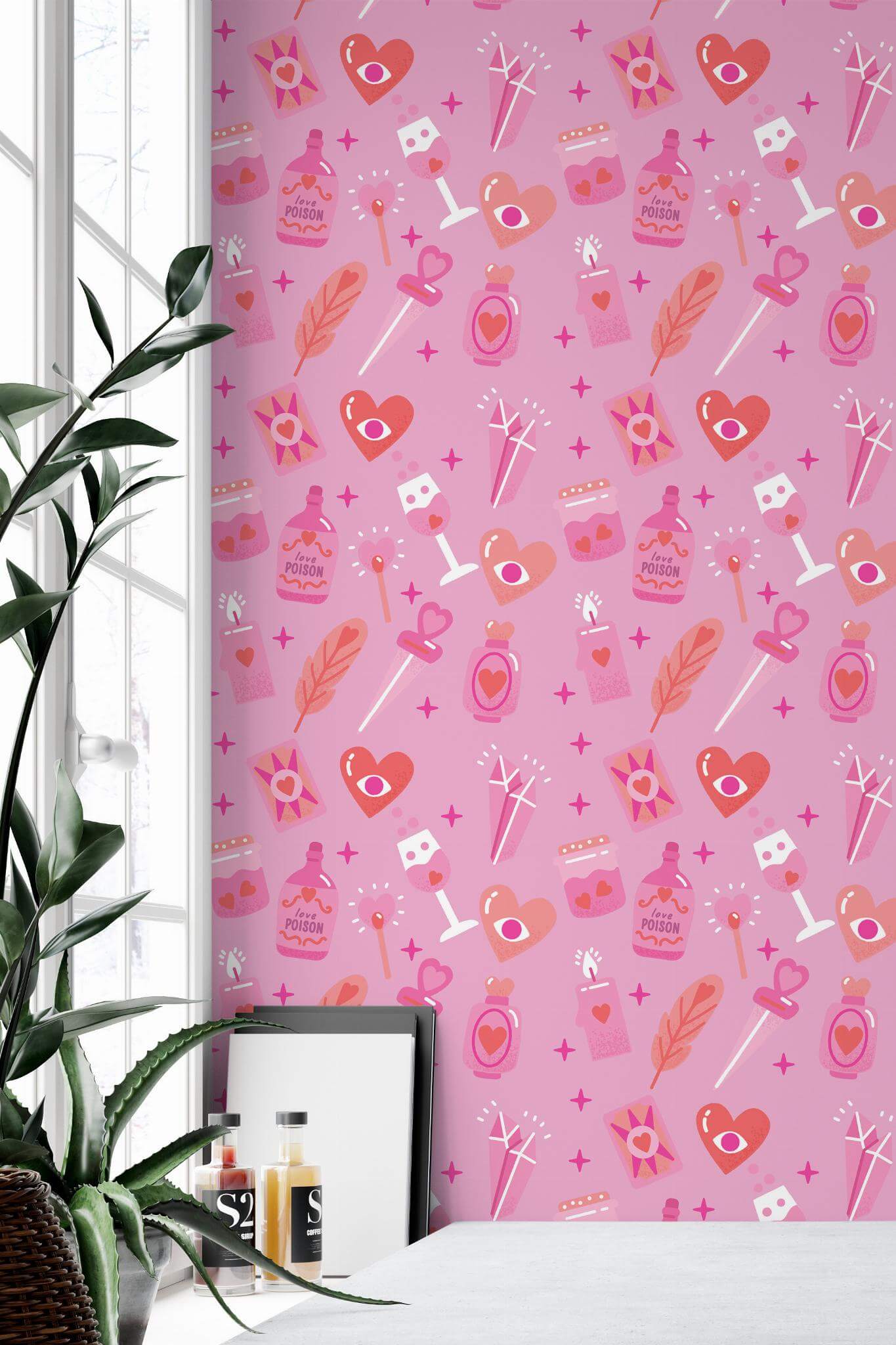 Pink Spellbound wallpaper brings the cute Kawaii style to life with its playful pink palette, perfect for transforming your powder room into a whimsical haven. Adorned with charming motifs like wine glasses, tarot cards, hearts, and love potions, this design adds a touch of magic and romance to any interior, making it equally delightful in bedrooms or small cozy corners. Experience the enchanting world of Pink Spellbound as it casts a spell of fantasy and charm over your home. Available in two options: an easy-to-apply peel and stick version (self-adhesive, removable) and a traditional non-pasted option that requires glue. Choose Pink Spellbound to bring a burst of playful elegance and joy to your living space.