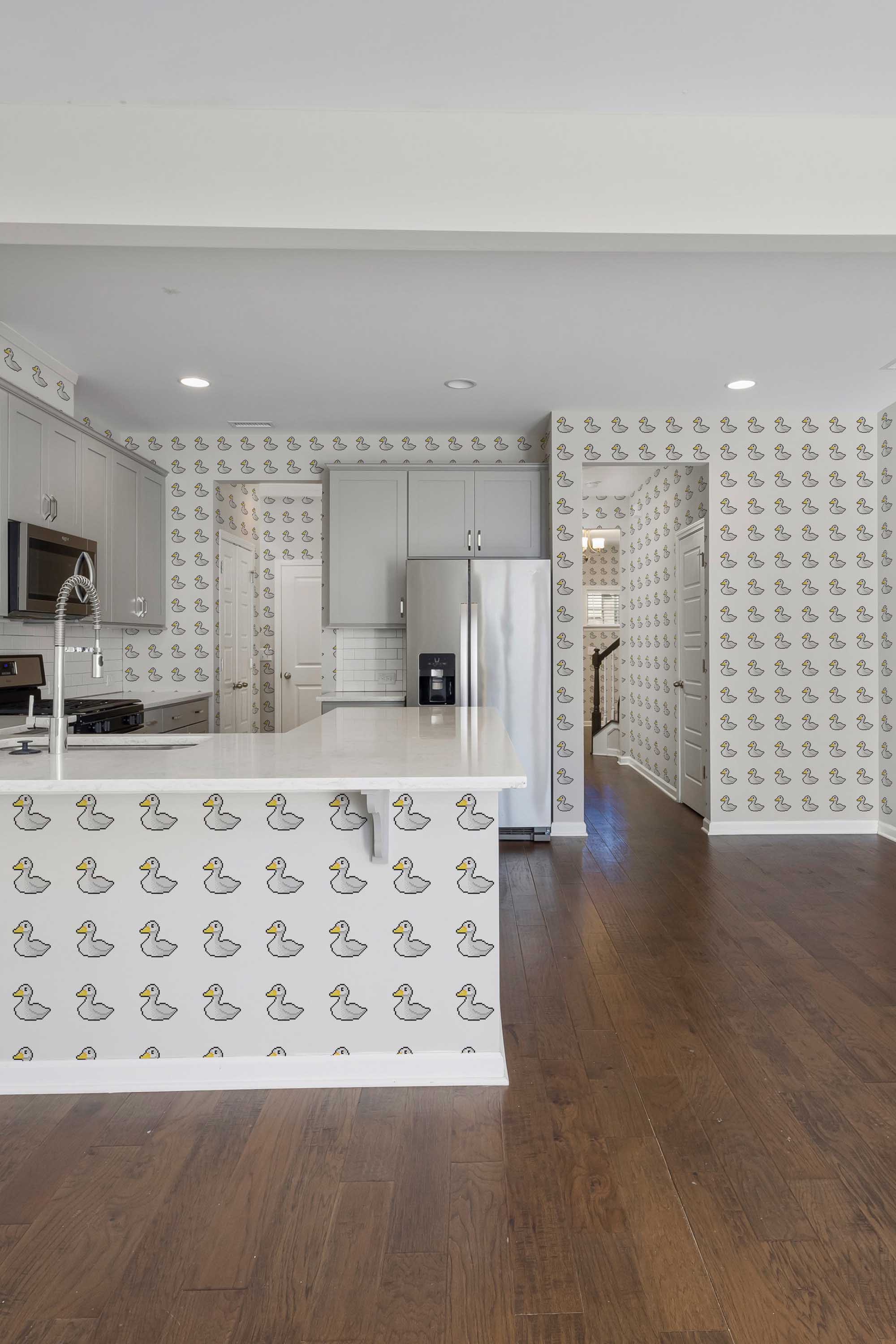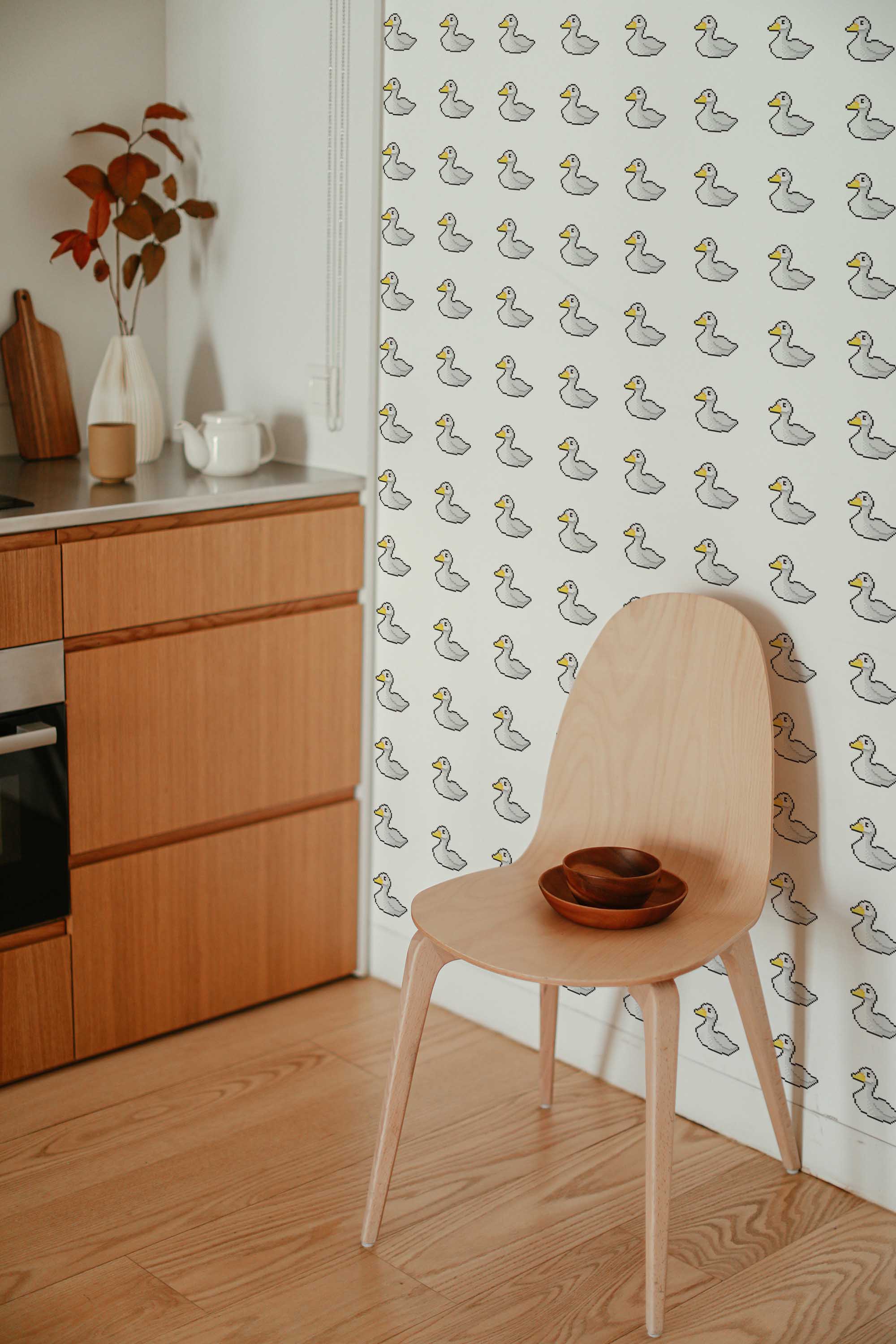 Pixel Quack Wallpaper brings playful kawaii charm to kitchens with tiny pixelated geese arranged in a clean, regular layout on a crisp white background. The simple pixel shapes create a subtle gaming vibe, while the bright base keeps the space light and modern. Moreover, the balanced repeat adds personality without overwhelming cabinets or open shelving, making it perfect for quirky and creative interiors.