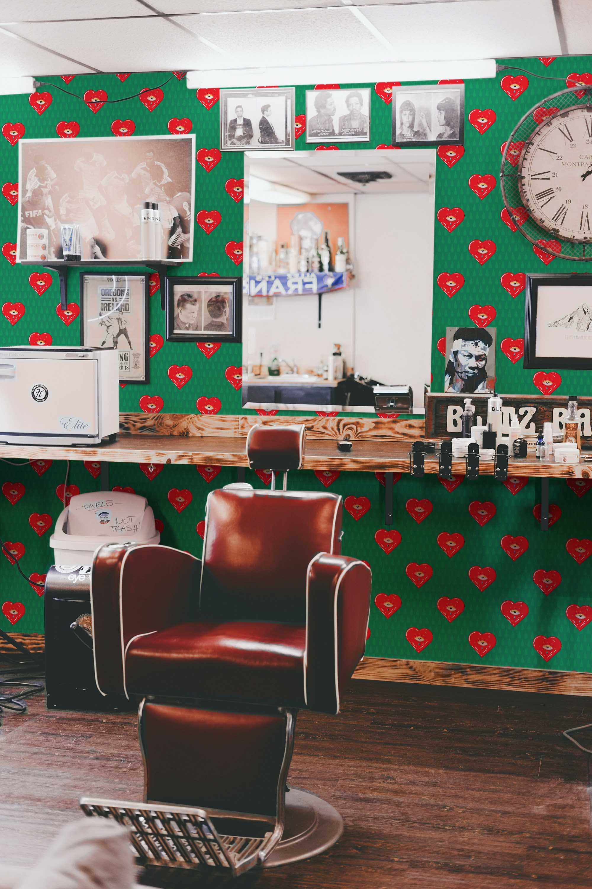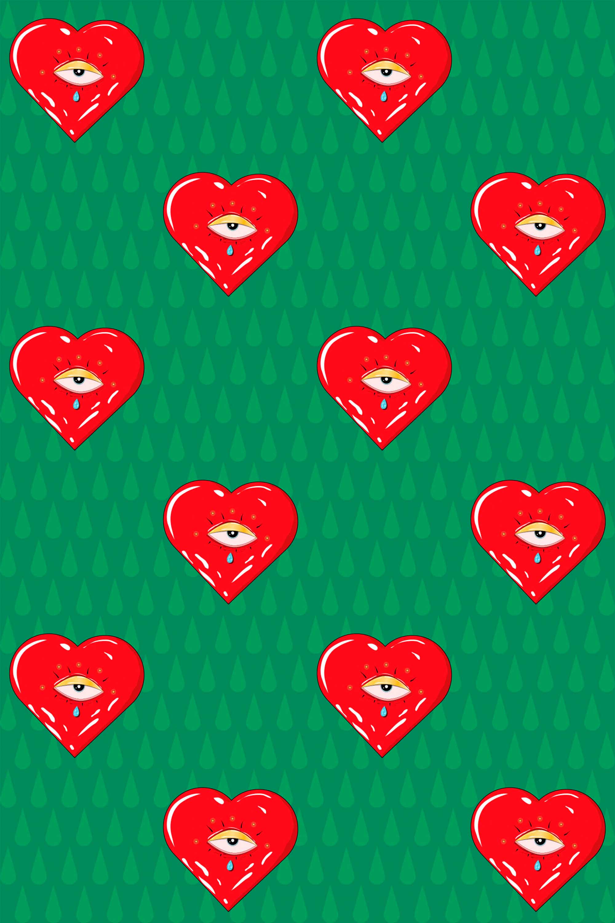 Pop Art Heart Design wallpaper fills creative spaces, bedrooms, or studios with bold fun using red hearts with quirky eyes set against a vivid green background. The playful heart pattern brings a whimsical, love-themed energy that feels lively and expressive without feeling childish.