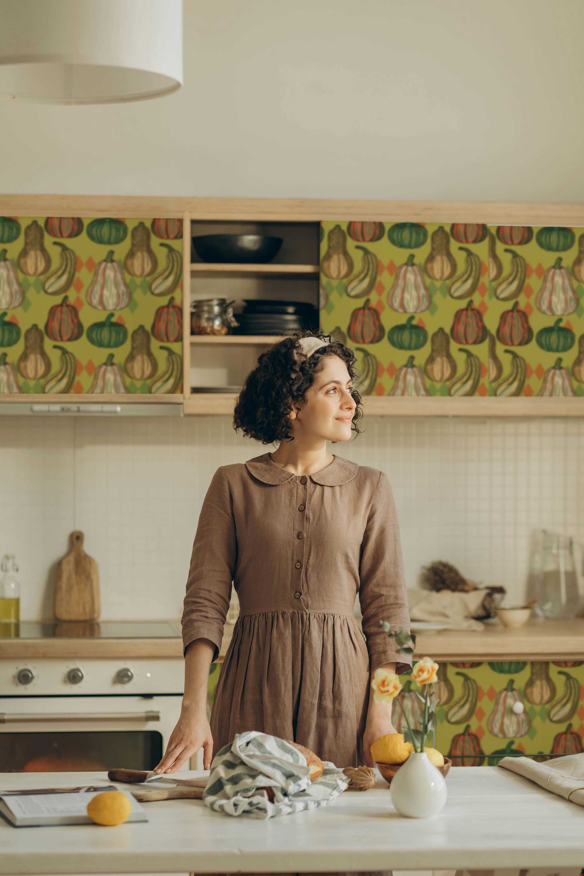 Pumpkin Spiced wallpaper adds farmhouse charm with warm green tones and hand drawn pumpkins that capture a cozy autumn vibe. The rustic repeat blends vintage and retro aesthetics, making it a natural fit for kitchens, dining areas, or even cabinet fronts that need seasonal warmth.