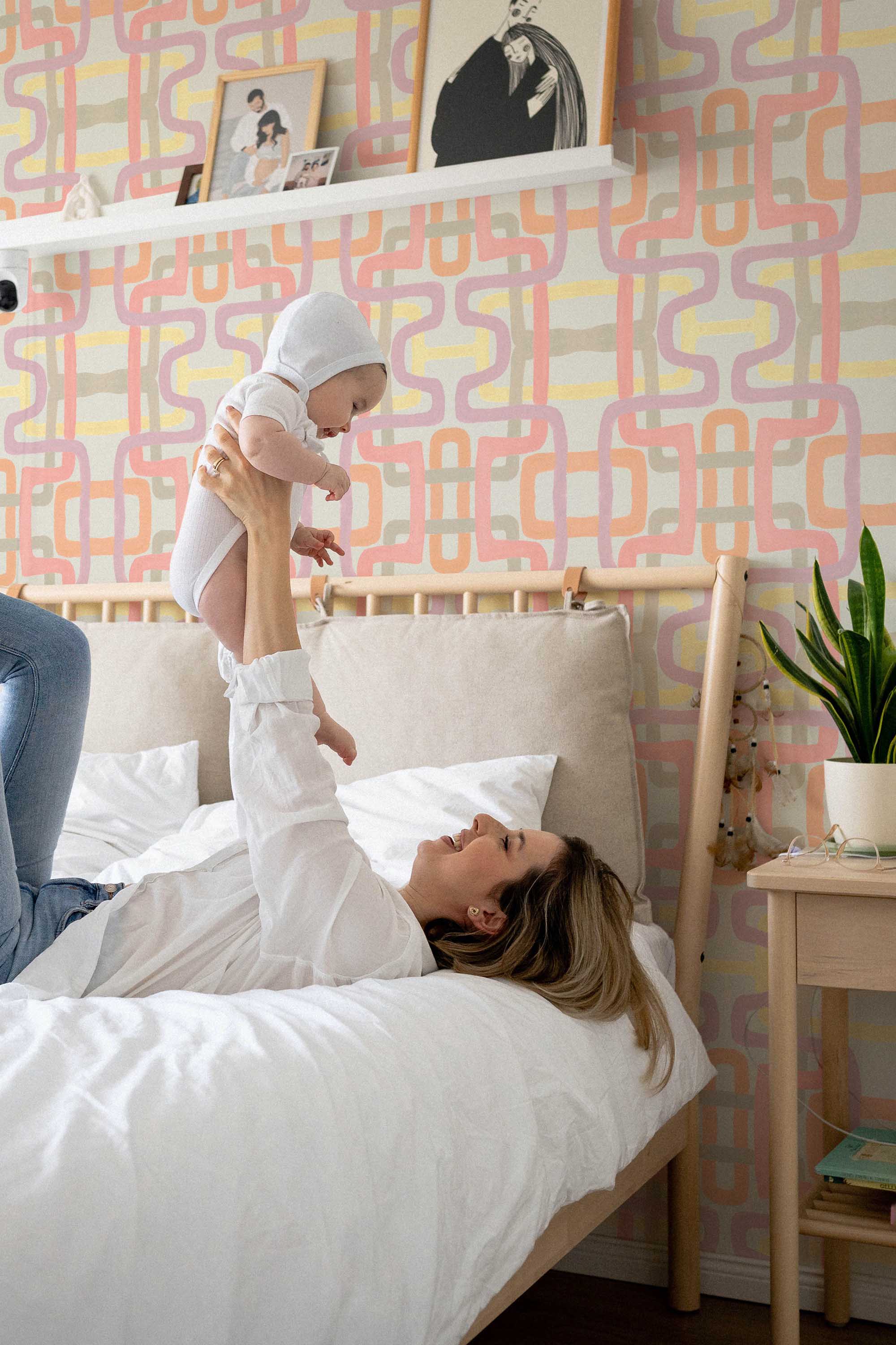 Retro Brush Lines Wallpaper brings a soft, abstract warmth to your space with flowing brushstroke lines in gentle pastel tones. The organic movement creates a calming 70s-inspired mood, making it a beautiful choice for nurseries where soothing color and subtle pattern help shape a peaceful atmosphere. Its smooth rhythm adds visual interest while keeping the room light and comforting.