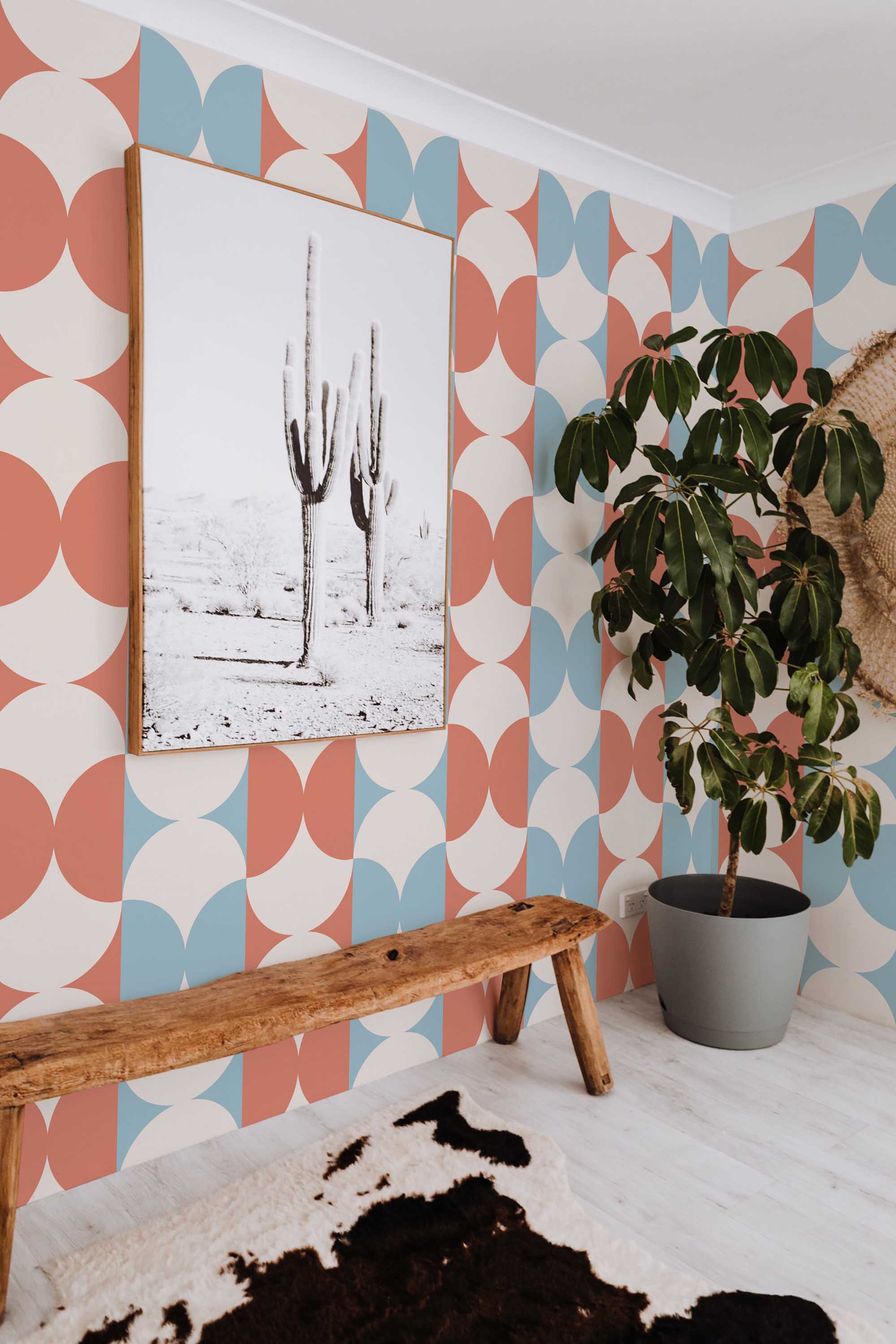 Pastel Geometric retro wallpaper showcases a retro geometric style with a pastel aesthetic, blending cream and terracotta circles into a warm, balanced design ideal for living rooms, bedrooms, or creative spaces. The playful midcentury pattern feels bold yet soft, adding vintage character without overpowering the room. Later in the space, Pastel Geometric retro peel and stick wallpaper installs easily as a removable, self-adhesive, non-pasted solution. Pastel Geometric retro brings harmony and warmth through its carefully balanced geometric rhythm. Printed on eco-friendly, PVC-free materials using GreenGuard Certified inks, this wallpaper is safe for indoor use and ideal for renters or long-term decorating.