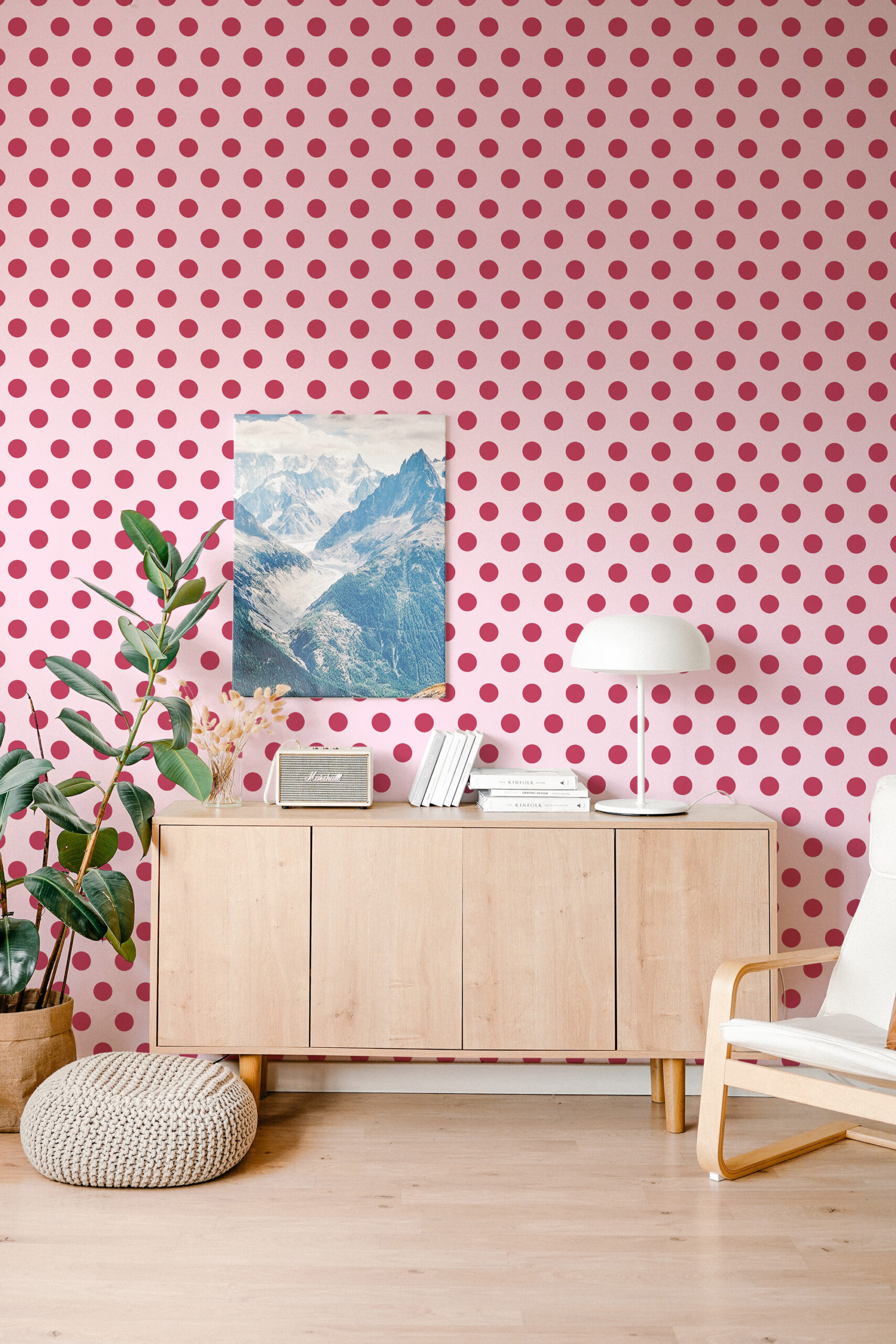 Retro Pink Polka Dot Wallpaper brings a cheerful, classic look to an interior without feeling busy. The evenly spaced dark pink dots flow across the wall in a clean, regular layout that feels playful and tidy at the same time. A light pink background keeps the room bright and soft, while the deeper pink dots add contrast you can see from across the space. It also works well in a kitchen nook, a kids’ room, or a small powder room where you want a simple pop of color.
