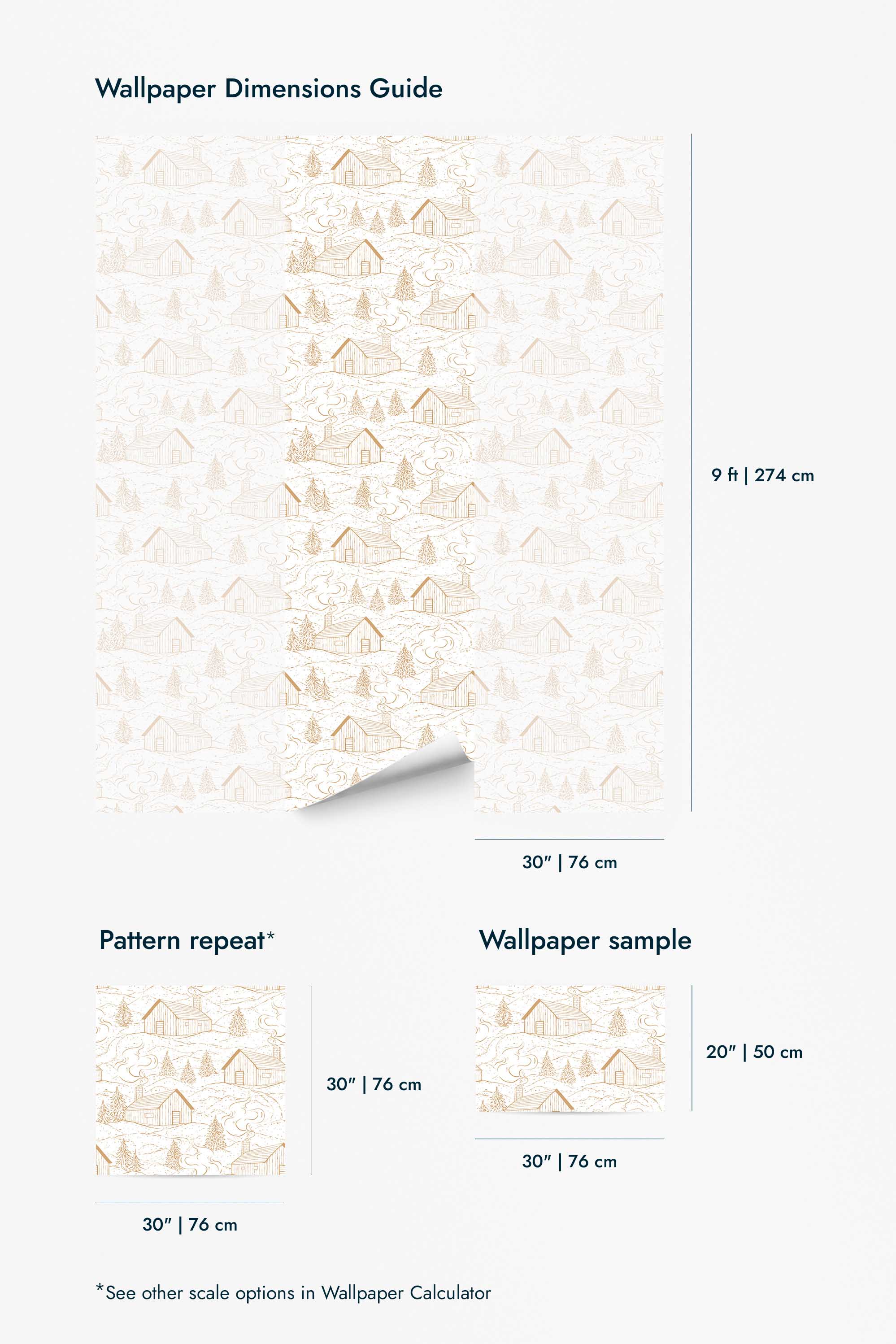 Smokey Cabins Tan wallpaper brings the charming farmhouse style to life with its elegant beige tones and line art pattern, making it a perfect addition to your living room. This delightful toile-inspired design captures the essence of cosy winter cabins nestled in a snowy wonderland, surrounded by majestic pine trees, and can enhance any space with its warm, inviting atmosphere. Created by © Malariny RN from RNM Arts, Smokey Cabins Tan invites the serenity of a winter cottage into your home, complete with fir trees, chimneys, and gently curling smoke.