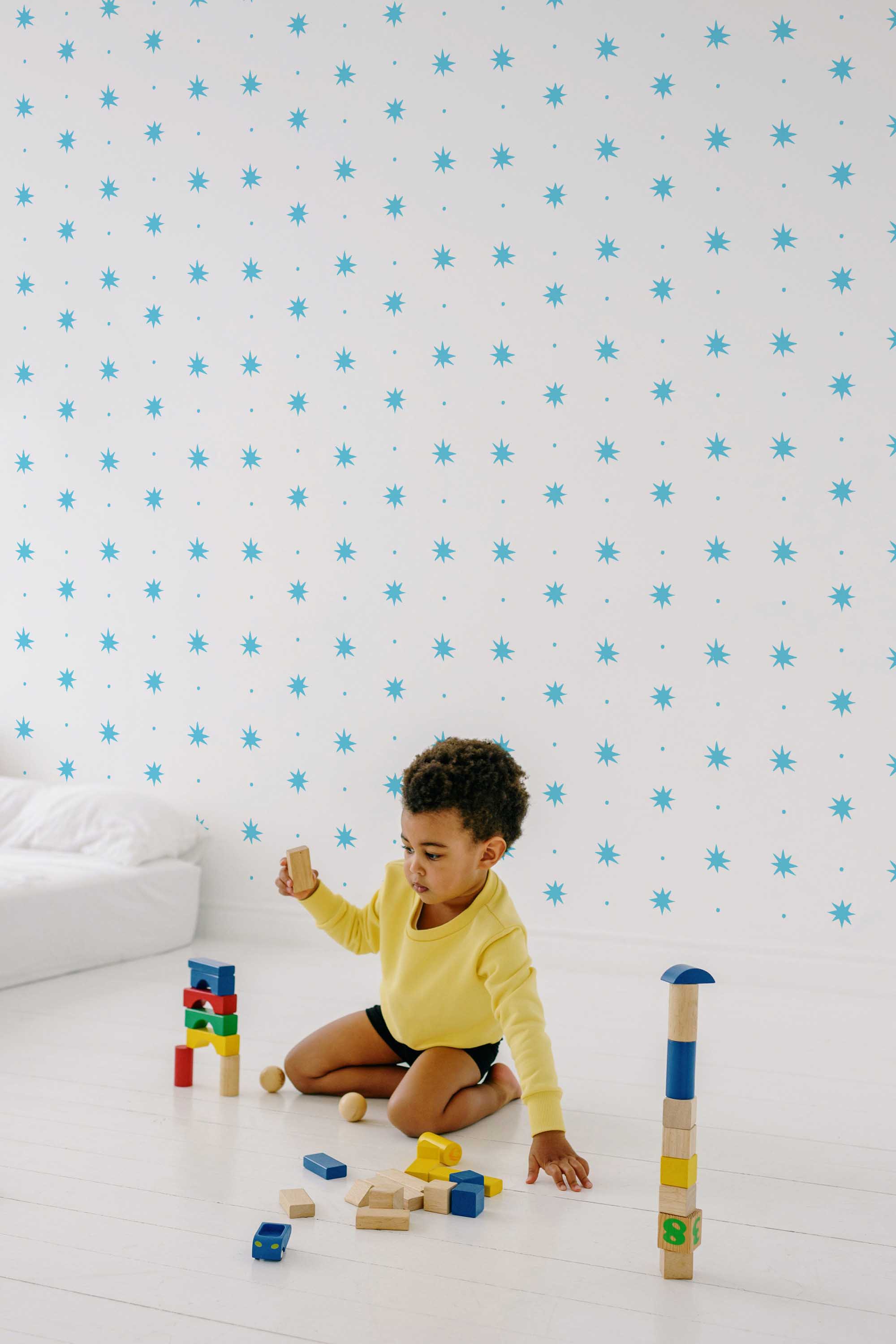 Star Dots Wallpaper brings a dreamy, minimalist charm to kids’ rooms with indigo starbursts and scattered dots on a crisp white background. Moreover, the clean layout keeps the space light and balanced, making it ideal for nurseries and growing children’s rooms.