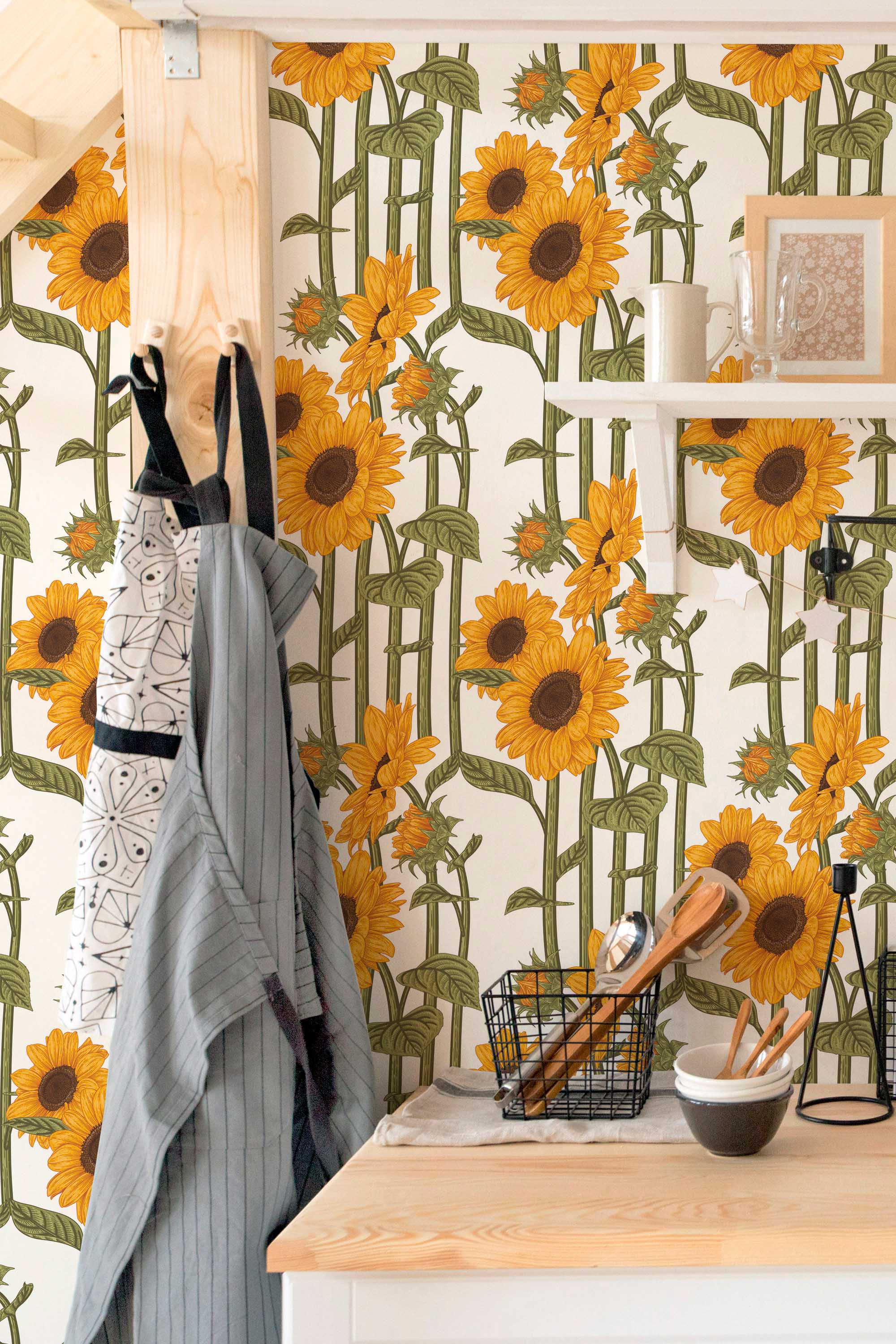 Sunflower Lines wallpaper brings botanical charm to your living room or dining area with tall green stems and soft yellow sunflower blooms arranged in a graceful garden repeat. This aesthetic floral pattern creates a calm yet cheerful mood, inspired by sunflowers standing tall in a summer field. The Sunflower Lines peel and stick wallpaper offers a removable and self-adhesive option for quick refreshes, and it is also available as non-pasted for a classic paste-the-wall method. Sunflower Lines pairs detailed petals and slender lines to form a balanced botanical statement that feels fresh and natural. Printed on eco-friendly, PVC-free materials using GreenGuard Certified inks, this wallpaper is safe for indoor use and ideal for renters or long-term decorating.