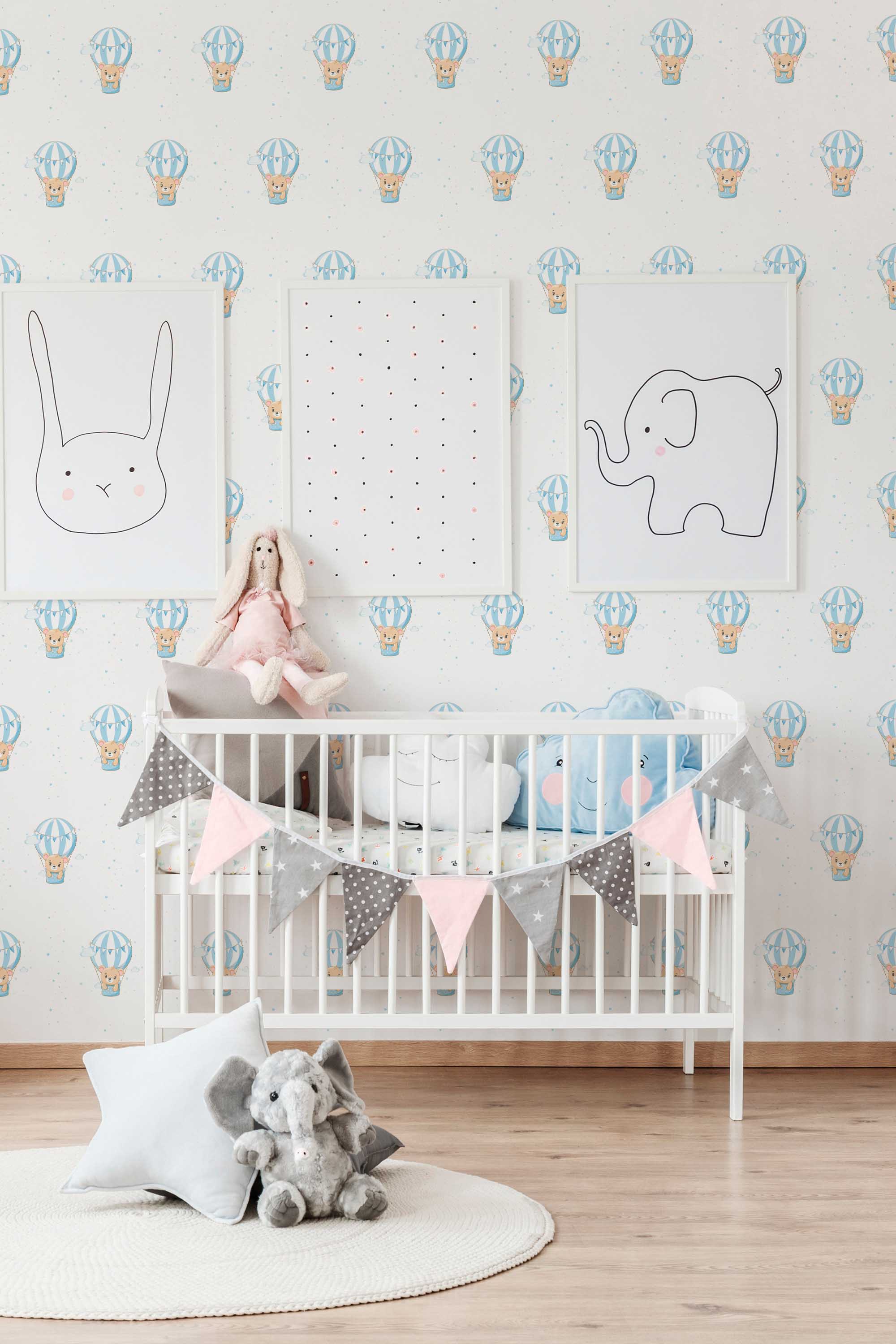 Teddy Air Balloon Wallpaper brings a dreamy boho charm to your nursery with adorable teddy bears floating in soft blue and white hot-air balloons. The gentle colors and sweet illustrations create a calming, storybook atmosphere that feels whimsical and soothing. Its playful details add warmth and imagination, making it a beautiful choice for spaces designed to feel safe, cozy, and full of wonder.